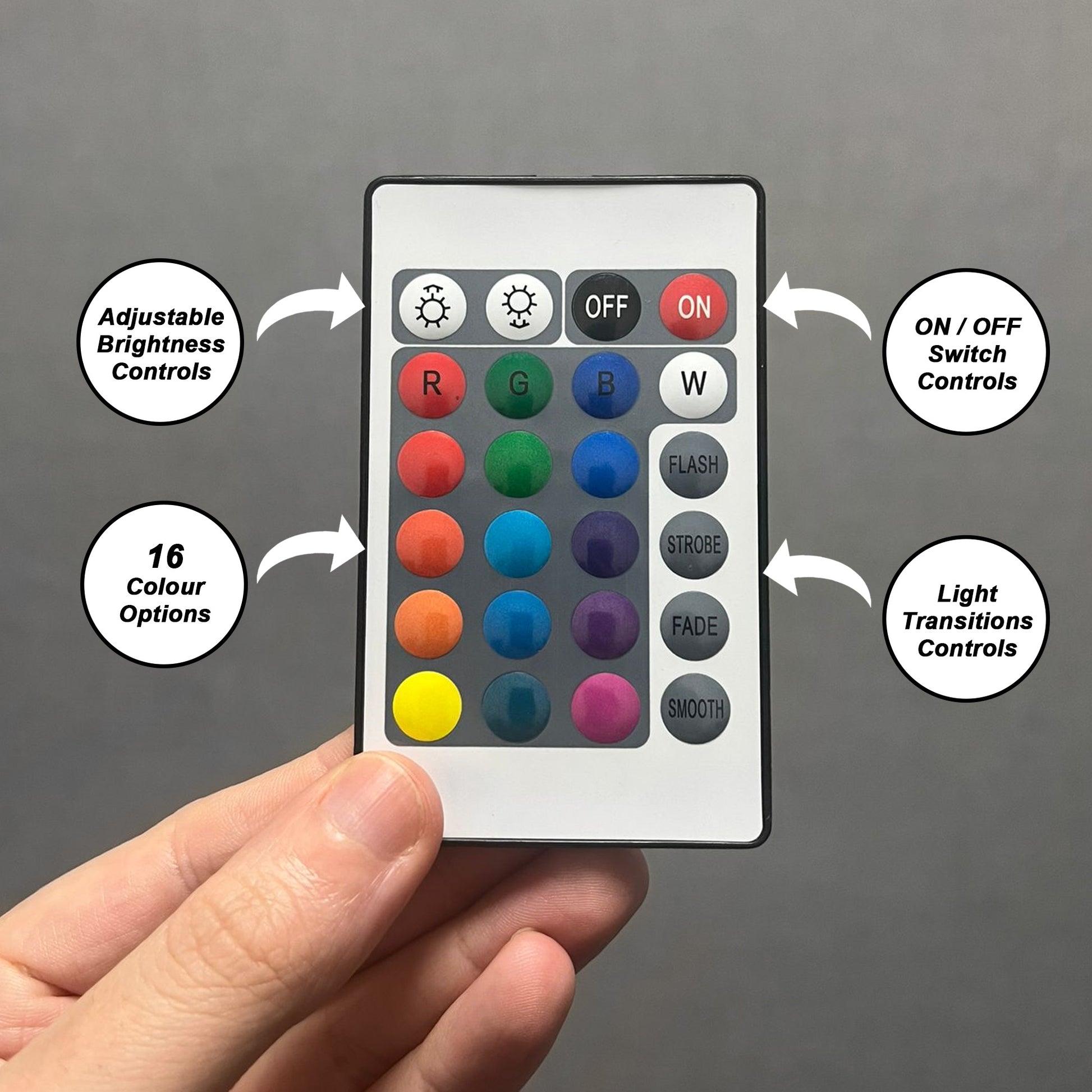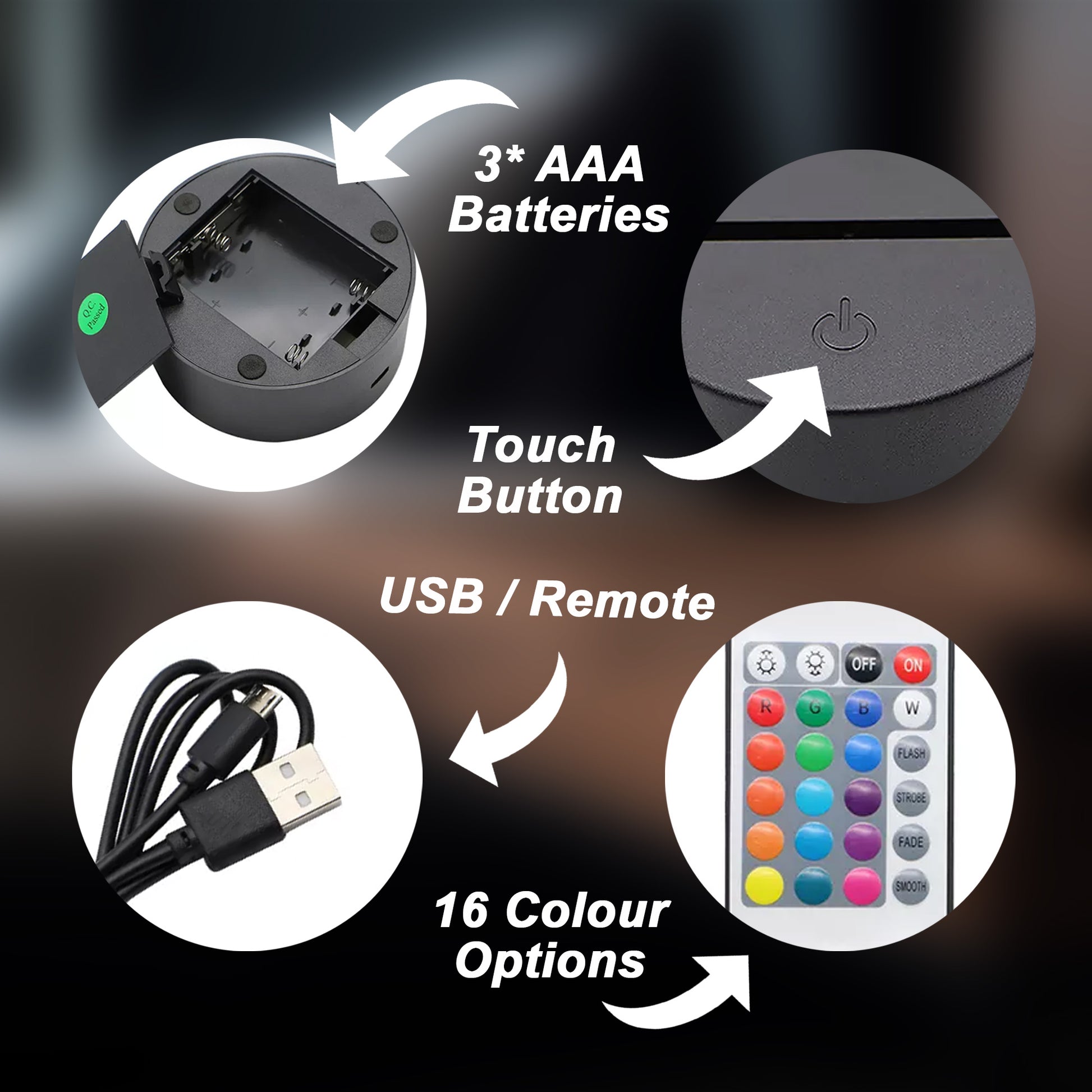 The plaque is made from high quality acrylic, which will last for years to come. The design is printed onto the plaque, paying close attention to fine details and finishing. The plaque is supplied with an LED base and you can use either the USB or battery option so the light can be free standing on a shelf or desk. The LED Base needs 3 x AAA Batteries (not included). The remote comes with a battery inside.