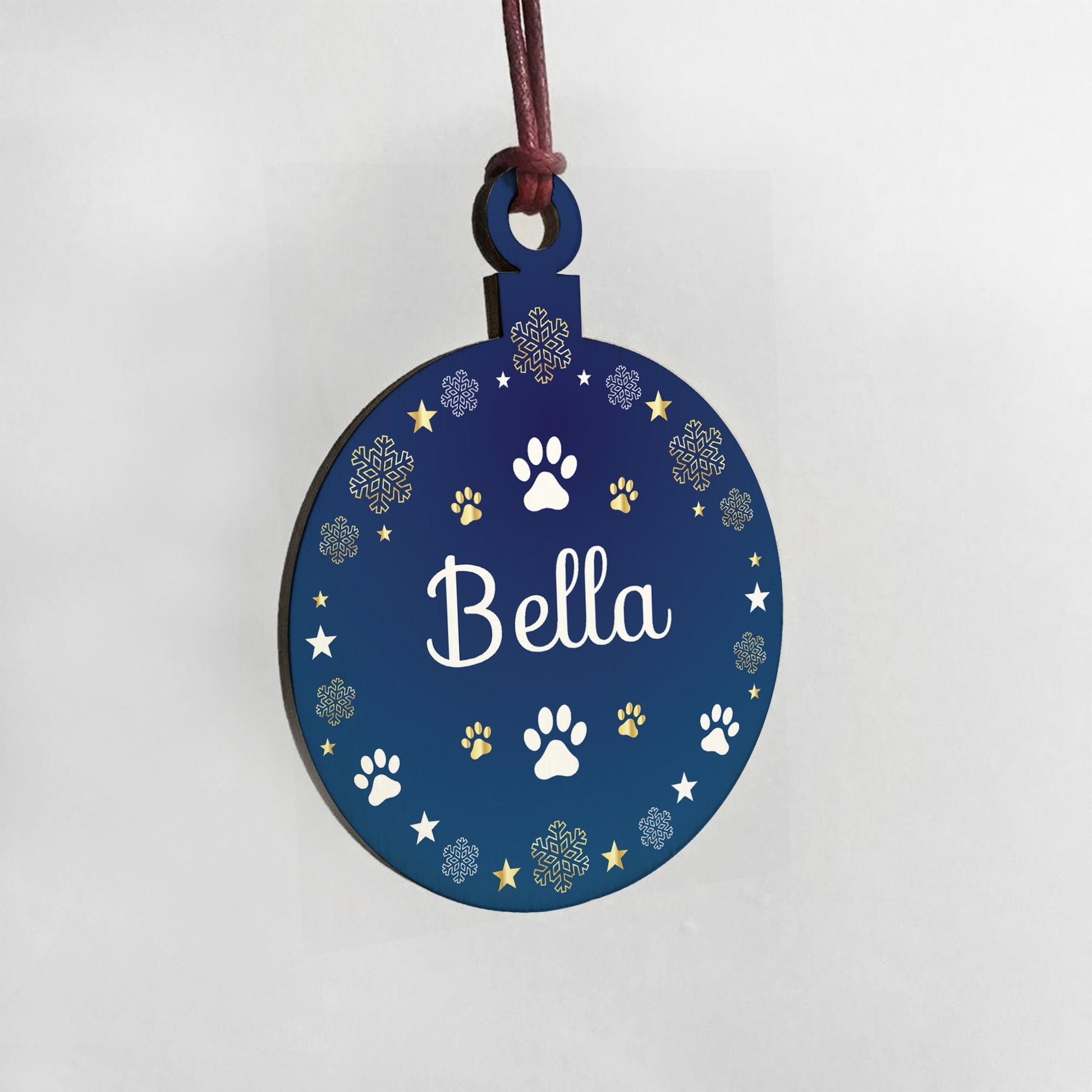 The bauble is made from real wood, and the design is permanently printed into the wood. The wooden bauble is supplied with waxed cotton rope in both black and red colours to allow easy hanging and looks great in any room of the house.