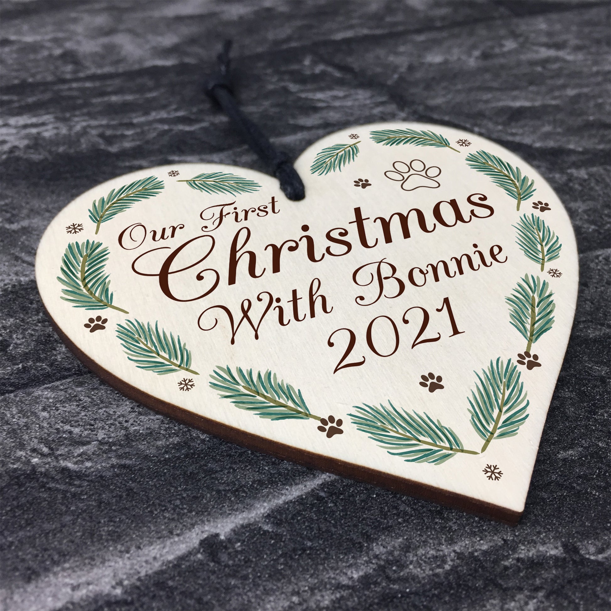 1st Christmas With Dog Puppy Wood Heart Bauble Personalised
