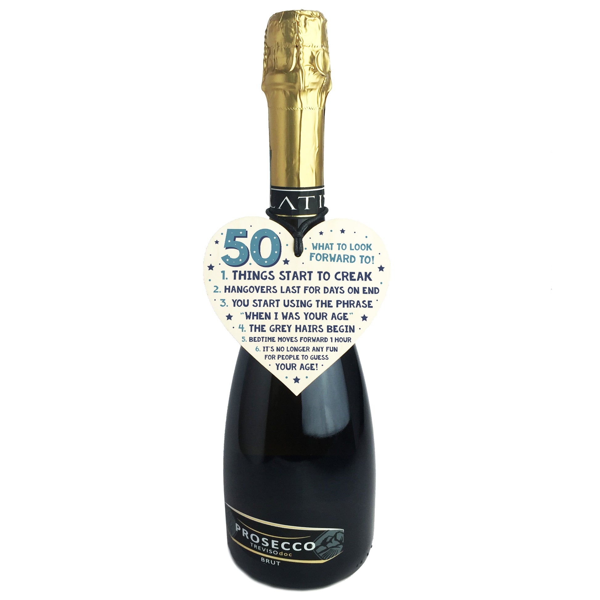 But that's not all - this set also includes a beautifully crafted wooden heart, printed with the message "50 WHAT TO LOOK FORWARD TO! 1.THINGS START TO CREAK 2. HANGOVERS LAST FOR DAYS ON END 3. YOU START USING THE PHRASE "WHEN I WAS YOUR AGE" 4. THE GREY HAIRS BEING 5.BEDTIME MOVES FORWARD 1 HOUR 6. IT'S NO LONGER ANY FUN FOR PEOPLE TO GUESS YOUR AGE!". Measuring approximately 10cm x 10cm, this heart is the perfect size to display in your loved one's room as a reminder of their special day.
