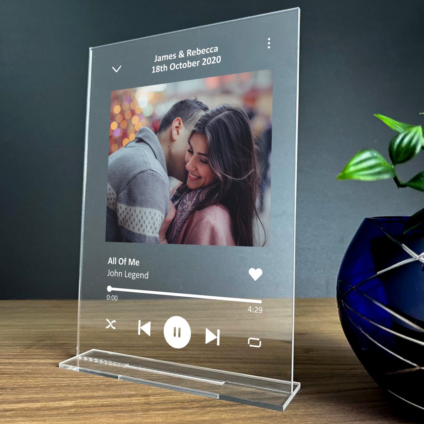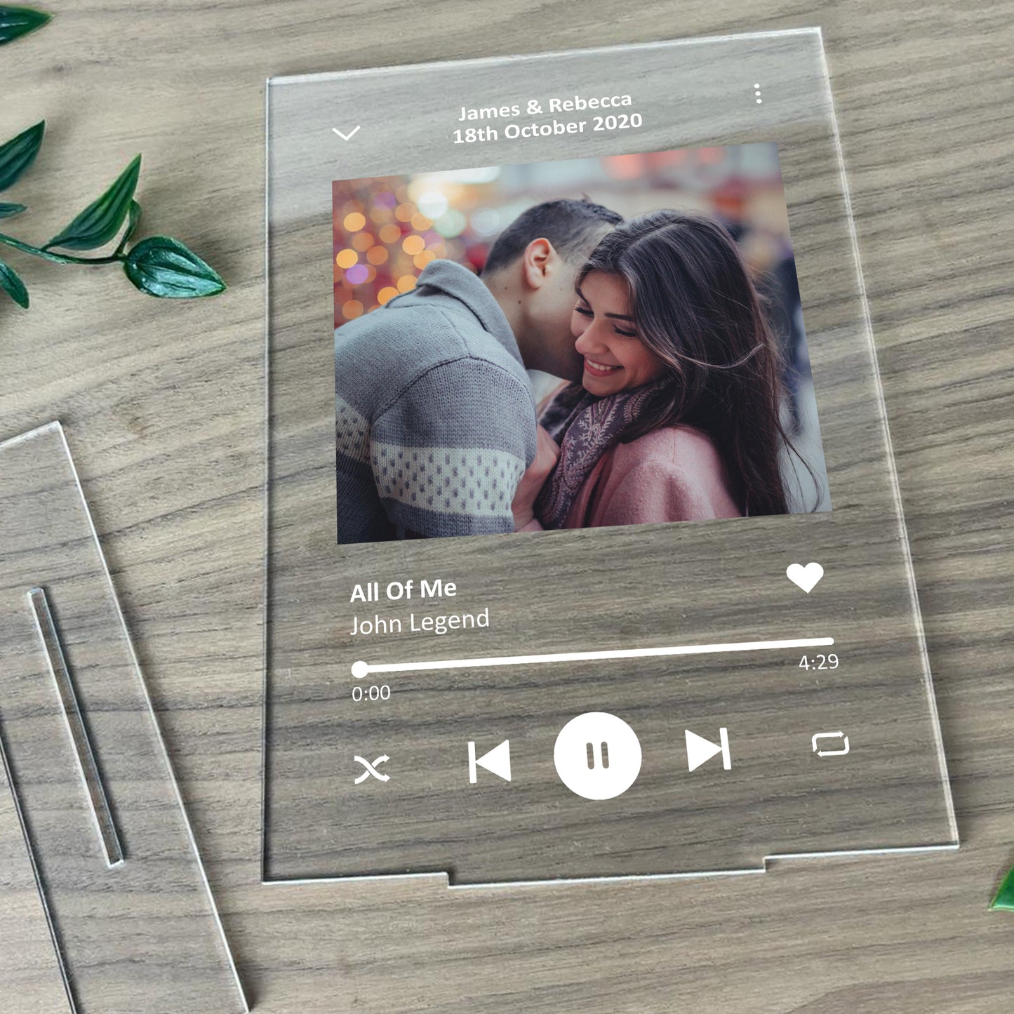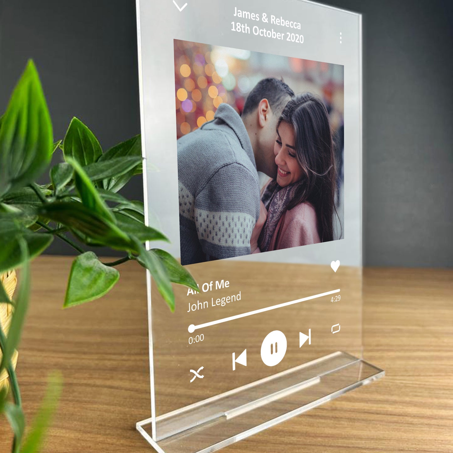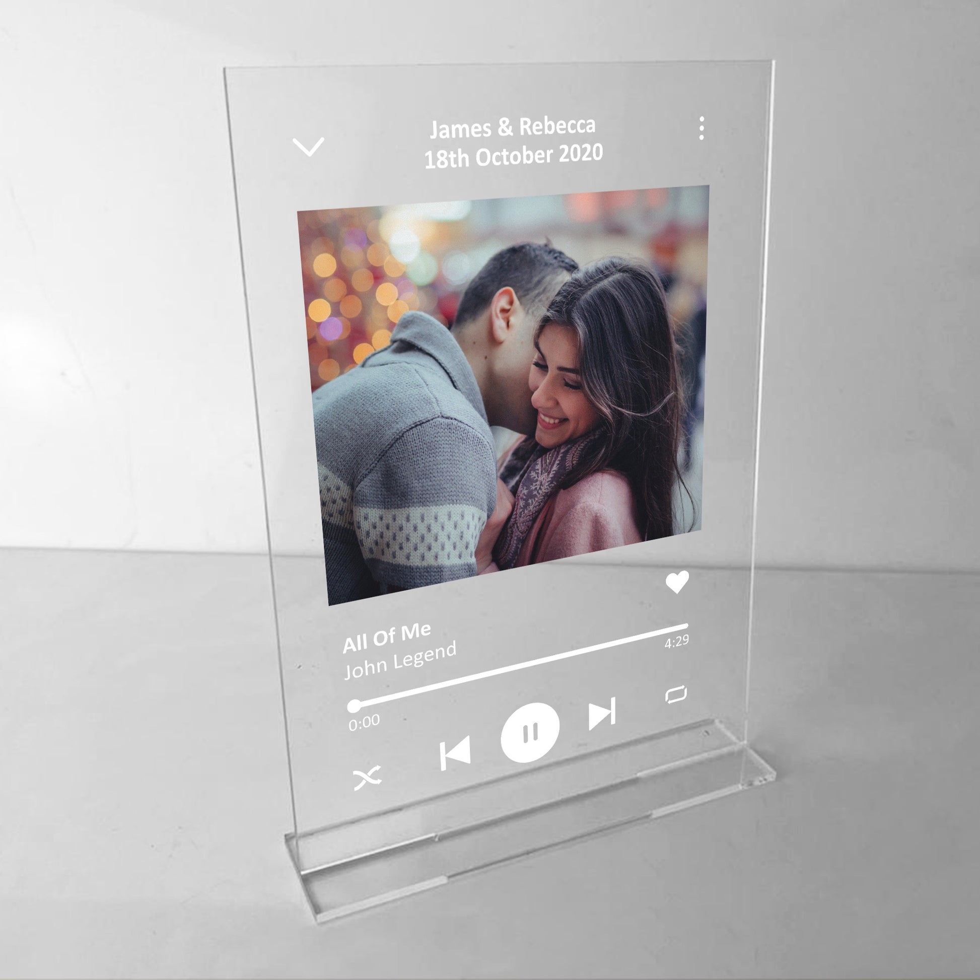 A Beautifully Printed A5 Personalised Clear Acrylic standing plaque with a photo, song name and artist name of your choice. Give this gift with love to your partner and put a smile their face when they receive this and can put it up in their home. A perfect sentimental gift of your favourite song! This gorgeous plaque makes an amazing Anniversary / Valentines Day / Christmas gift but is also a great gift anytime of the year. Supplied with a stand, a beautiful keepsake that will be treasured for years to come.