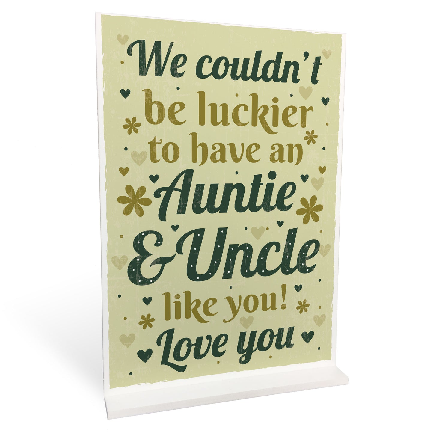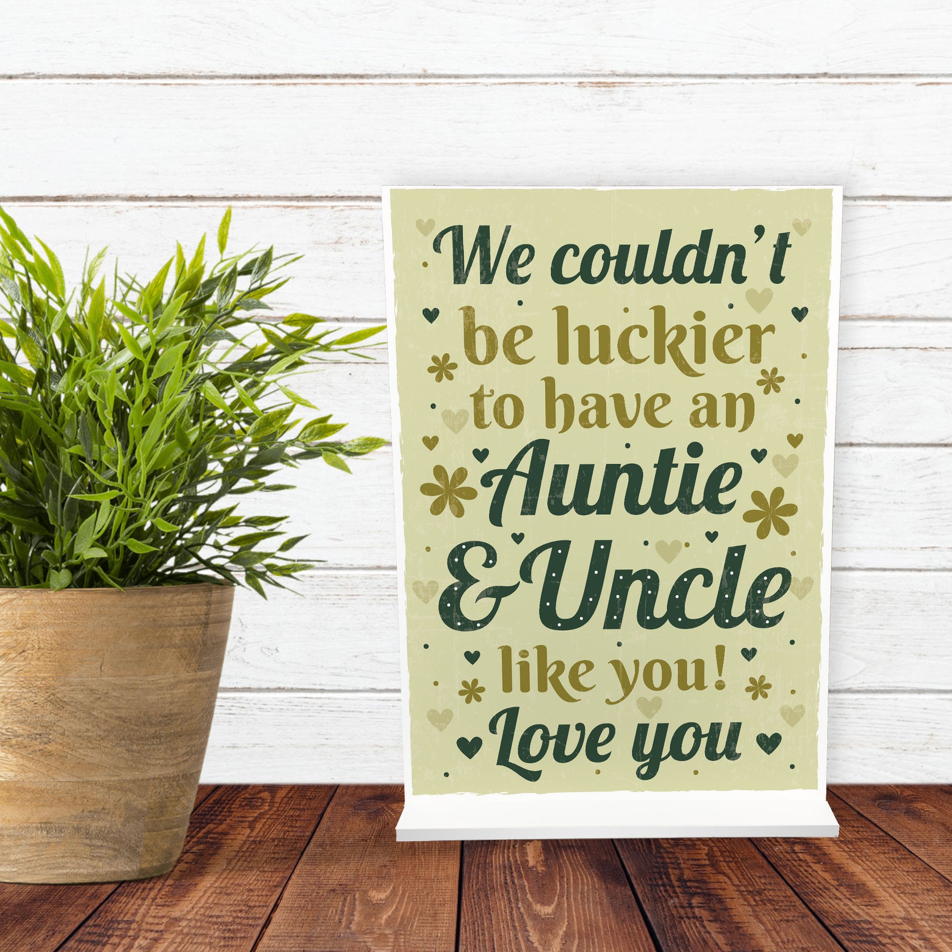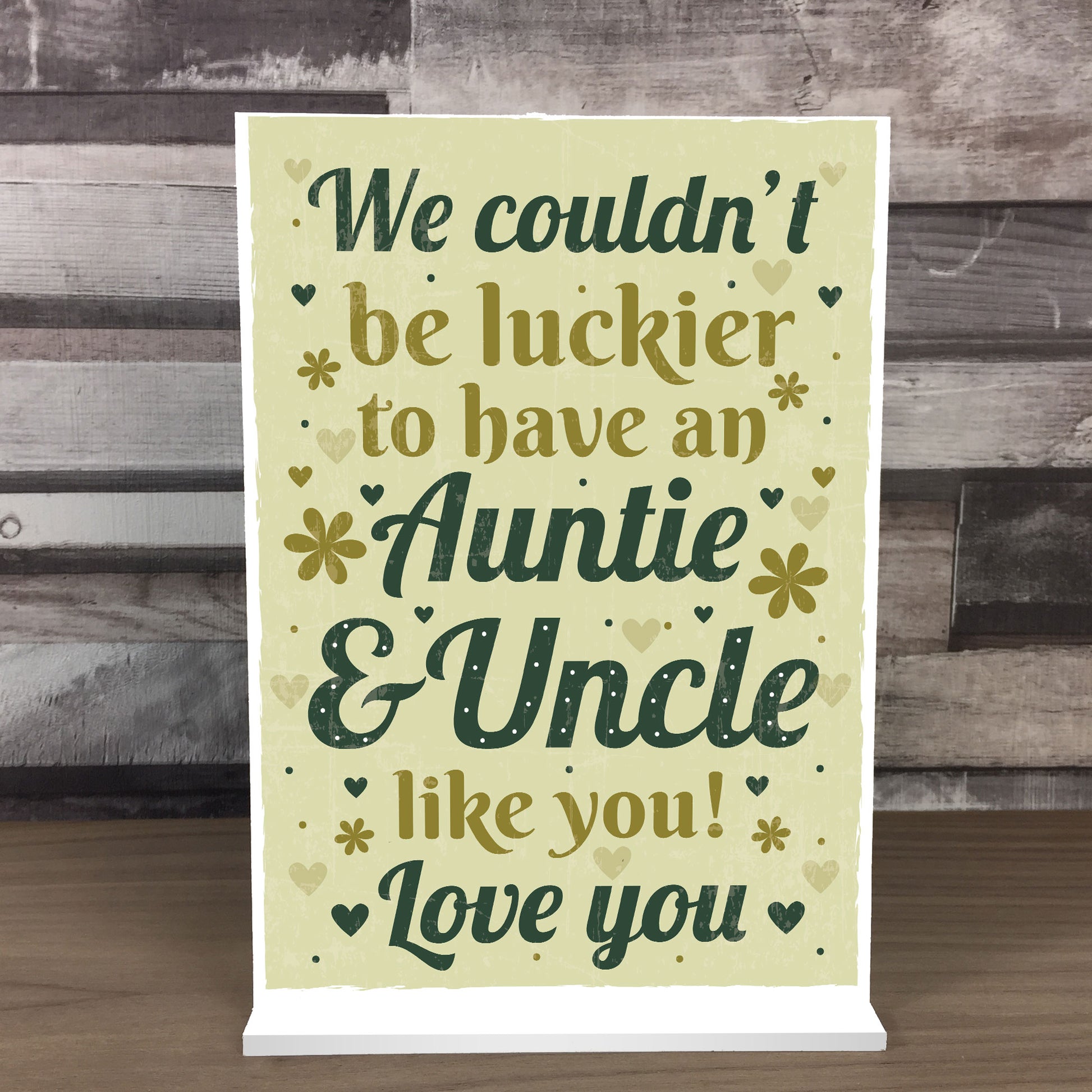 This plaque will look great standing on a shelf or in any part of the house. Give this gift with love to your auntie / uncle and put a smile on their face letting them know of your love every time they read it. This gorgeous plaque makes an amazing Birthday or Christmas gift but is also a great gift anytime of the year. Supplied with a stand, a beautiful keepsake that will be treasured for years to come.