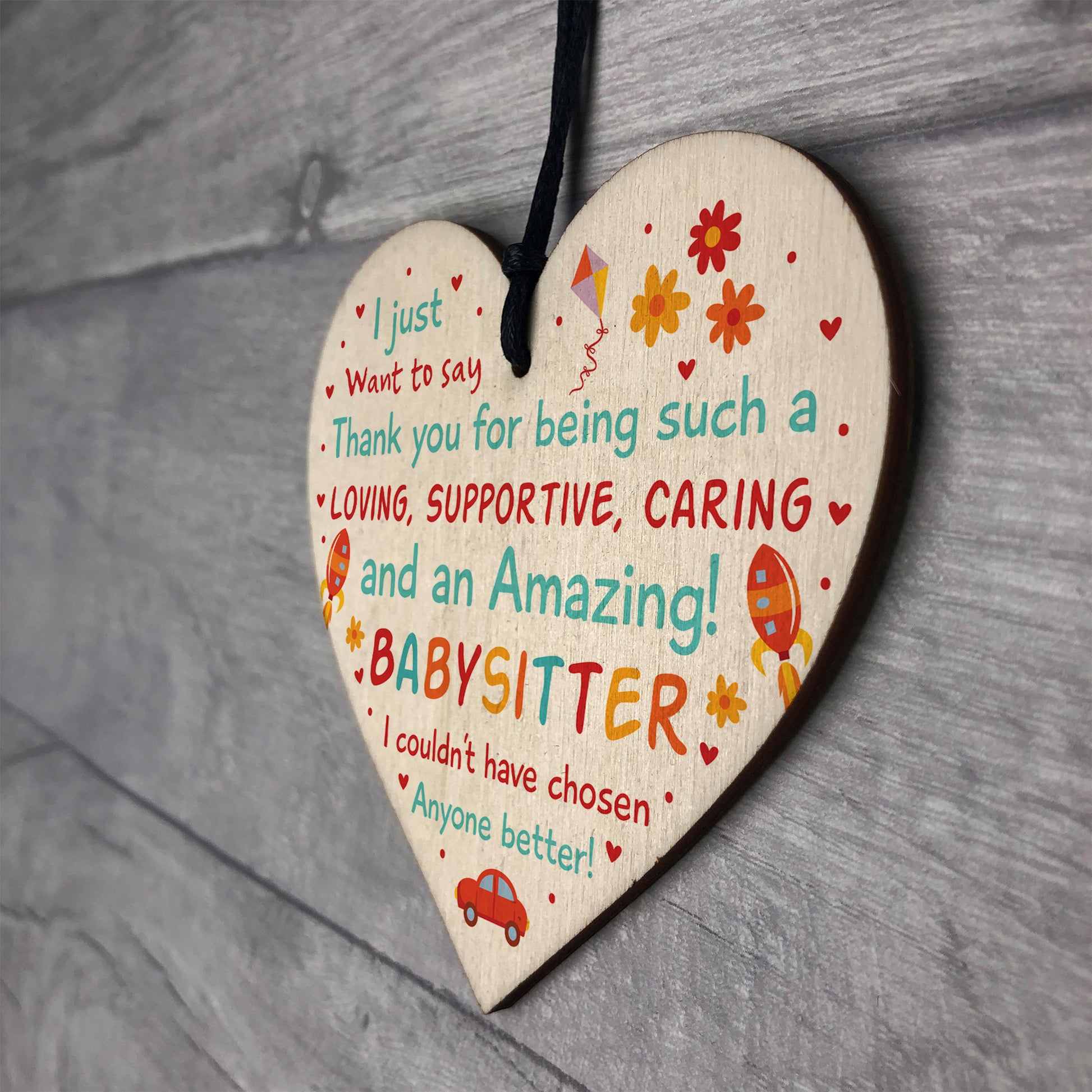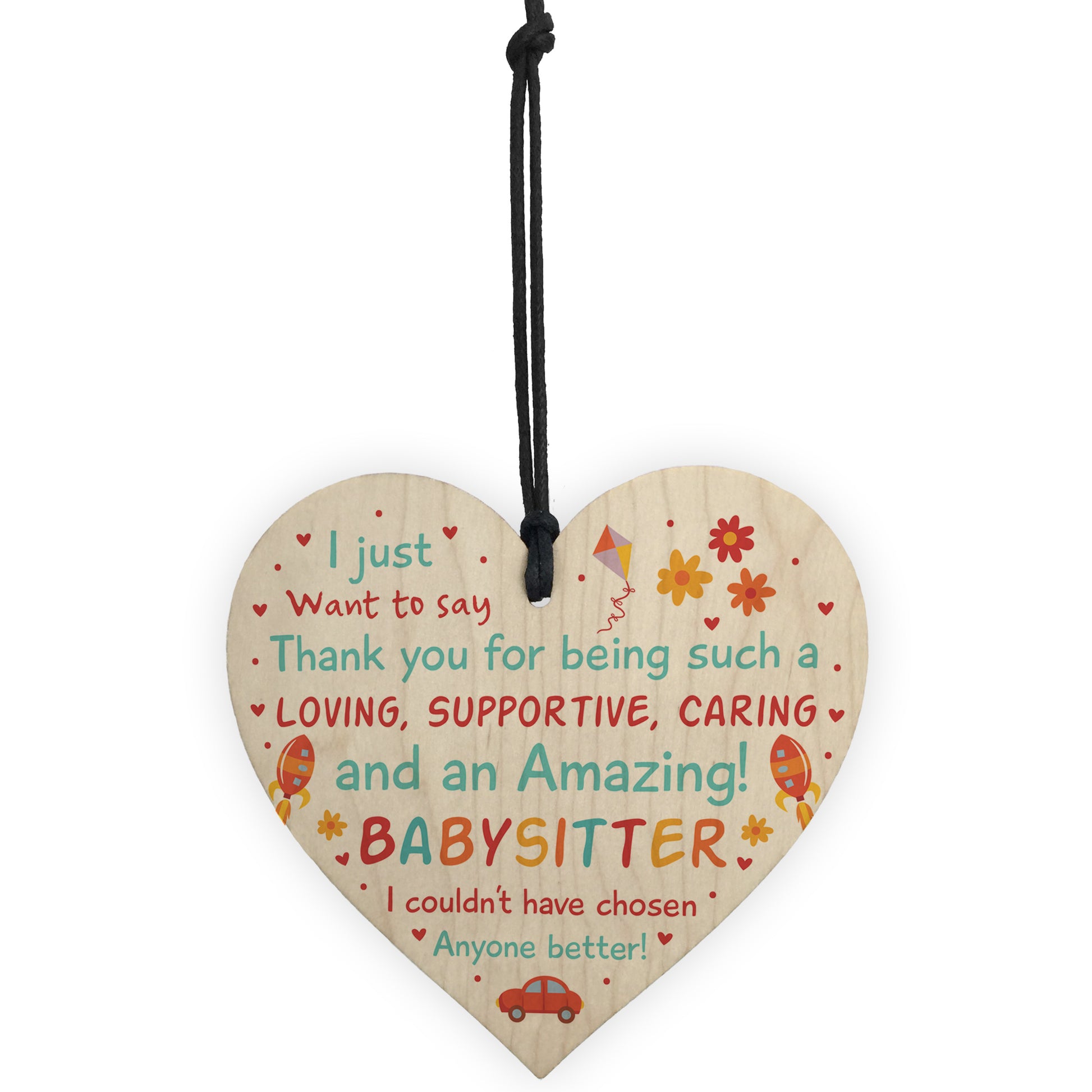 A gorgeous wooden heart plaque printed with a lovely heartfelt message to say a big thank you to your babysitter / childminder for looking after your child. Give this gift with love and put a smile on your babysitter's face every time they read it.