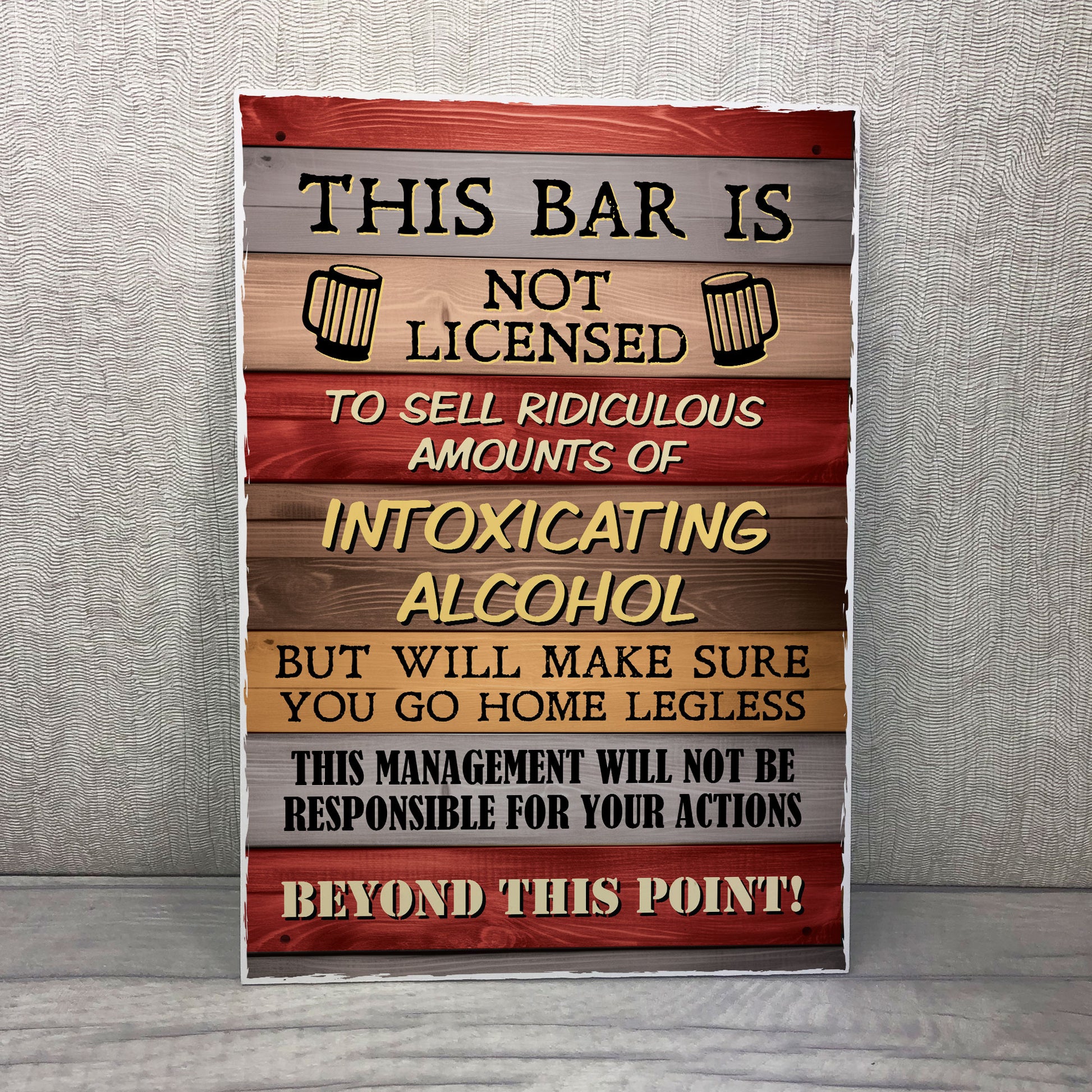 The ultimate multi-coloured funny un-lincensed bar sign with a funny message for anyone that enters your home bar. Add some character and fun to your home bar or garden bar. This awesome plaque makes an amazing Birthday or Christmas gift but is also a great gift anytime of the year. Supplied ready to hang and with holes for screws, a beautiful keepsake that will be treasured for years to come.