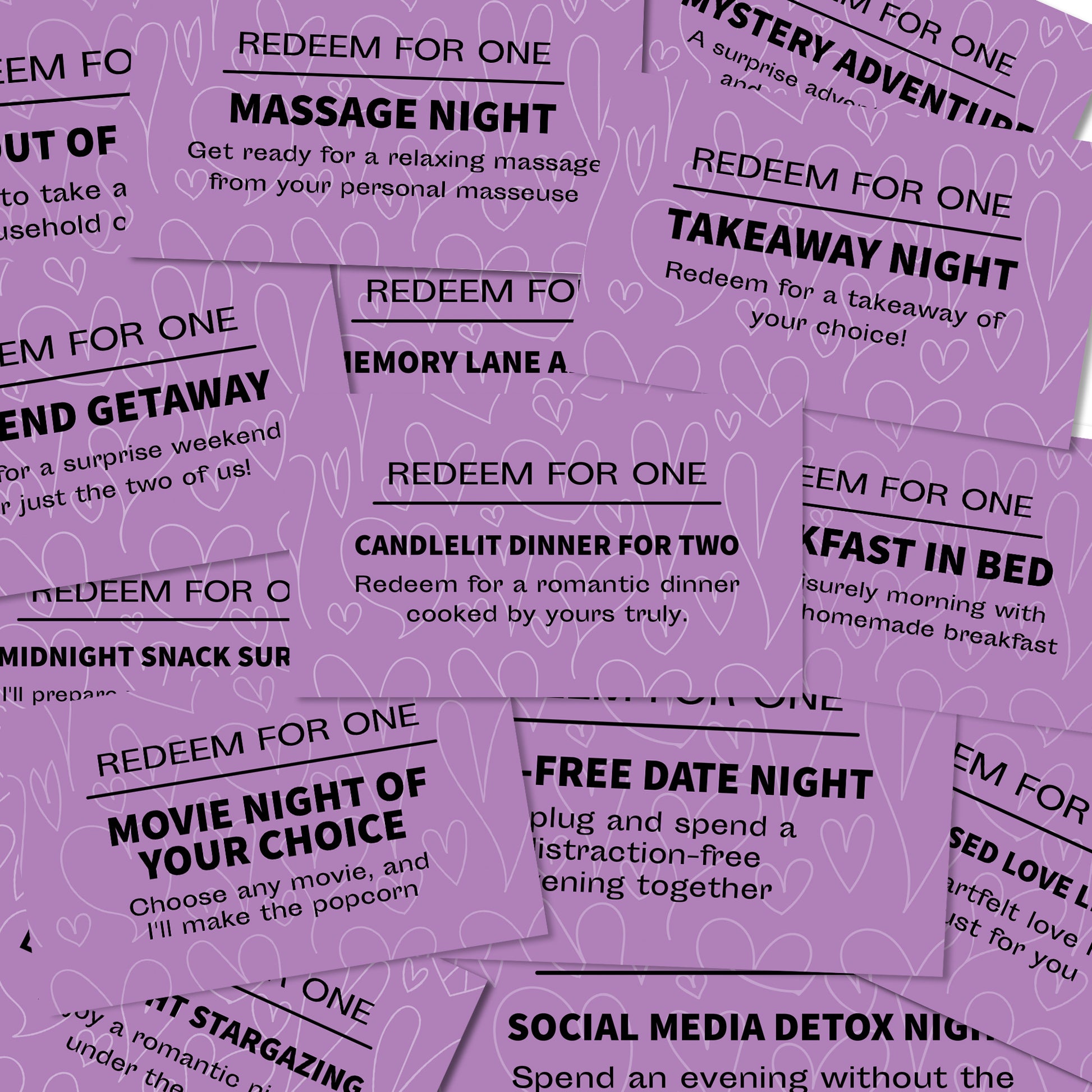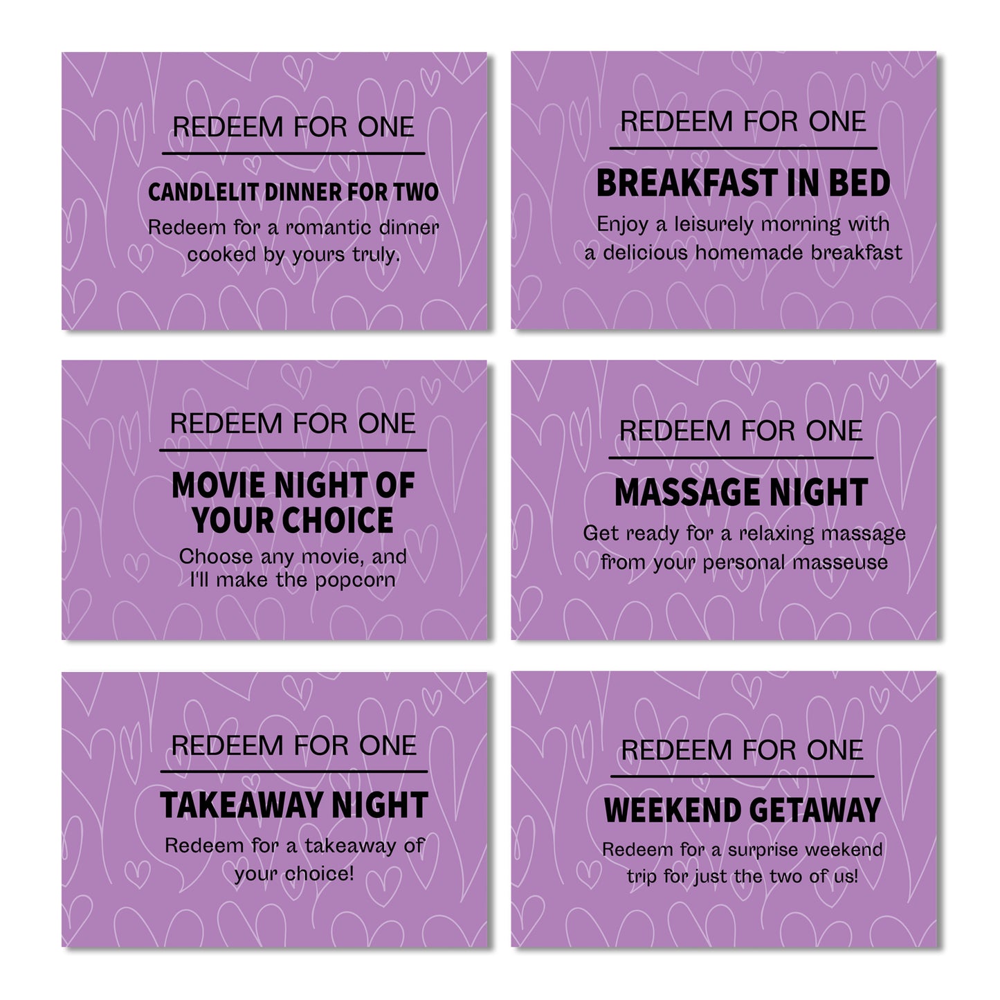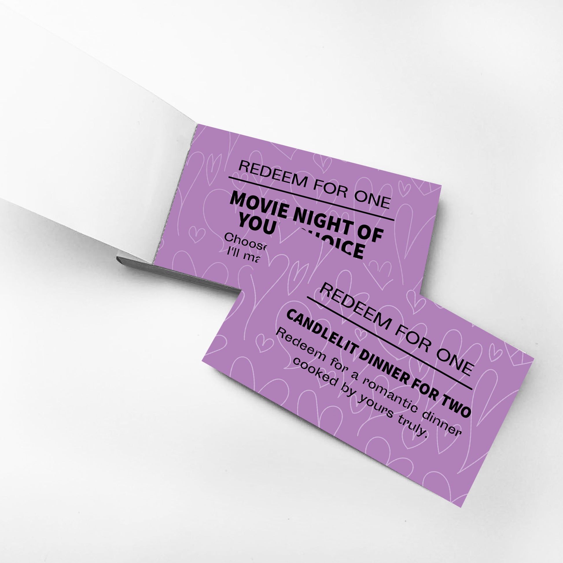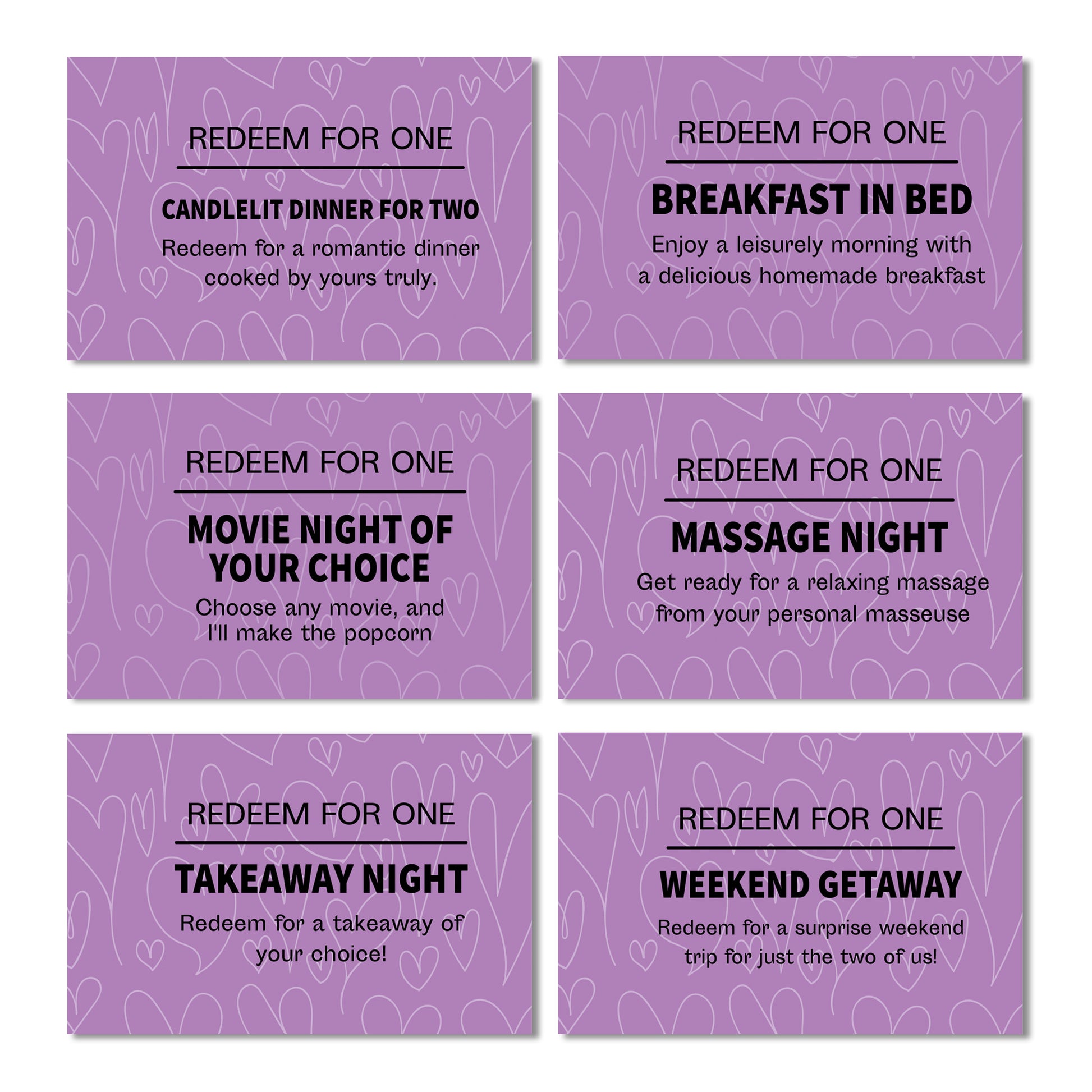 Each coupon within this charming booklet holds the promise of a unique and unforgettable experience. Imagine surprising your partner with a romantic candlelit dinner, a spontaneous picnic under the stars, a cozy movie night at home, or an exhilarating outdoor adventure. Our coupon book offers a delightful array of options, ensuring there's something for every taste and preference.