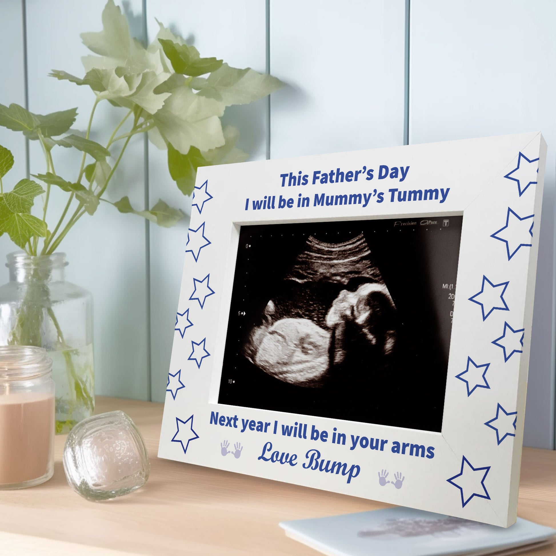 The frame reads "This Father's Day I will be in Mummys Tummy Next year I will be in your arms love bump"