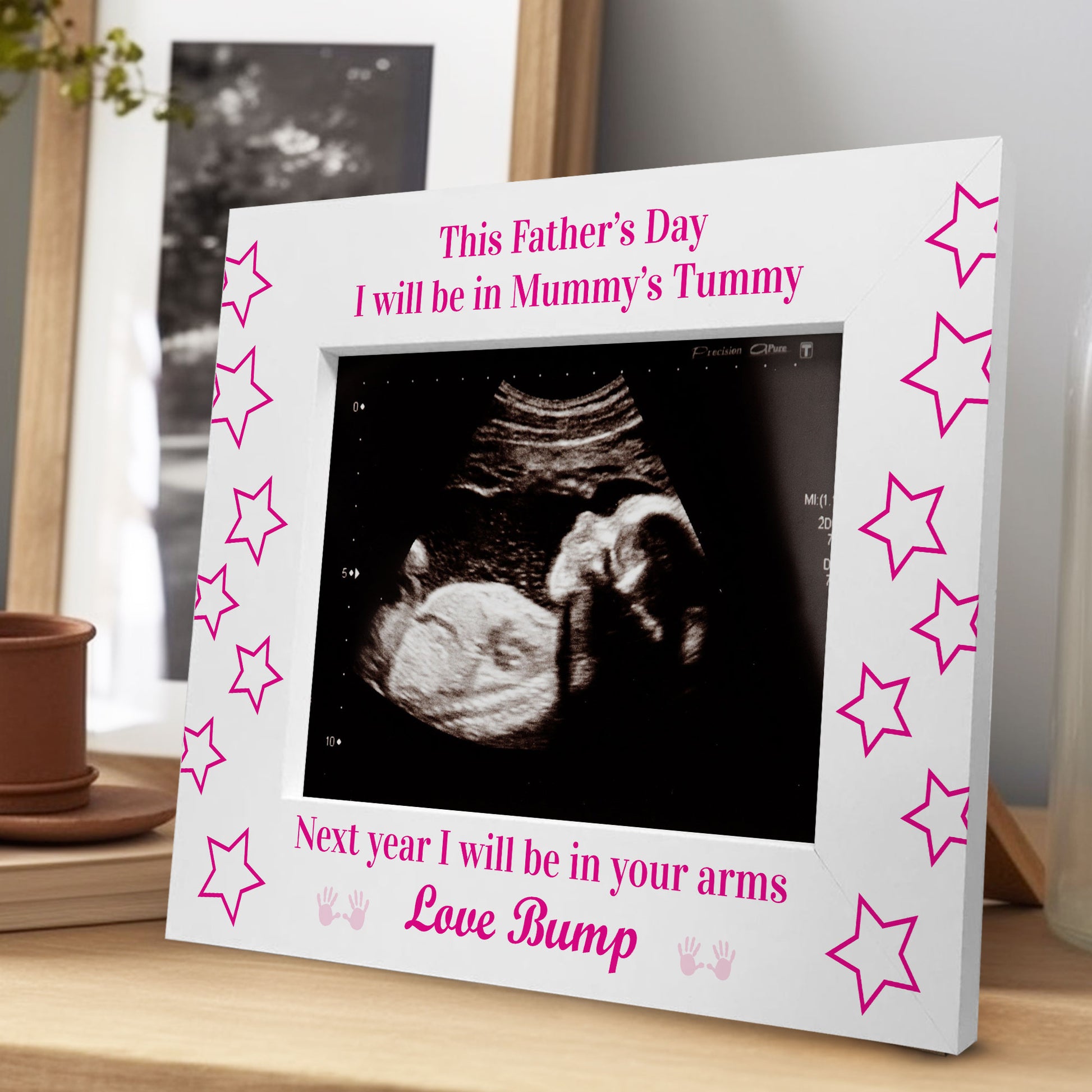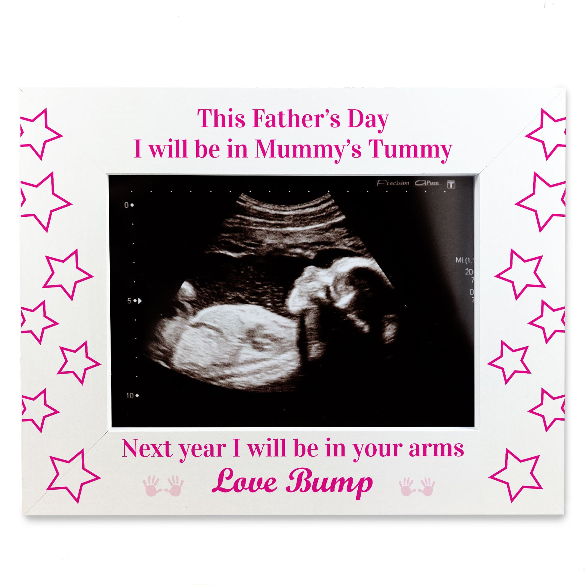 The frame reads "This Father's Day I will be in Mummys Tummy Next year I will be in your arms love bump"