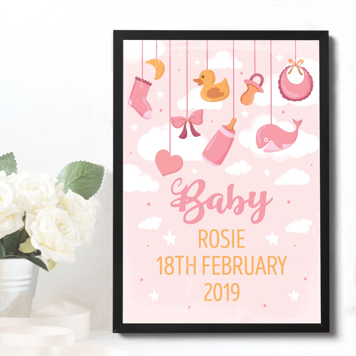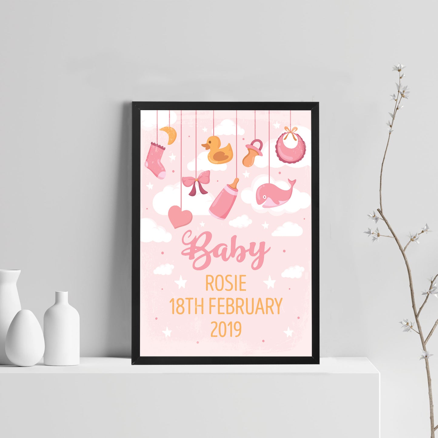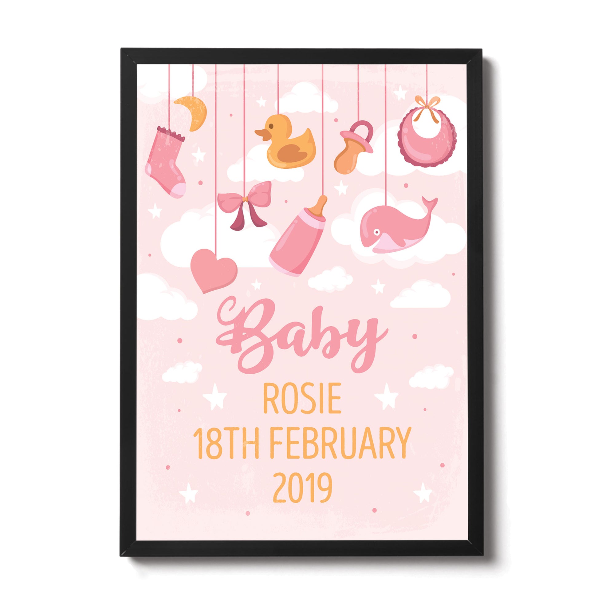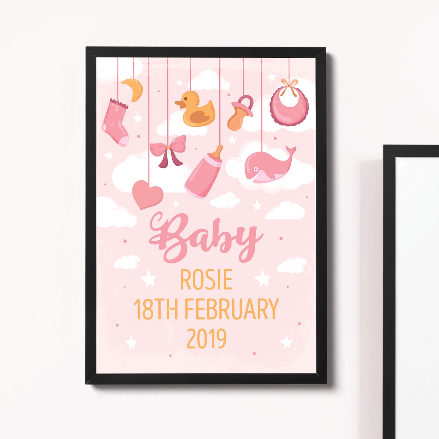 FRAMED Birth Details Print PERSONALISED Baby Girl Gift Pink Art