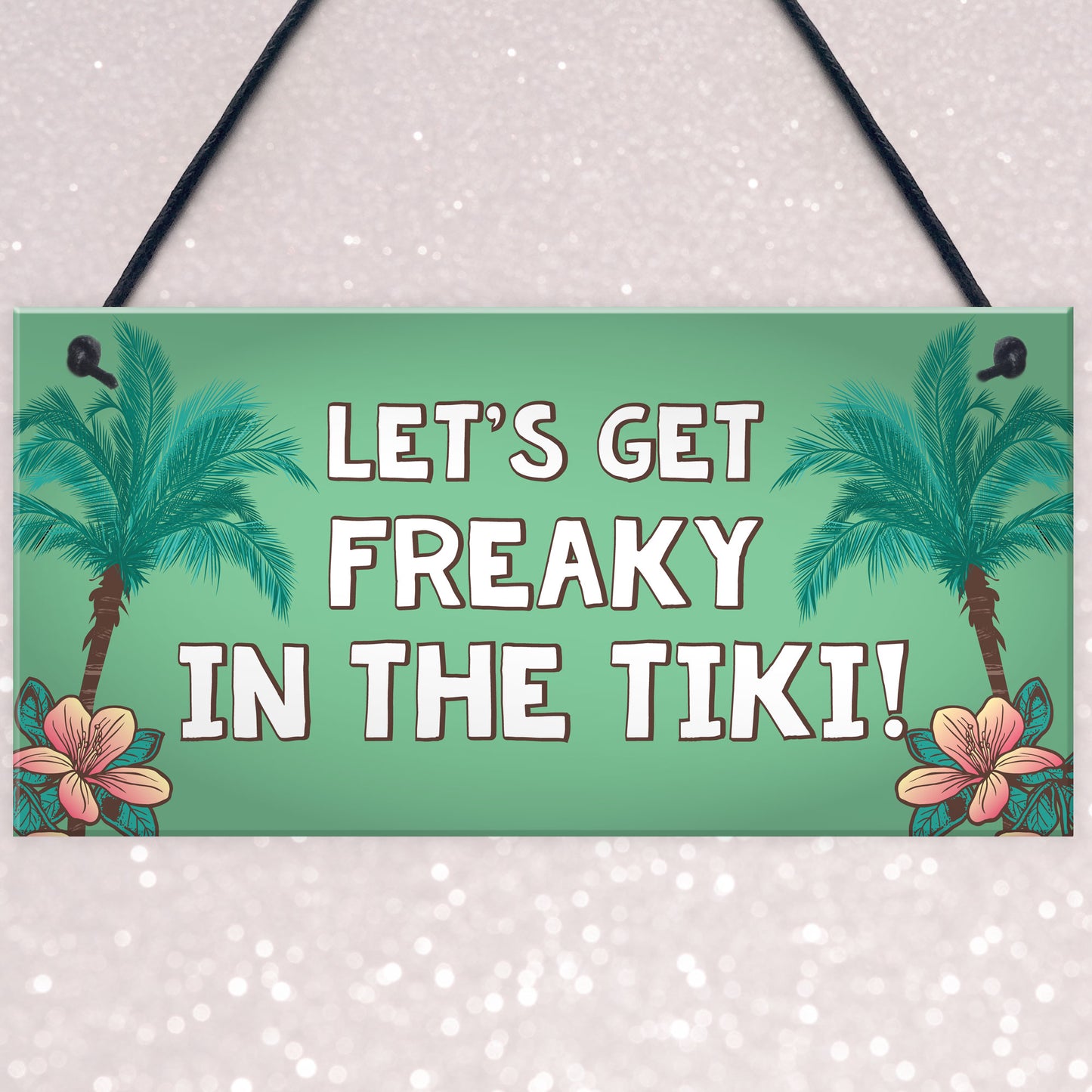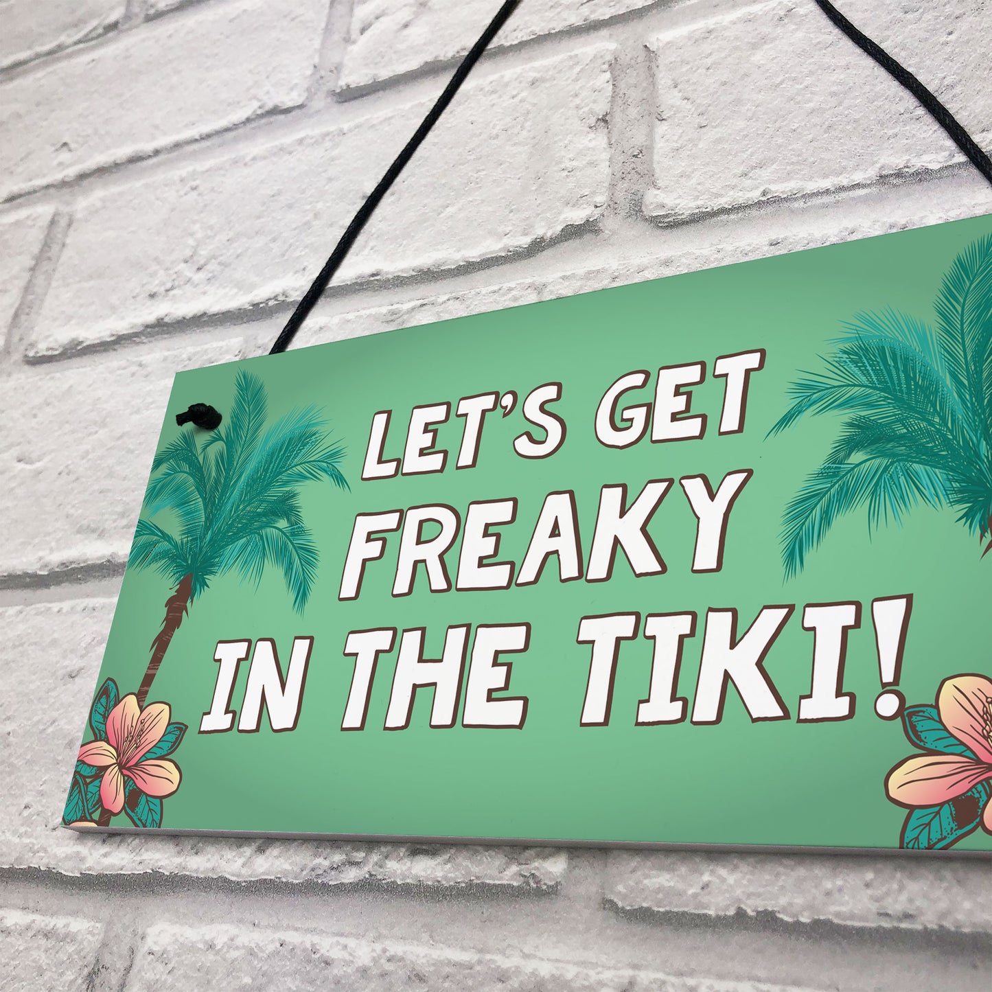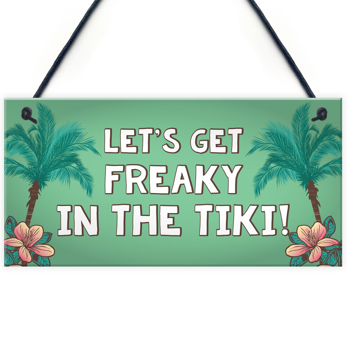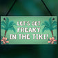 LET'S GET FREAKY IN THE TIKI! A novelty decor sign for your tiki bar / home bar. This gorgeous plaque makes an amazing Birthday or Christmas gift but is also a great gift anytime of the year. Supplied ready to hang, a beautiful keepsake that will be treasured for years to come.
