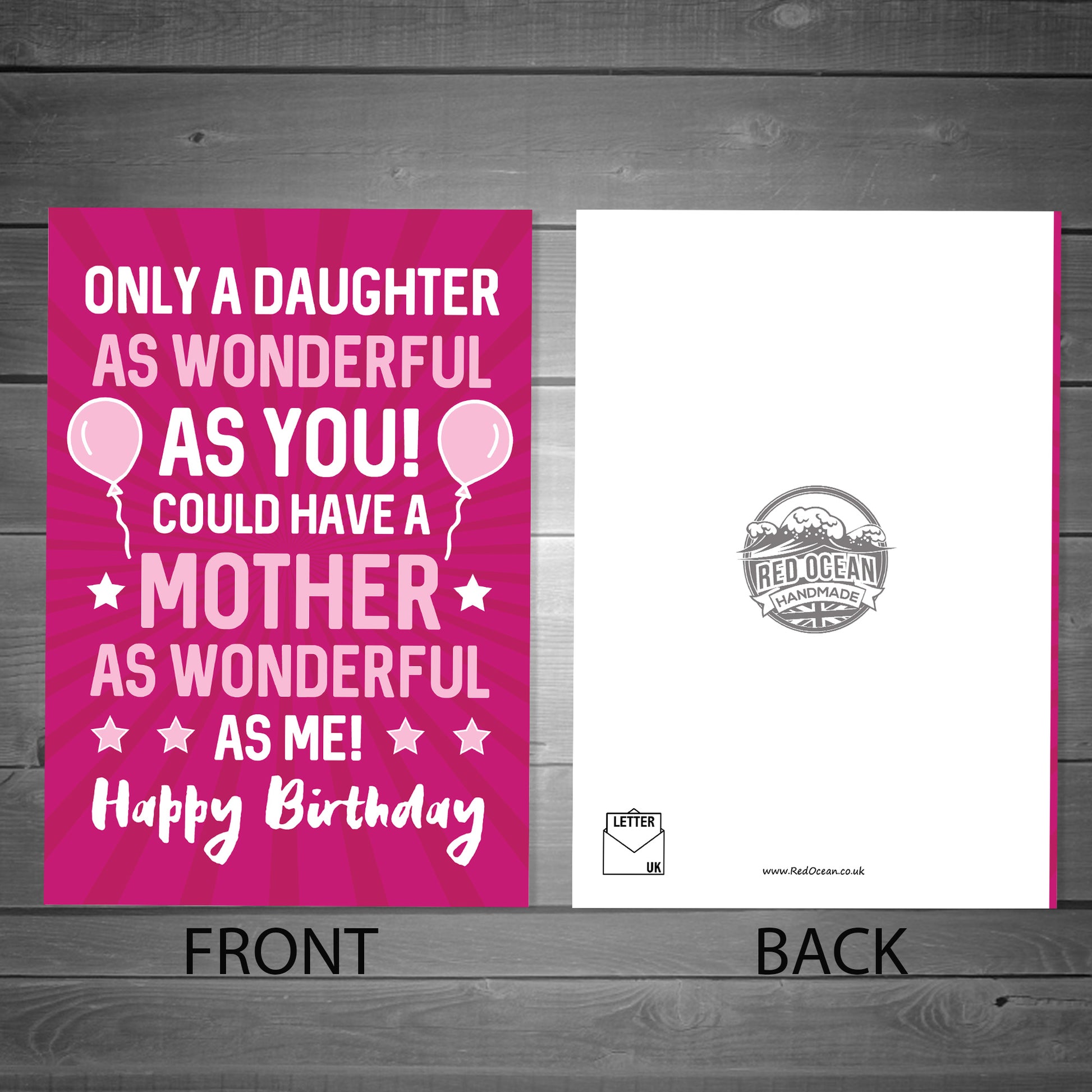 Featuring a bold and eye-catching message that reads "ONLY A DAUGHTER AS A WONDERFUL AS YOU! COUL HAVE A MOTHER AS WONDERFUL AS ME!", this card is perfect for the amazing daughter in your life. Made from high-quality materials, this card is designed to last and is sure to put a smile on your loved one's face.
