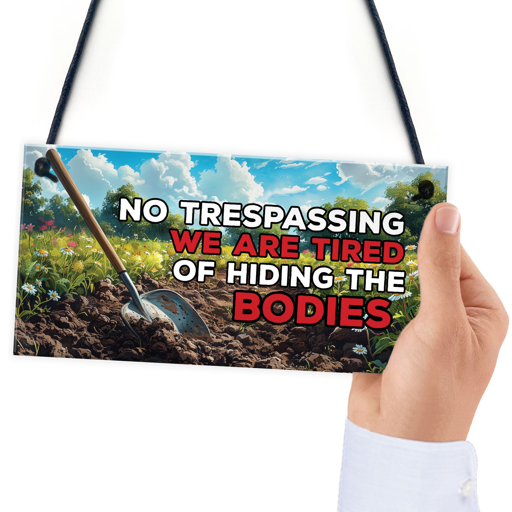 Introducing our tongue-in-cheek No Trespassing Sign, adding a touch of humour to your garden or shed while still keeping unwanted visitors at bay. Crafted with a dash of wit and a sprinkle of charm, this sign measures a generous 200mm x 100mm, ensuring it's impossible to miss.