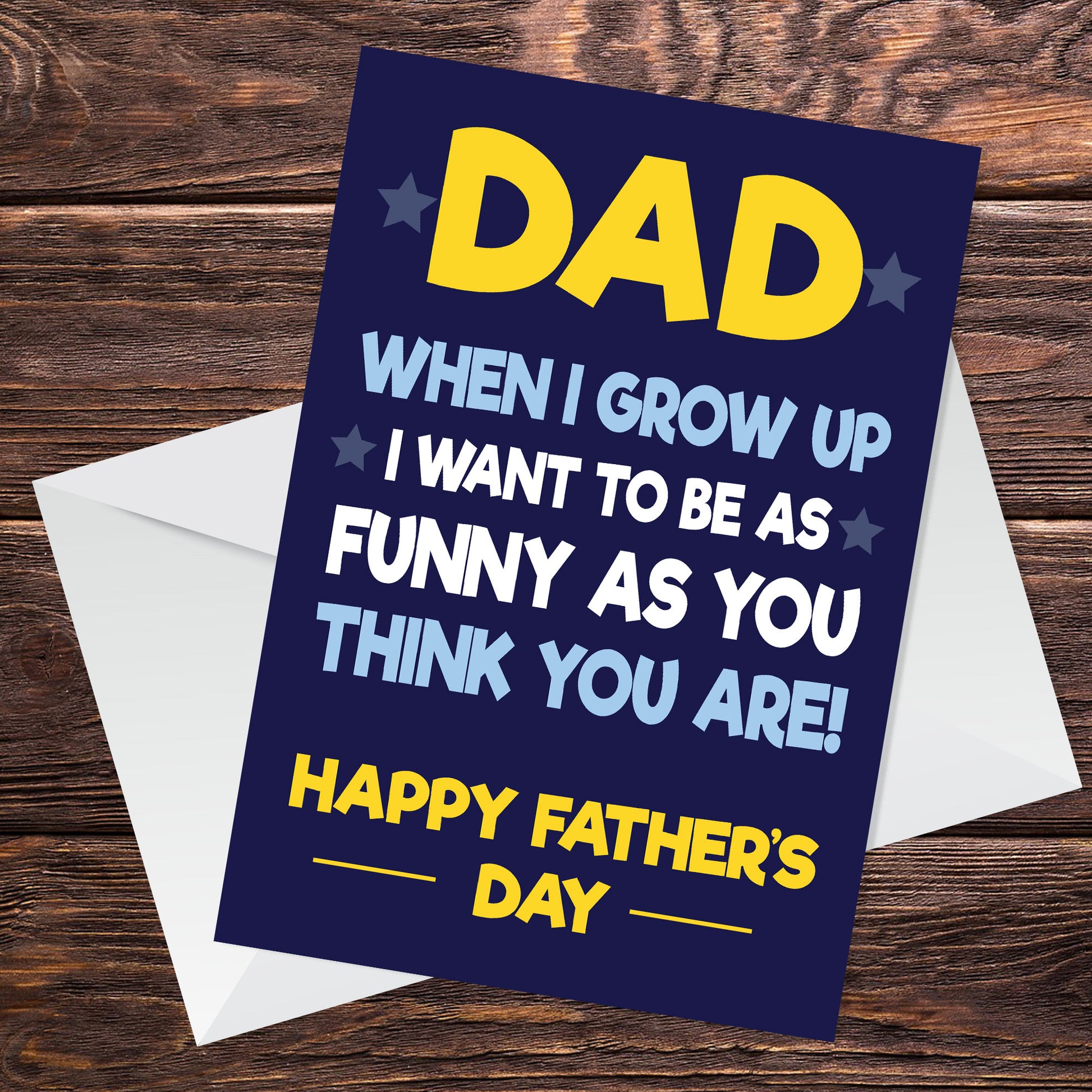 Featuring a funny message that reads "DAD WHEN I GROW UP I WANT TO BE AS FUNNY AS YOU THINK YOU ARE! HAPPY FATHER'S DAY", this card is the perfect way to make your Dad laugh! Made from high-quality materials, this card is designed to last and is sure to put a smile on your Dad's face.