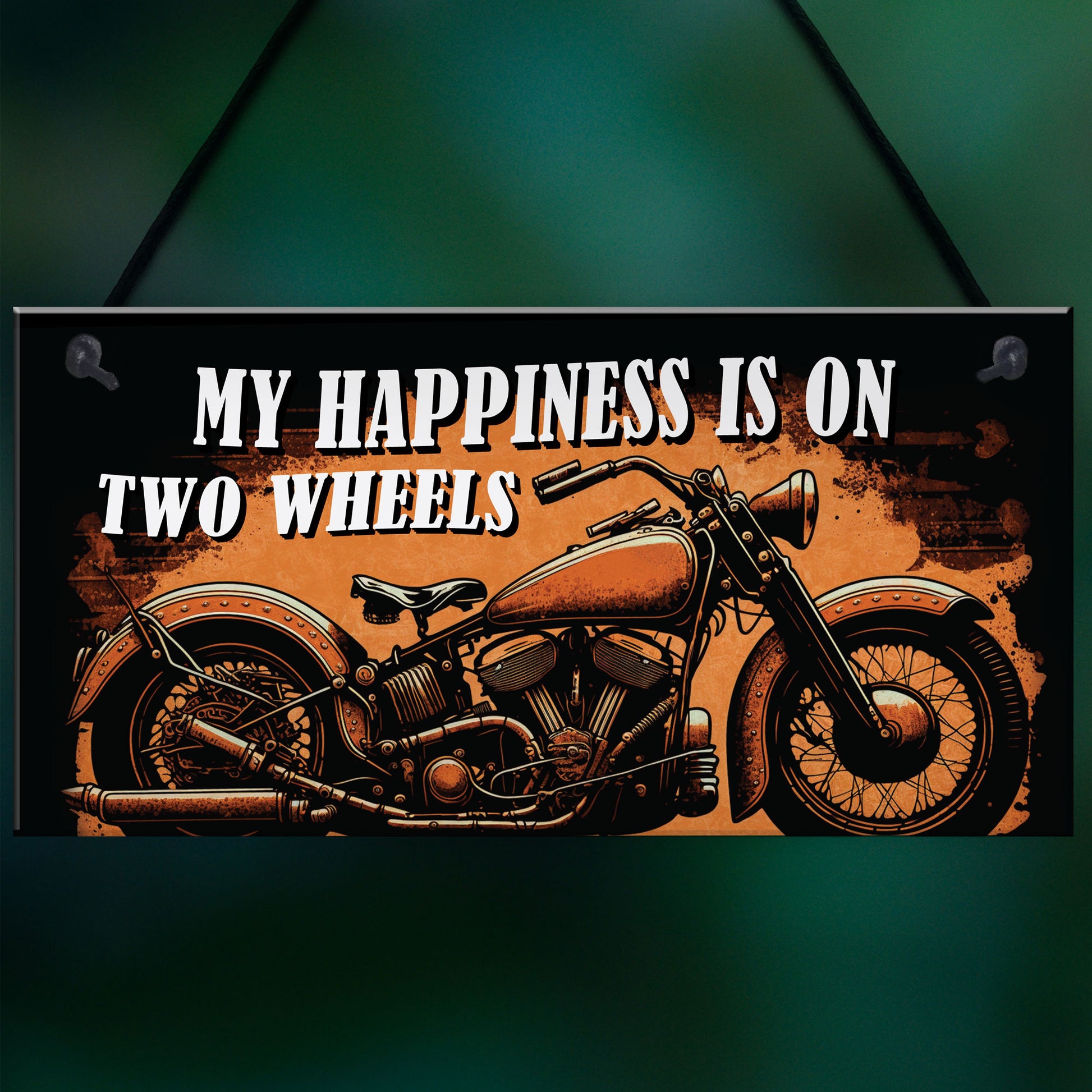 features a retro motorcycle with the words "My Happiness Is On Two Wheels" in bold, white letters. Measuring 20cm x 10cm,