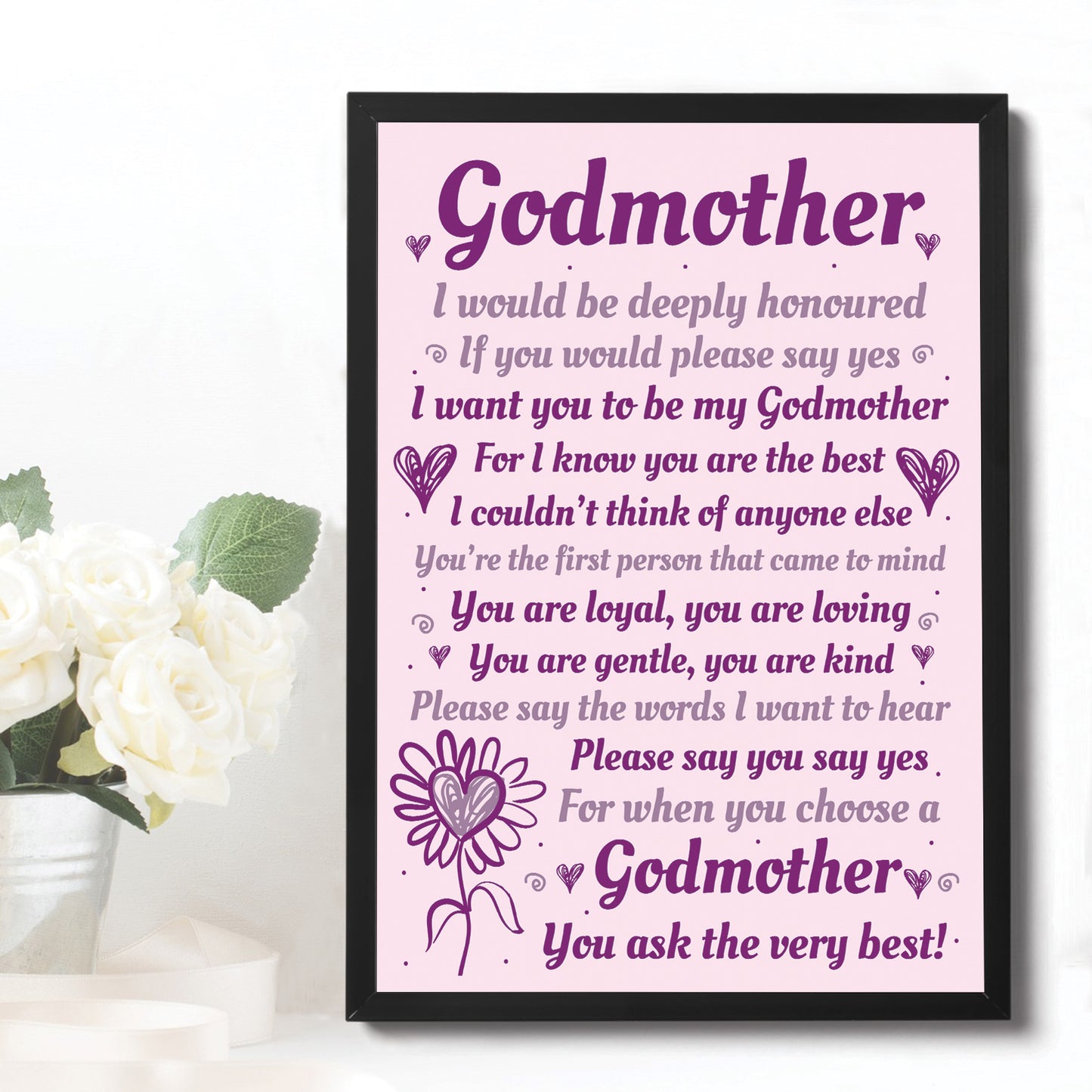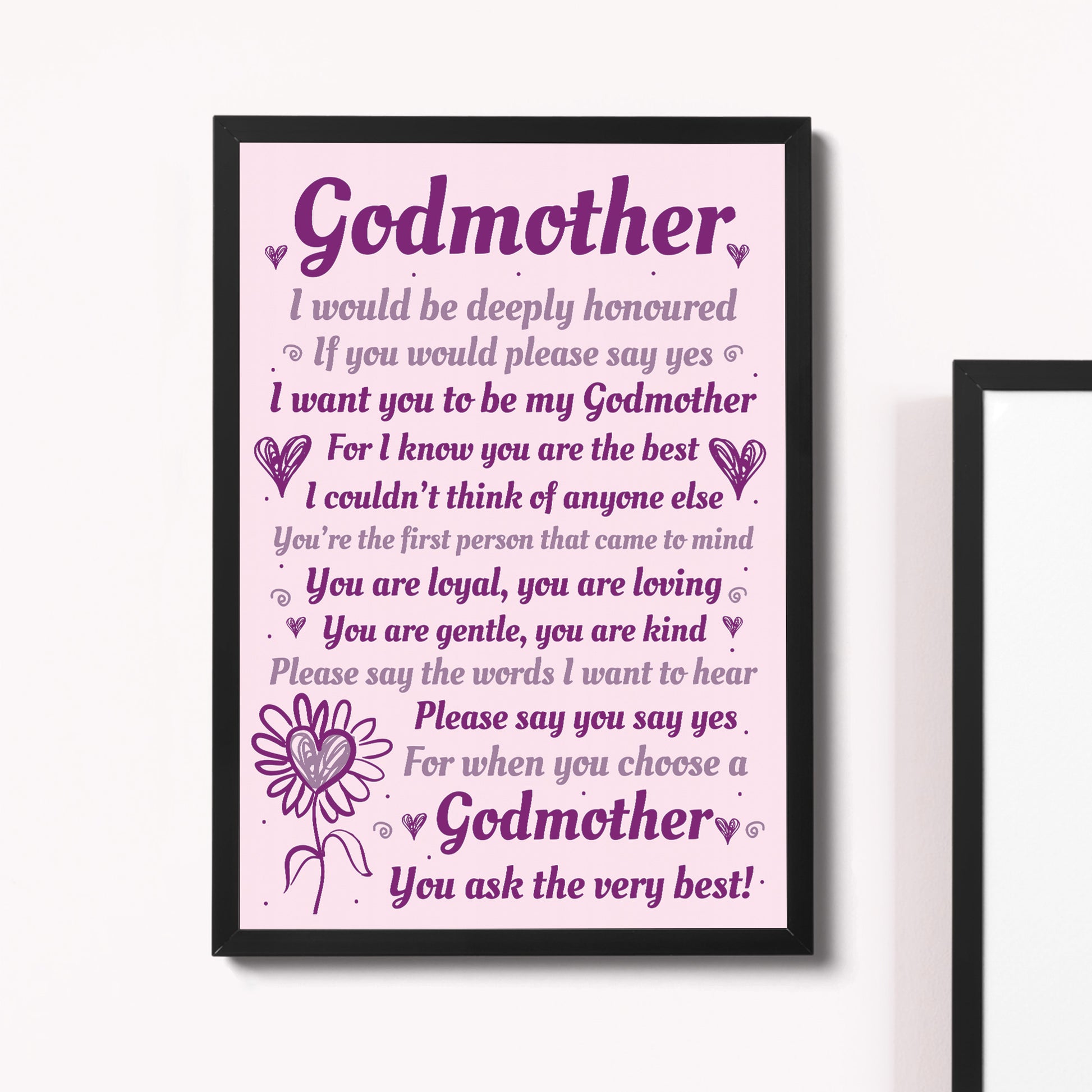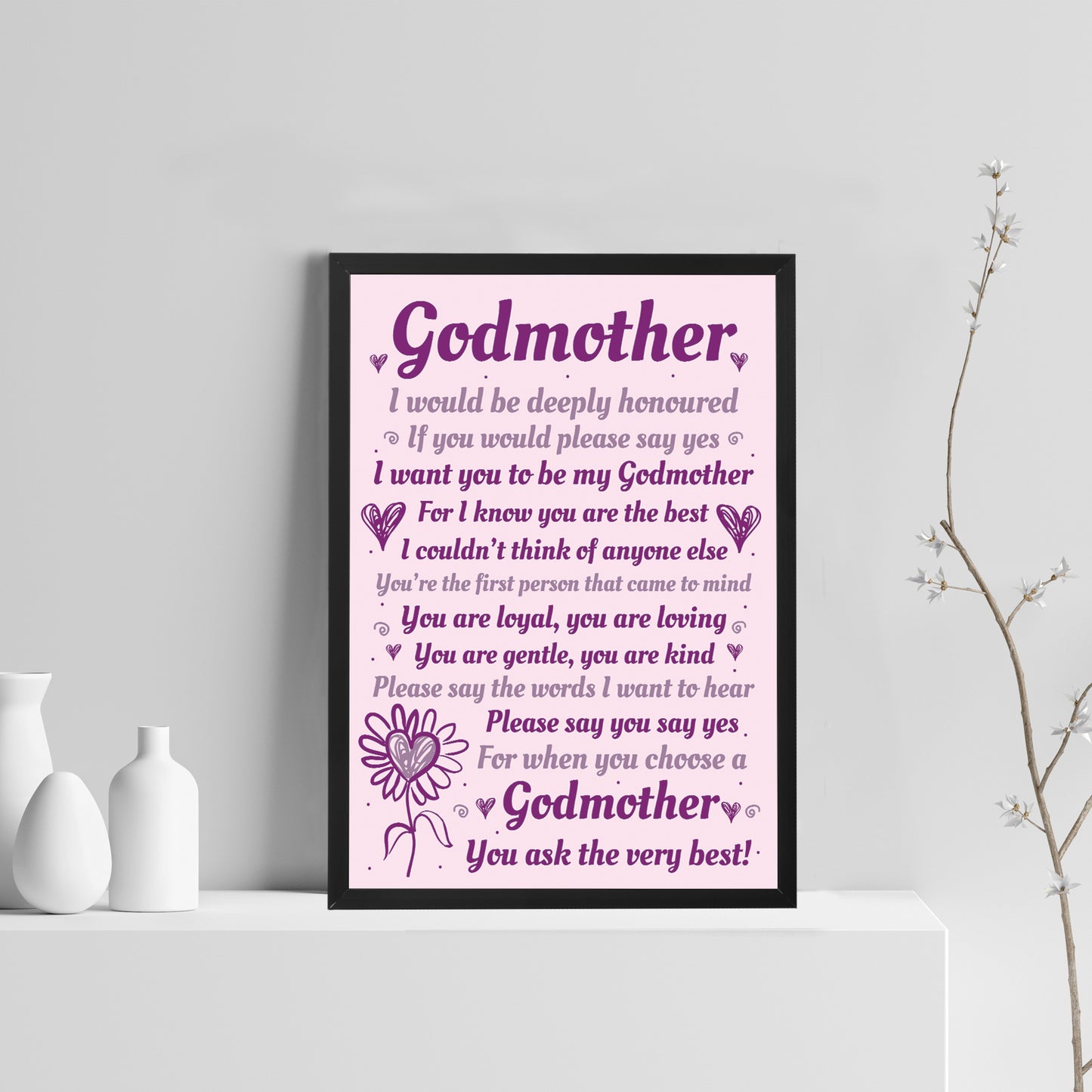 This Framed A4 Print will look great hung in any part of the house. Give this gift with love to you a friend or family member you want to make your childs Godmother! Godmother Gifts! Godmother Photo Frame! Godmother Asking! Godmother and Goddaughter! Godmother and Godson! Put a smile on their face when they get this. This gorgeous print makes an amazing Birthday or Christmas gift but is also a great gift anytime of the year. Supplied ready to hang / stand, a beautiful keepsake that will be treasured for years to come.