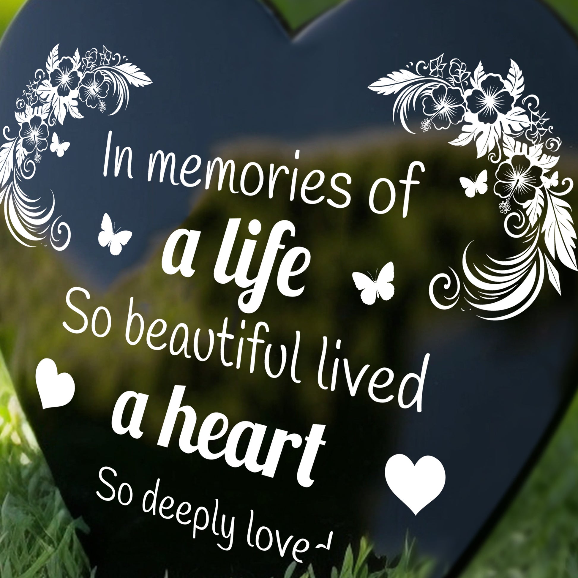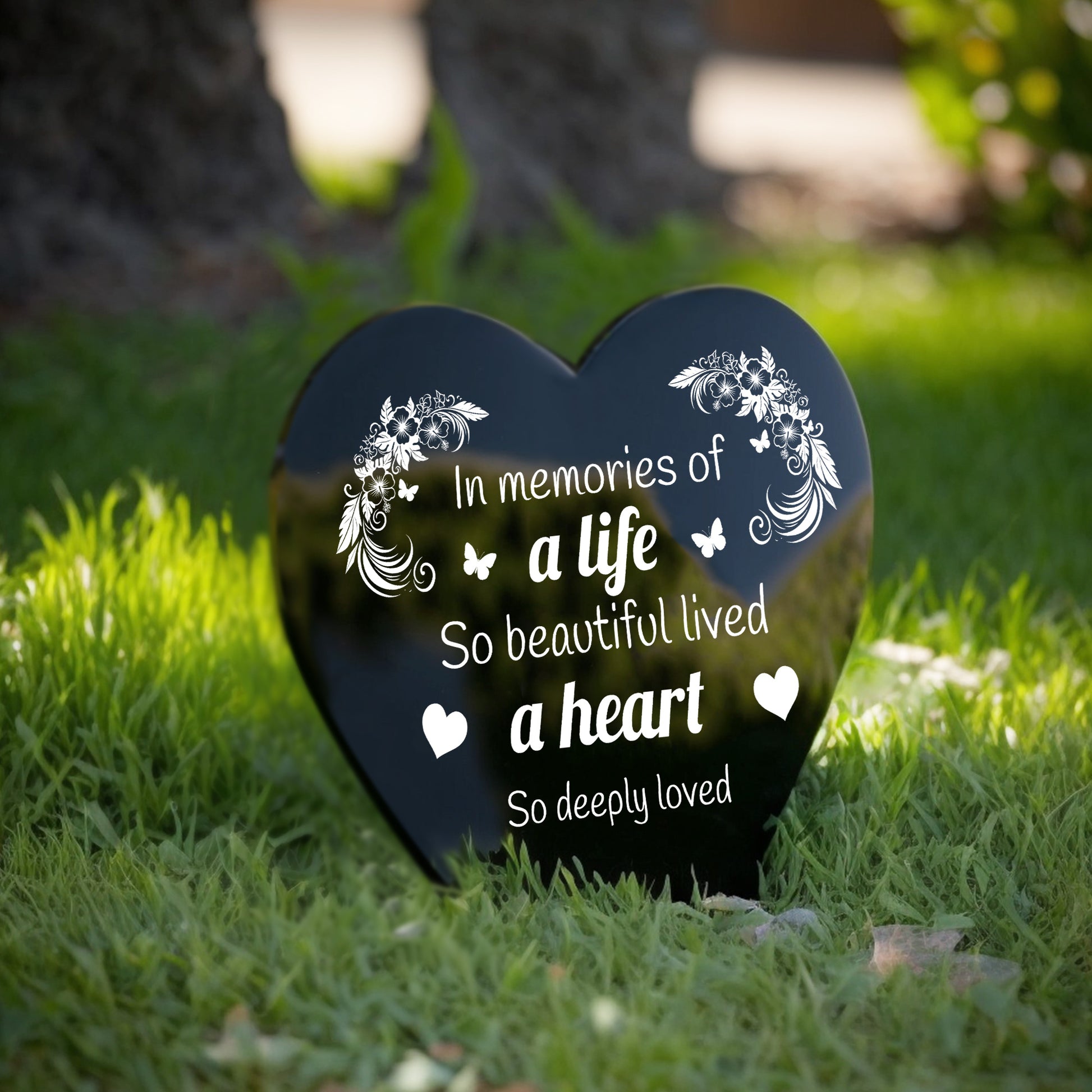 The black acrylic heart with stake is not only a beautiful and practical way to remember a loved one, but it's also a great way to add a personal touch to your garden or outdoor space. Whether you're looking to create a peaceful and reflective area or simply want to add some decoration to your garden, this memorial plaque is the perfect choice.