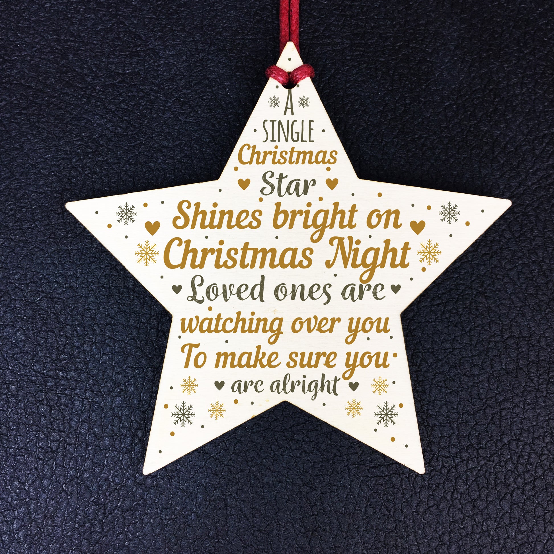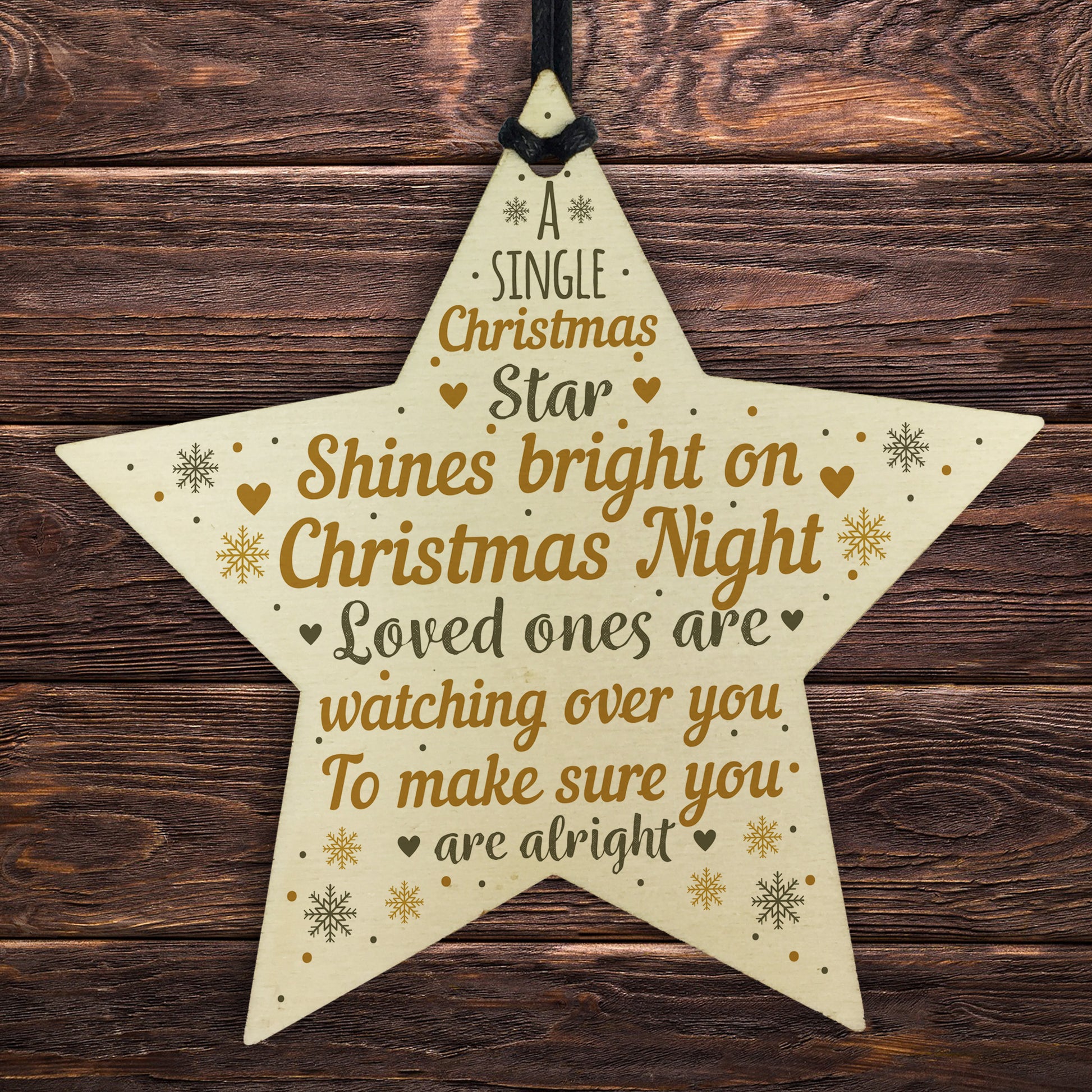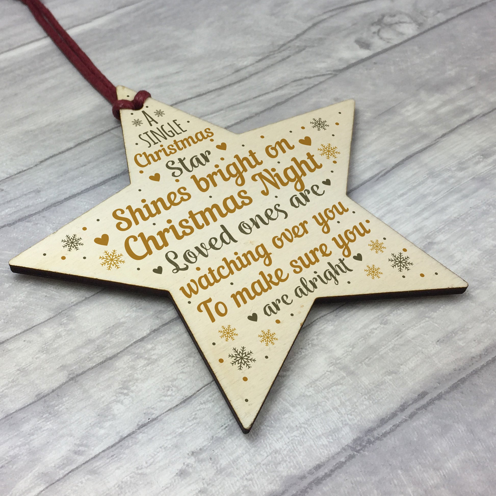 A gorgeous wooden star plaque printed with a beautiful message that will be a lovely addition to hang up on your christmas tree to celebrate and remember lost loved ones that cannot be with you this christmas.