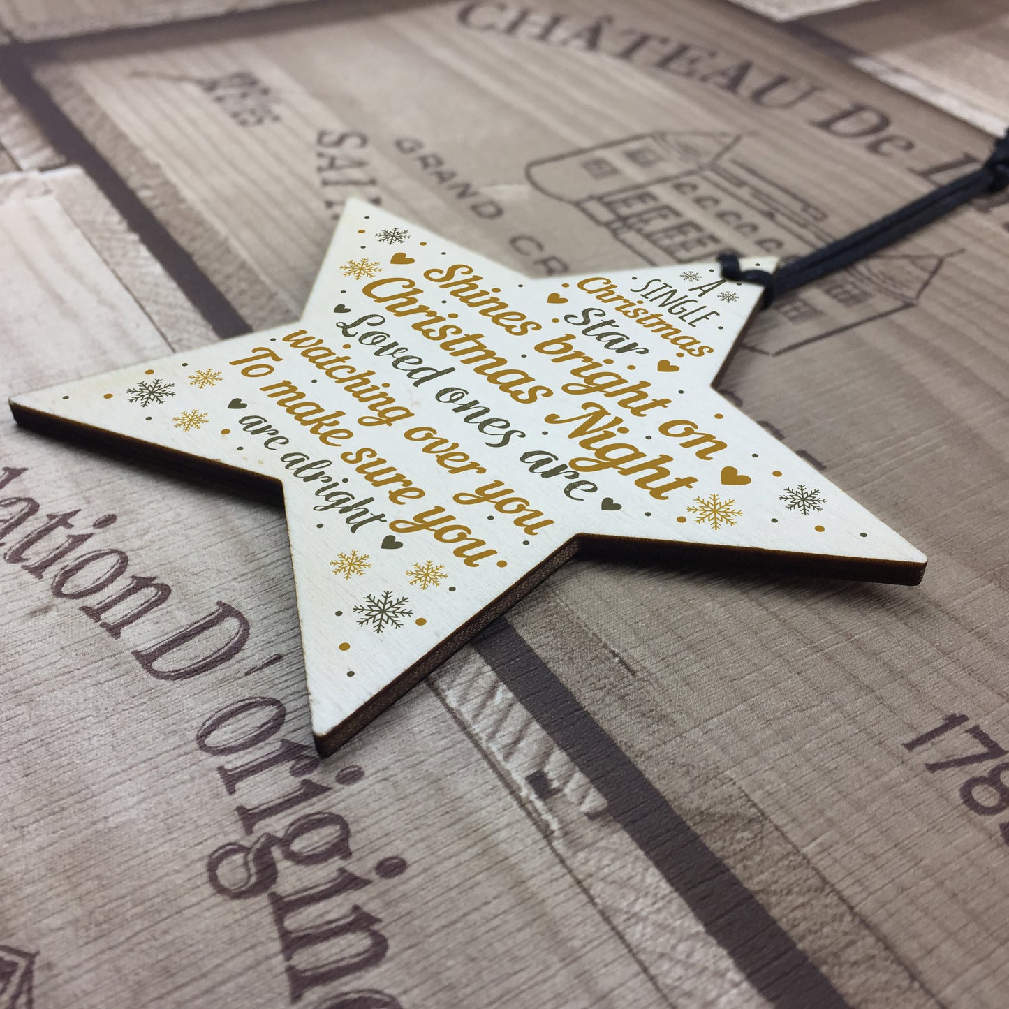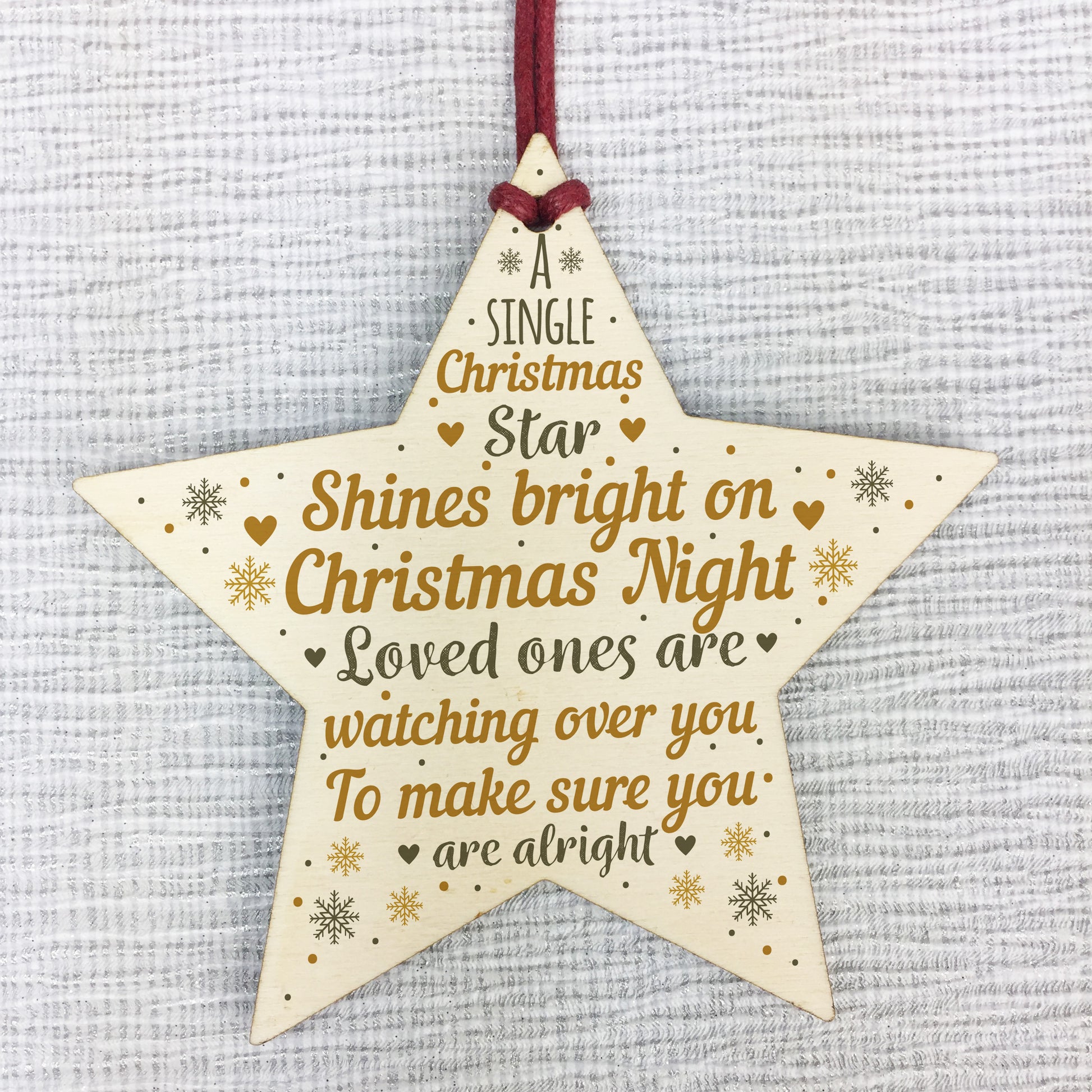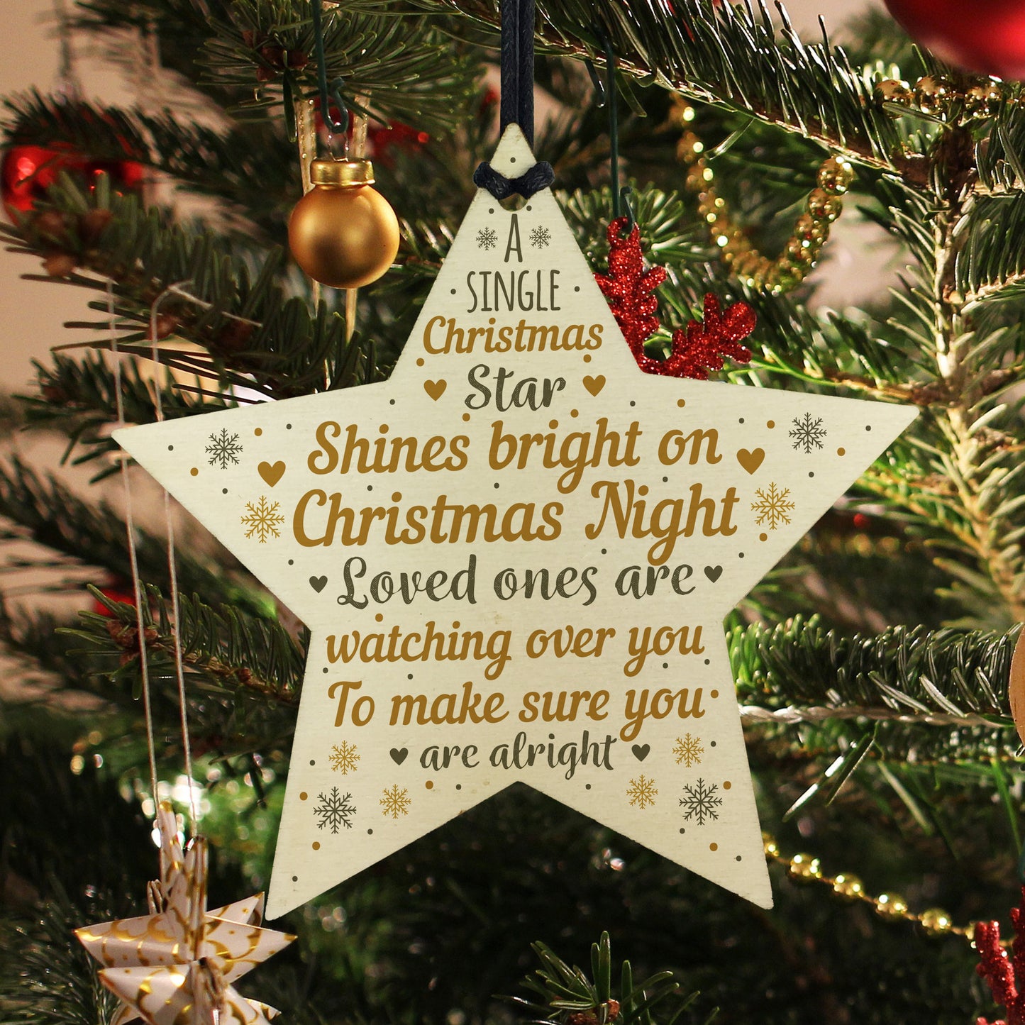 A gorgeous wooden star plaque printed with a beautiful message that will be a lovely addition to hang up on your christmas tree to celebrate and remember lost loved ones that cannot be with you this christmas.
