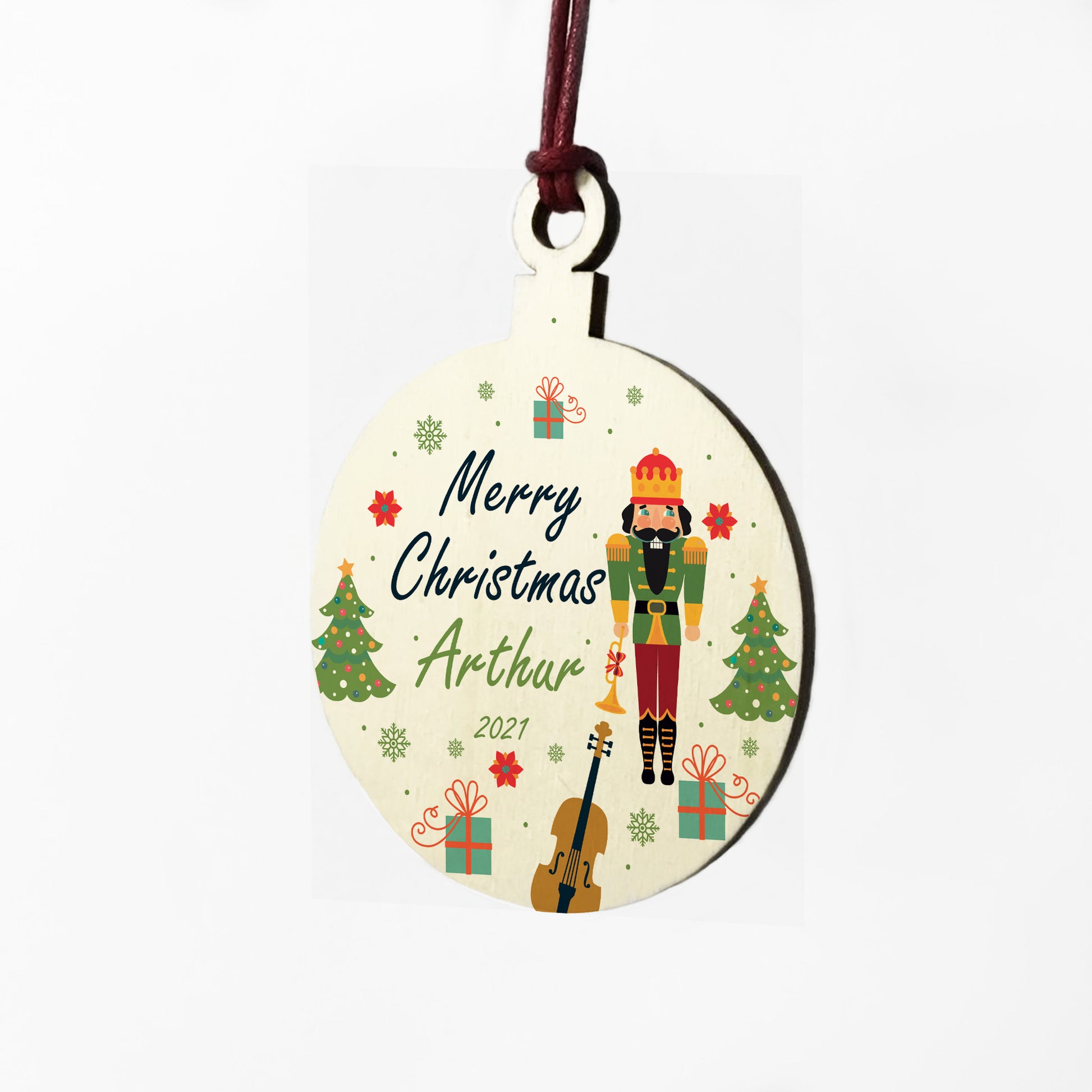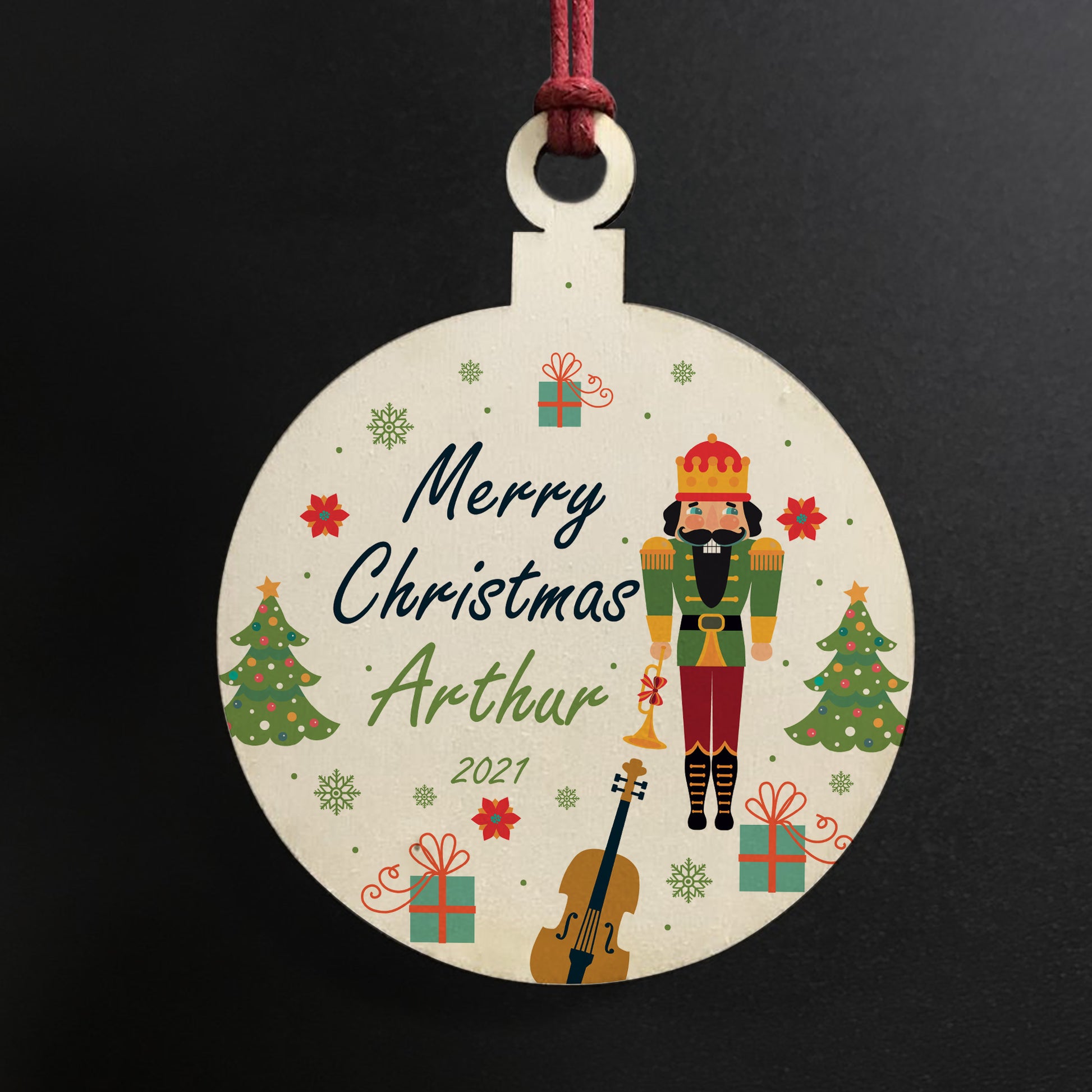 The bauble is made from real wood, and the design is permanently printed into the wood. The wooden bauble is supplied with waxed cotton rope in both black and red colours to allow easy hanging and looks great in any room of the house.