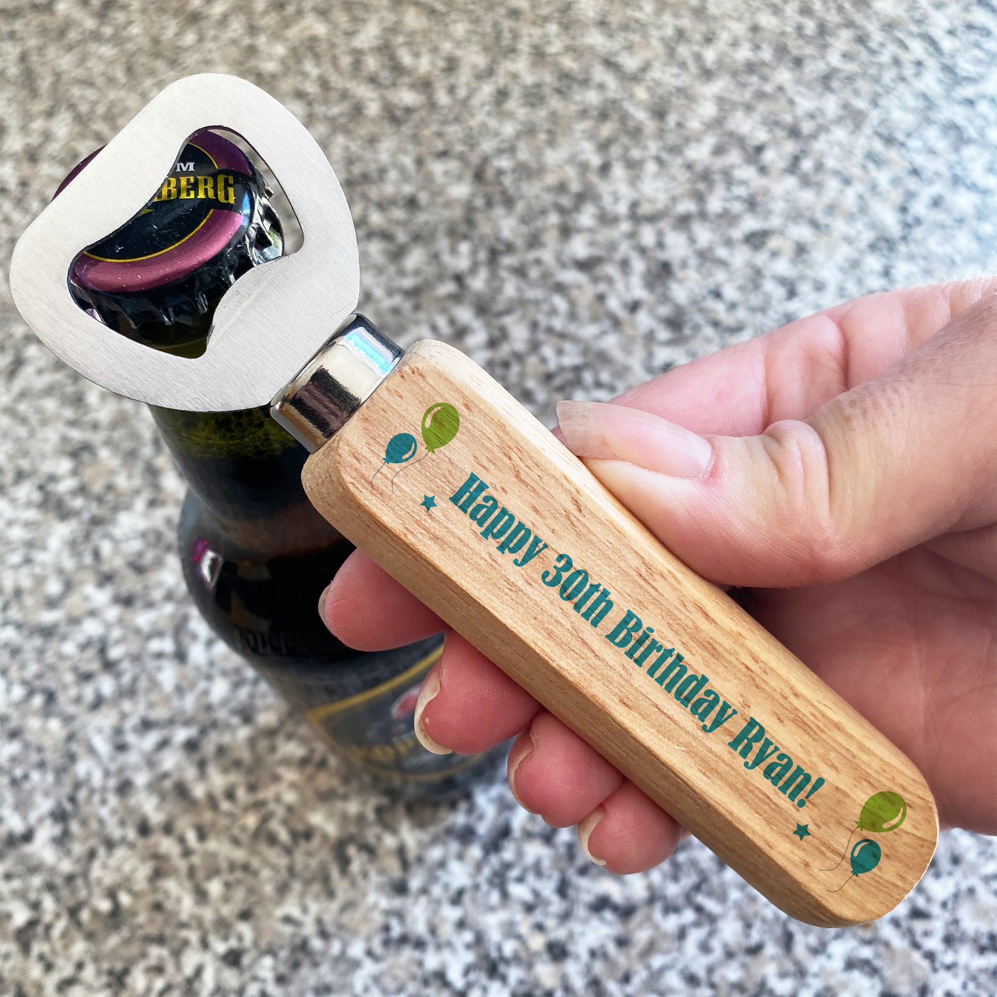 The bottle opener is made from high quality metal and wood, and the design is permanently printed into the wood on the handle and will last for many years.