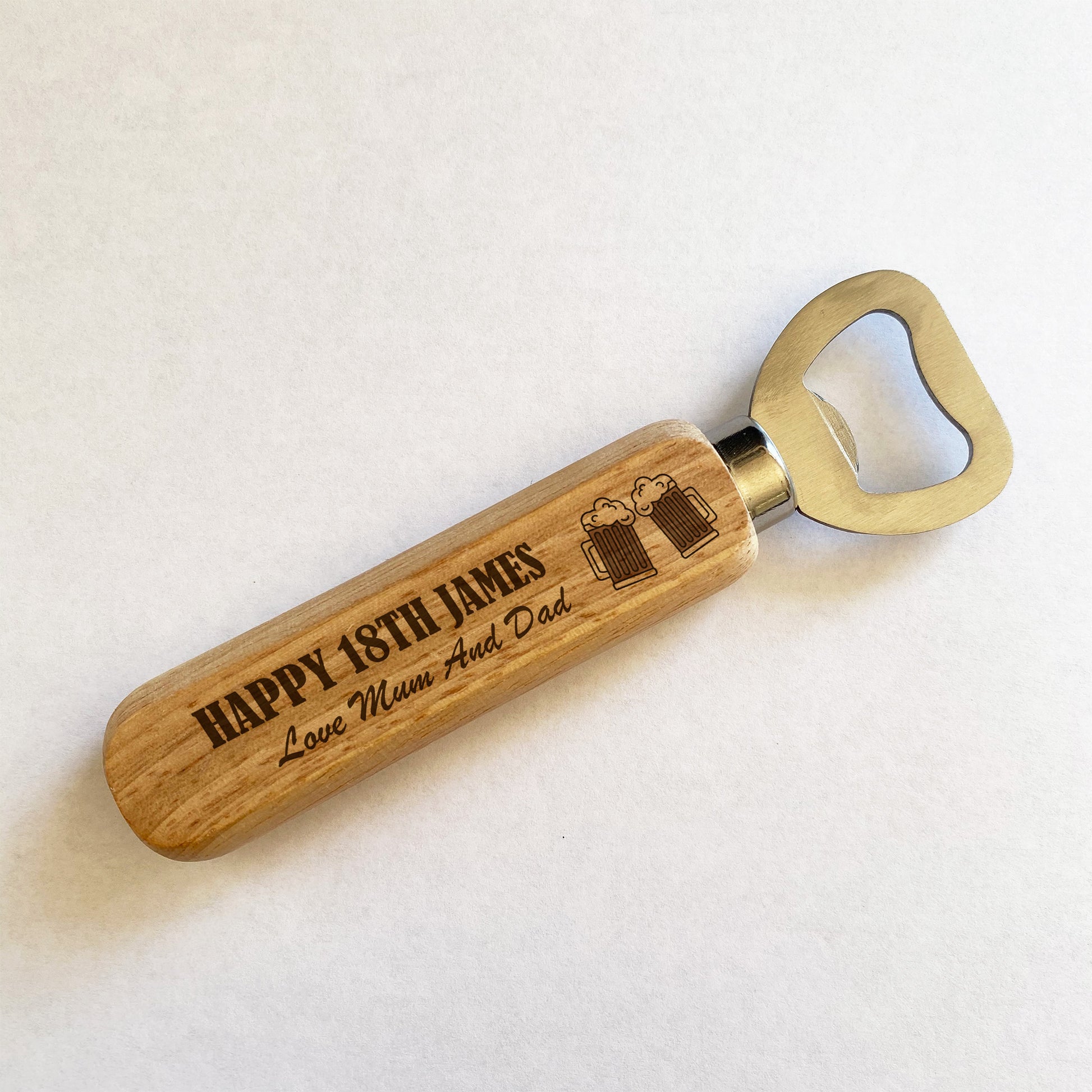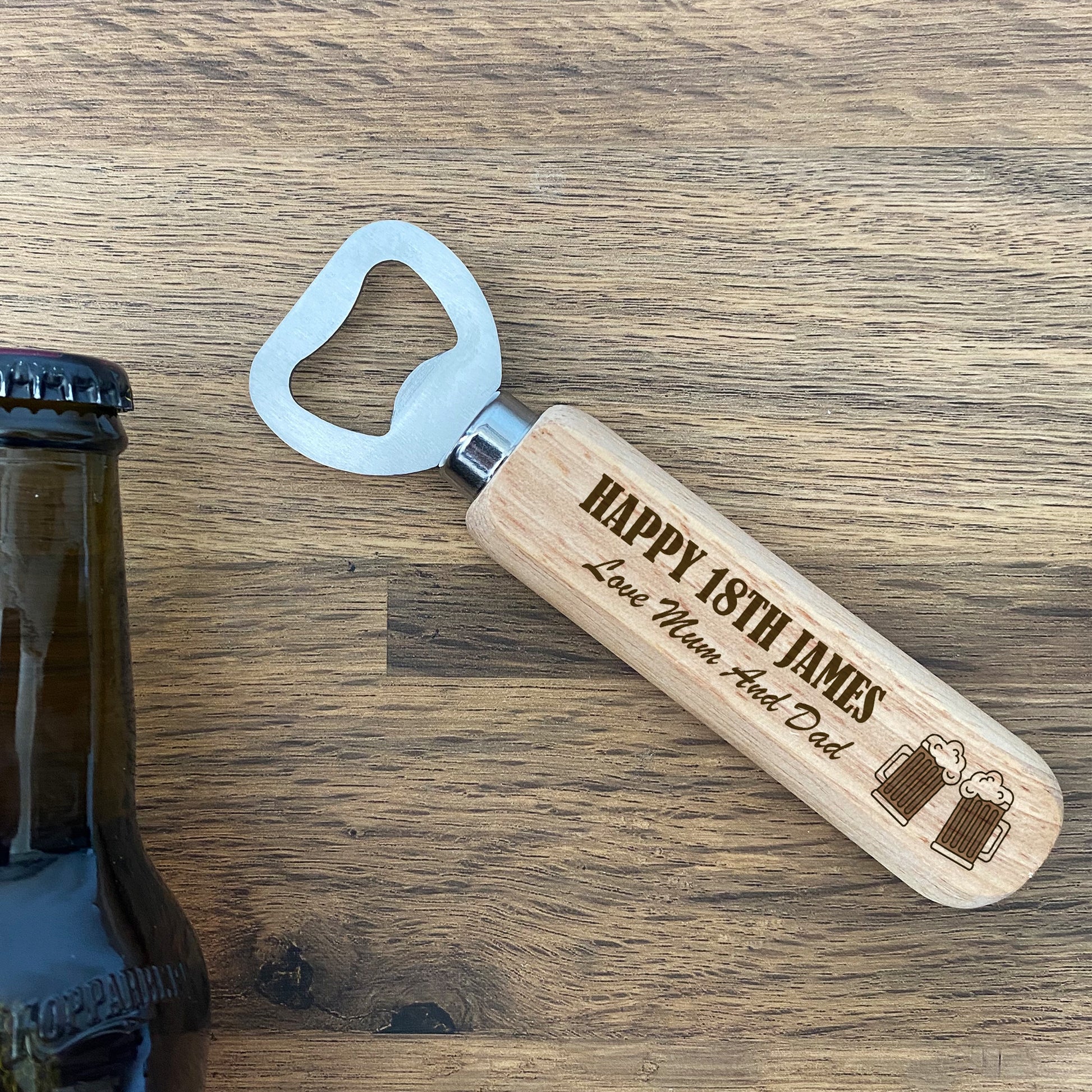 The bottle opener is made from high quality metal and wood, and the design is permanently printed into the wood on the handle and will last for many years.