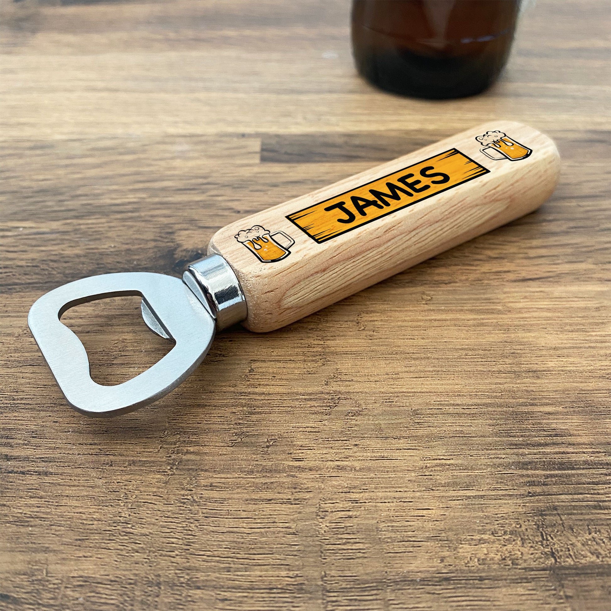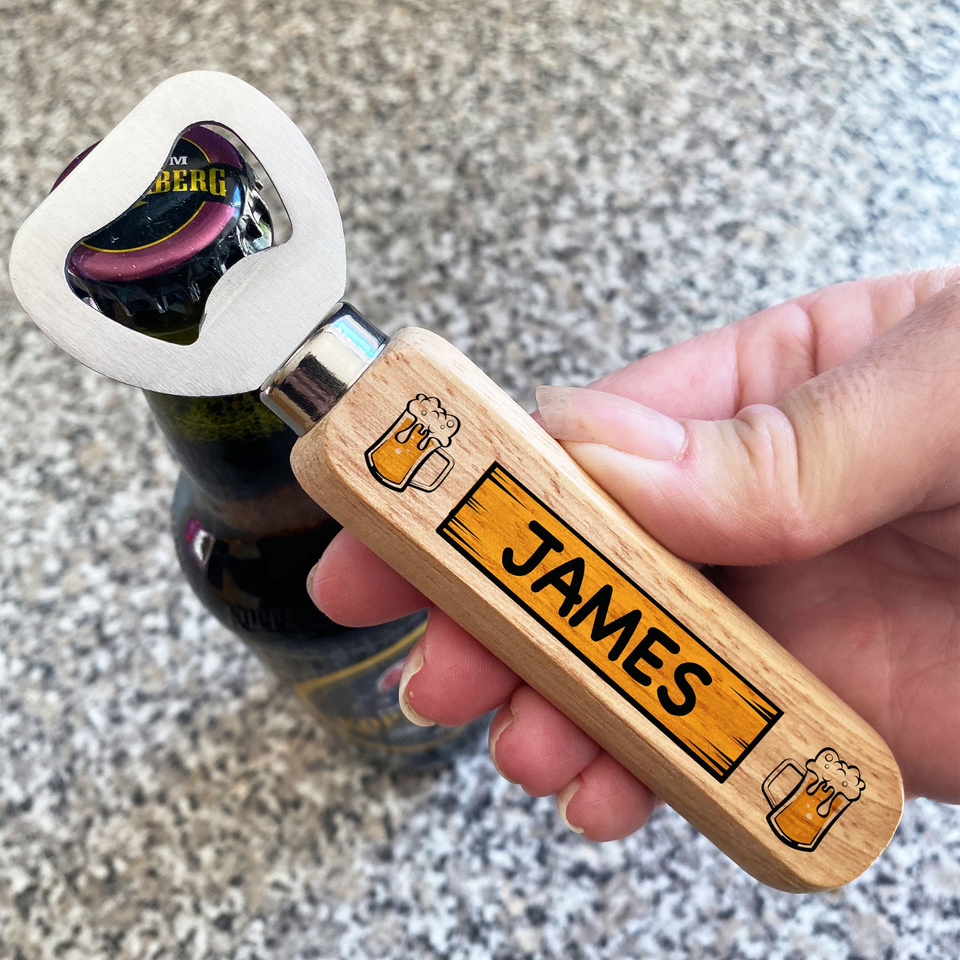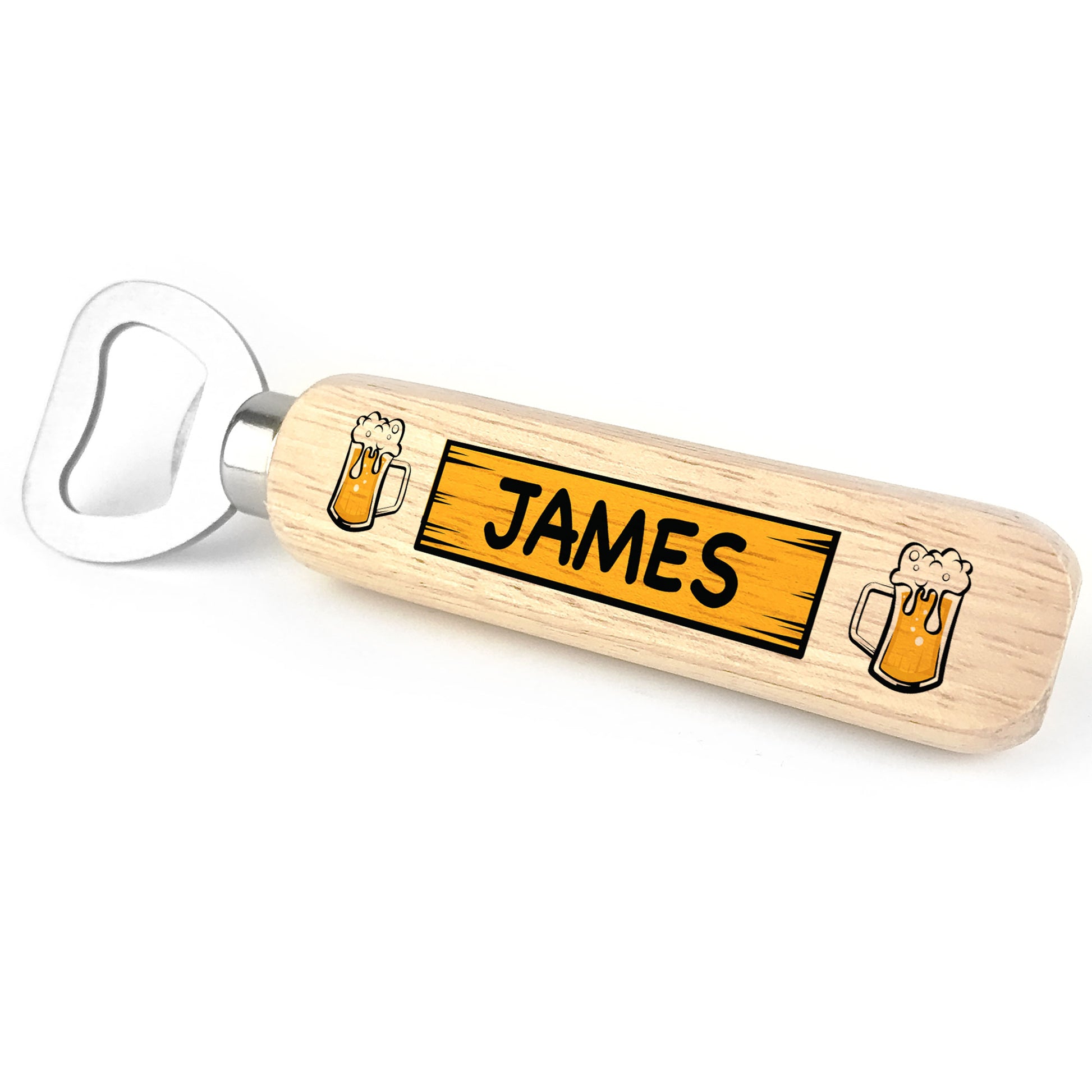 The bottle opener is made from high quality metal and wood, and the design is permanently printed into the wood on the handle and will last for many years.