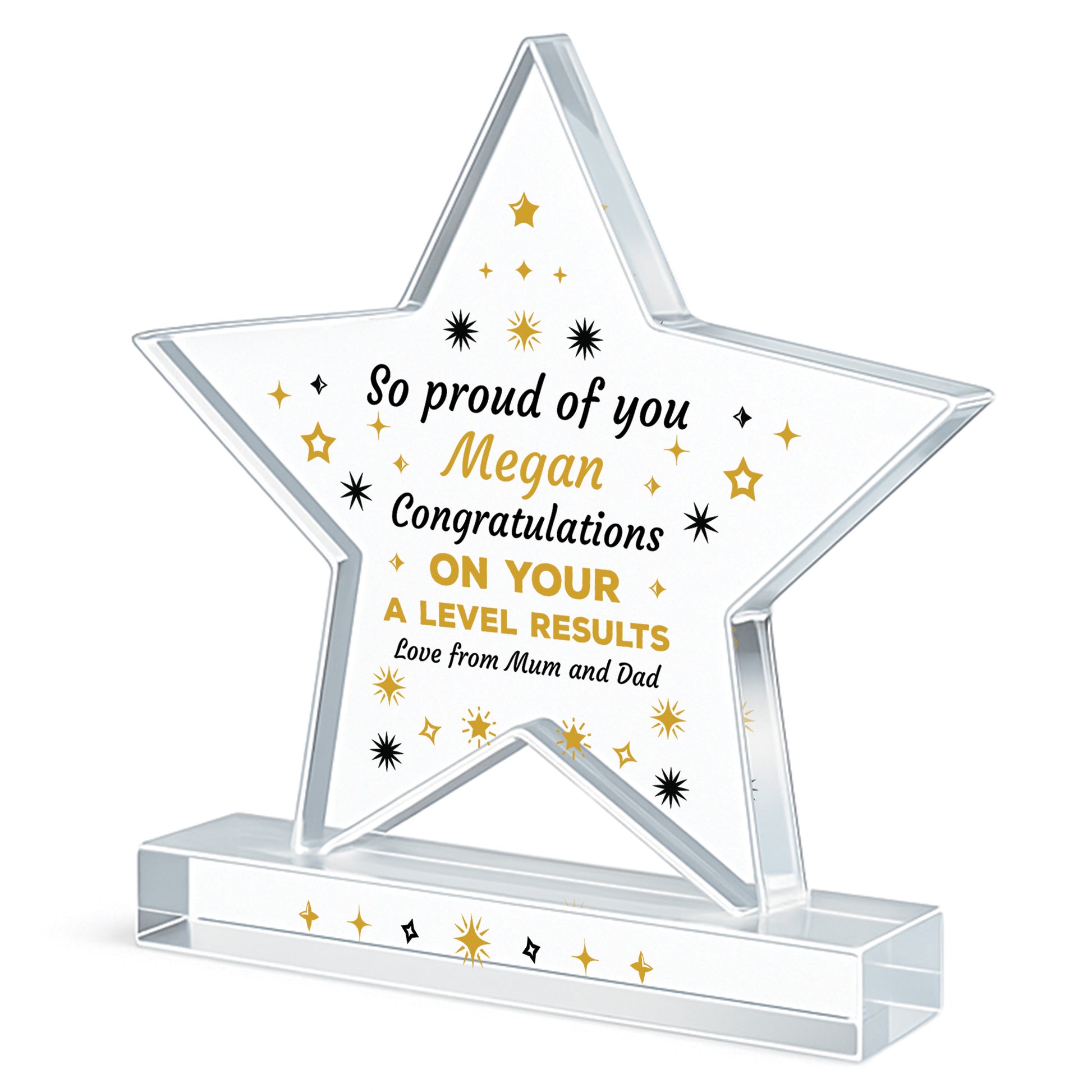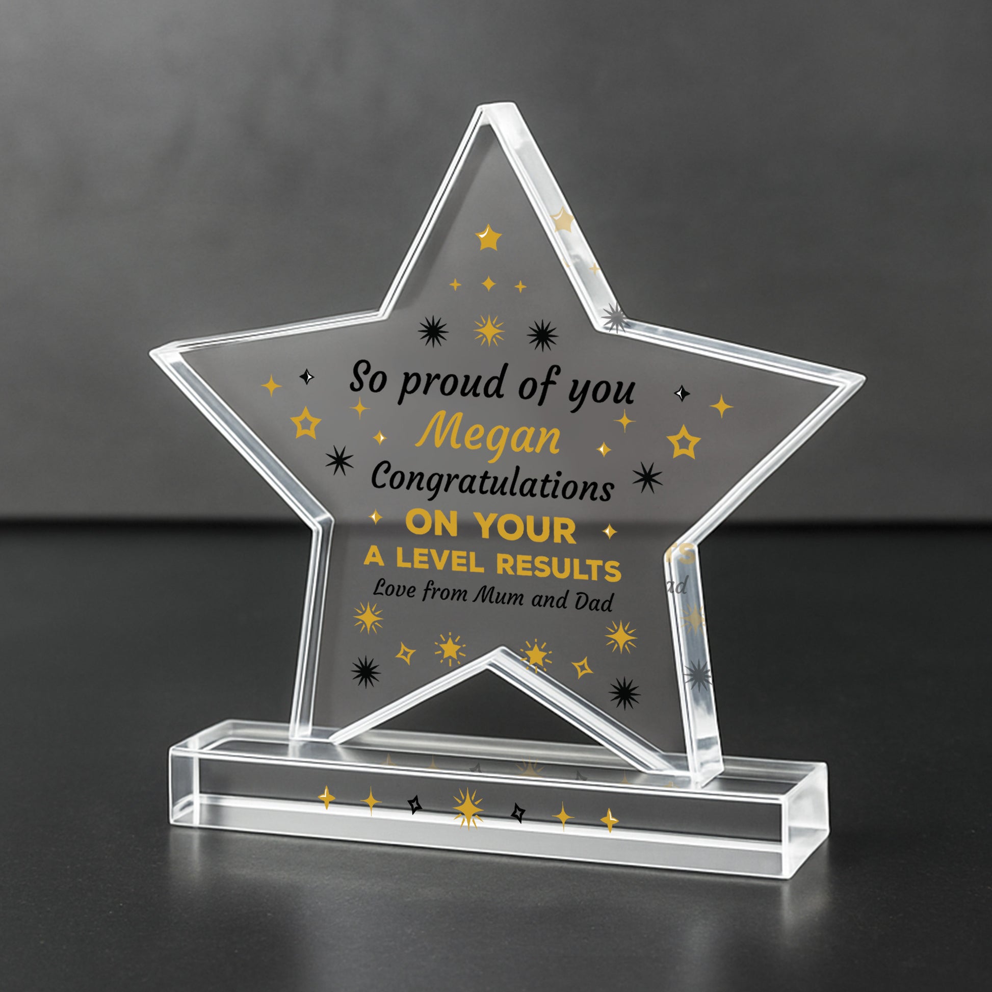 Celebrate a proud milestone with this elegant freestanding acrylic star plaque, congratulate a friend / family member on passing their A Levels. Crafted from high quality acrylic, this piece measures 10cm by 10cm and stands confidently on its own thanks to a solid rectangular base. It's compact in size but full of sentiment, making it a perfect keepsake for graduates of all ages.