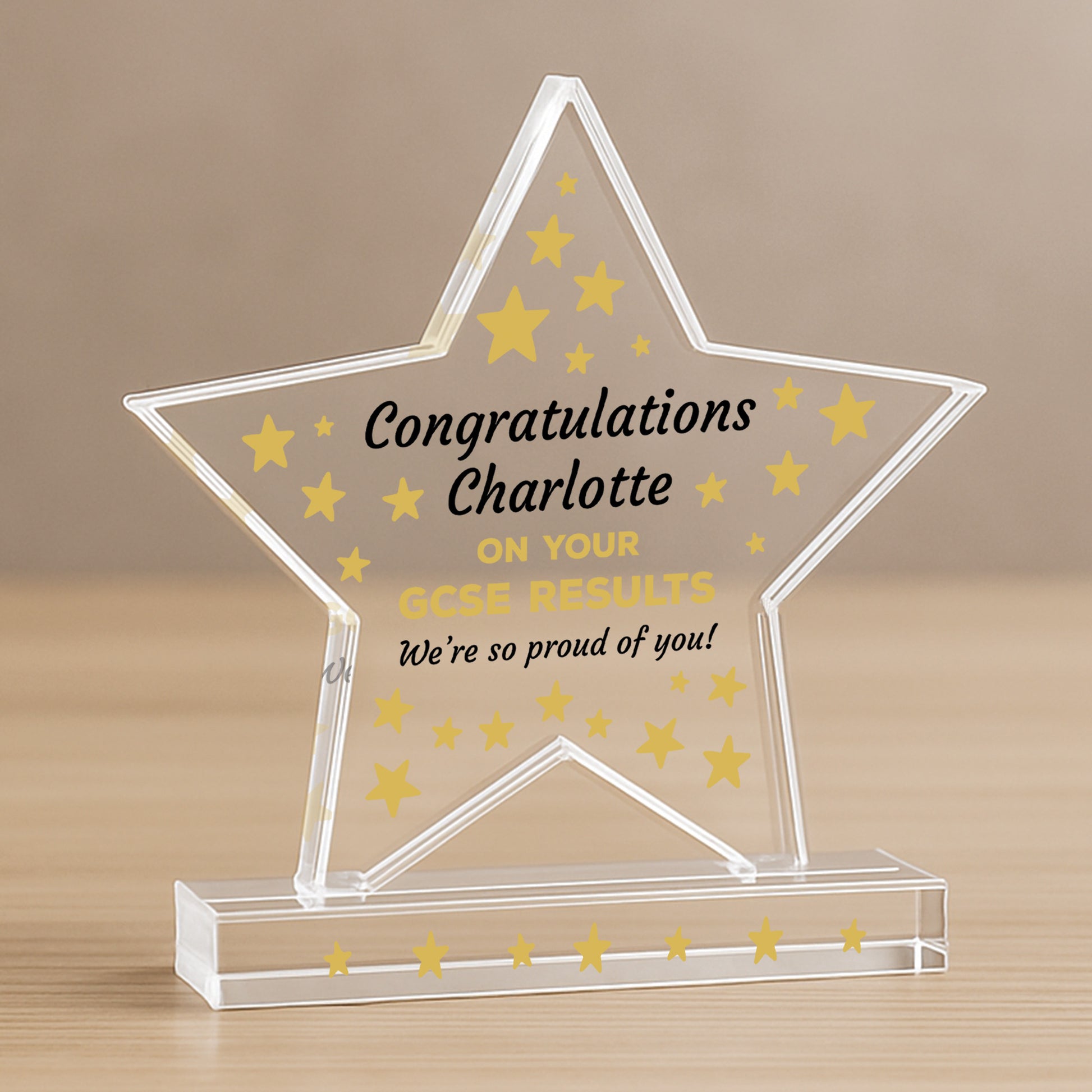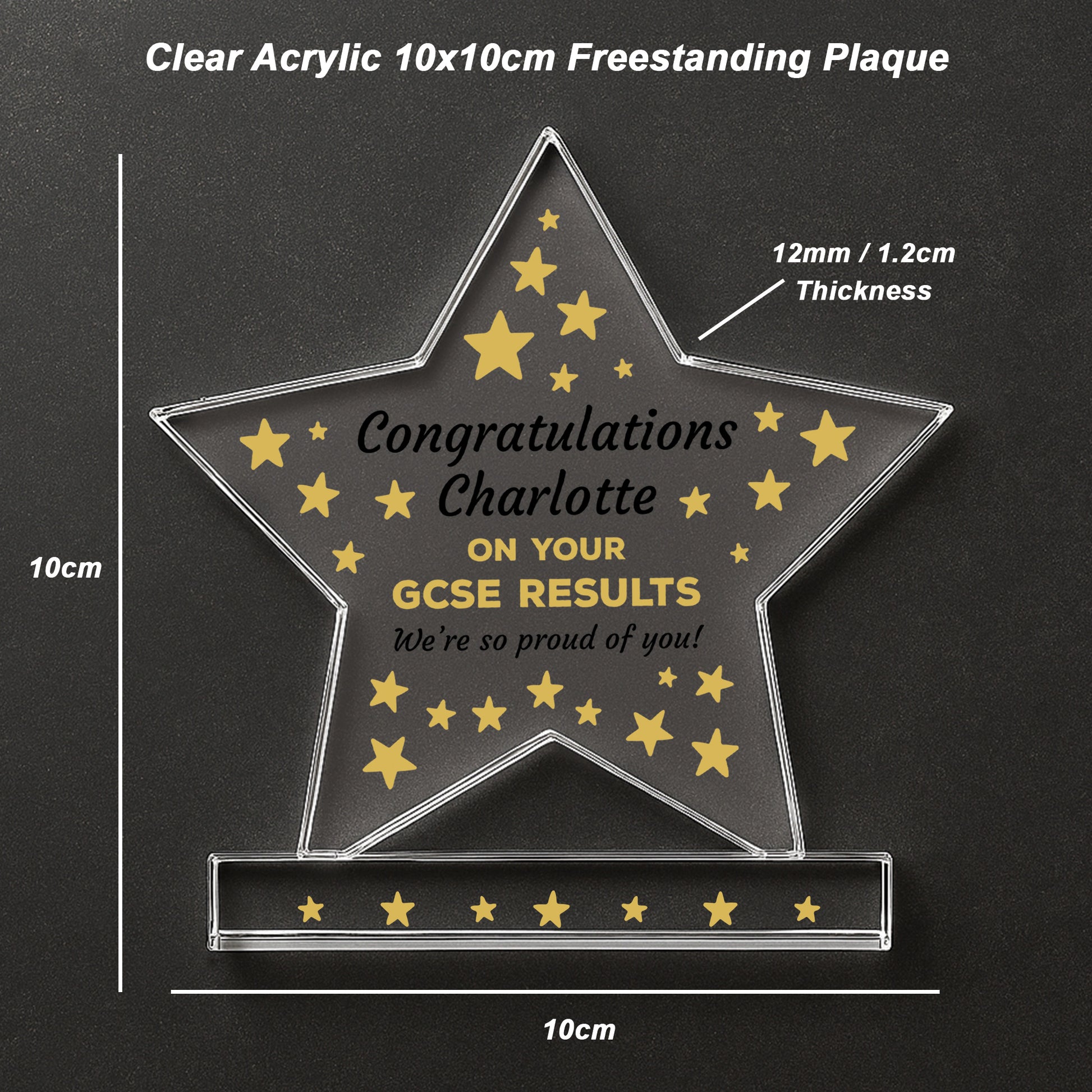 Celebrate a proud milestone with this elegant freestanding acrylic star plaque, congratulate a friend / family member on passing their GCSEs. Crafted from high quality acrylic, this piece measures 10cm by 10cm and stands confidently on its own thanks to a solid rectangular base. It's compact in size but full of sentiment, making it a perfect keepsake for graduates of all ages.