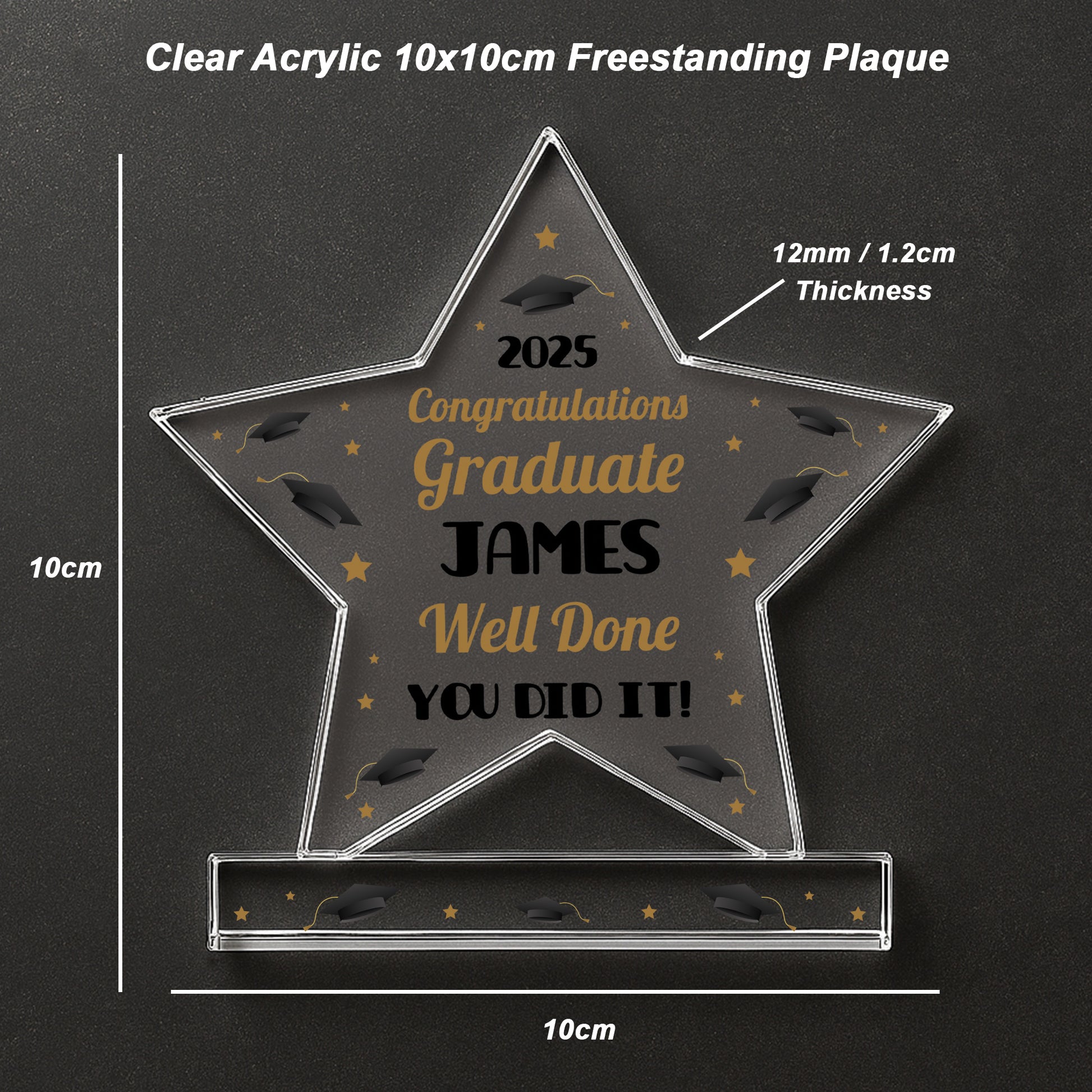 Celebrate a proud milestone with this elegant freestanding acrylic star plaque, designed to capture the spirit of graduation in a stylish and meaningful way. Crafted from high quality acrylic, this piece measures 10cm by 10cm and stands confidently on its own thanks to a solid rectangular base. It's compact in size but full of sentiment, making it a perfect keepsake for graduates of all ages.
