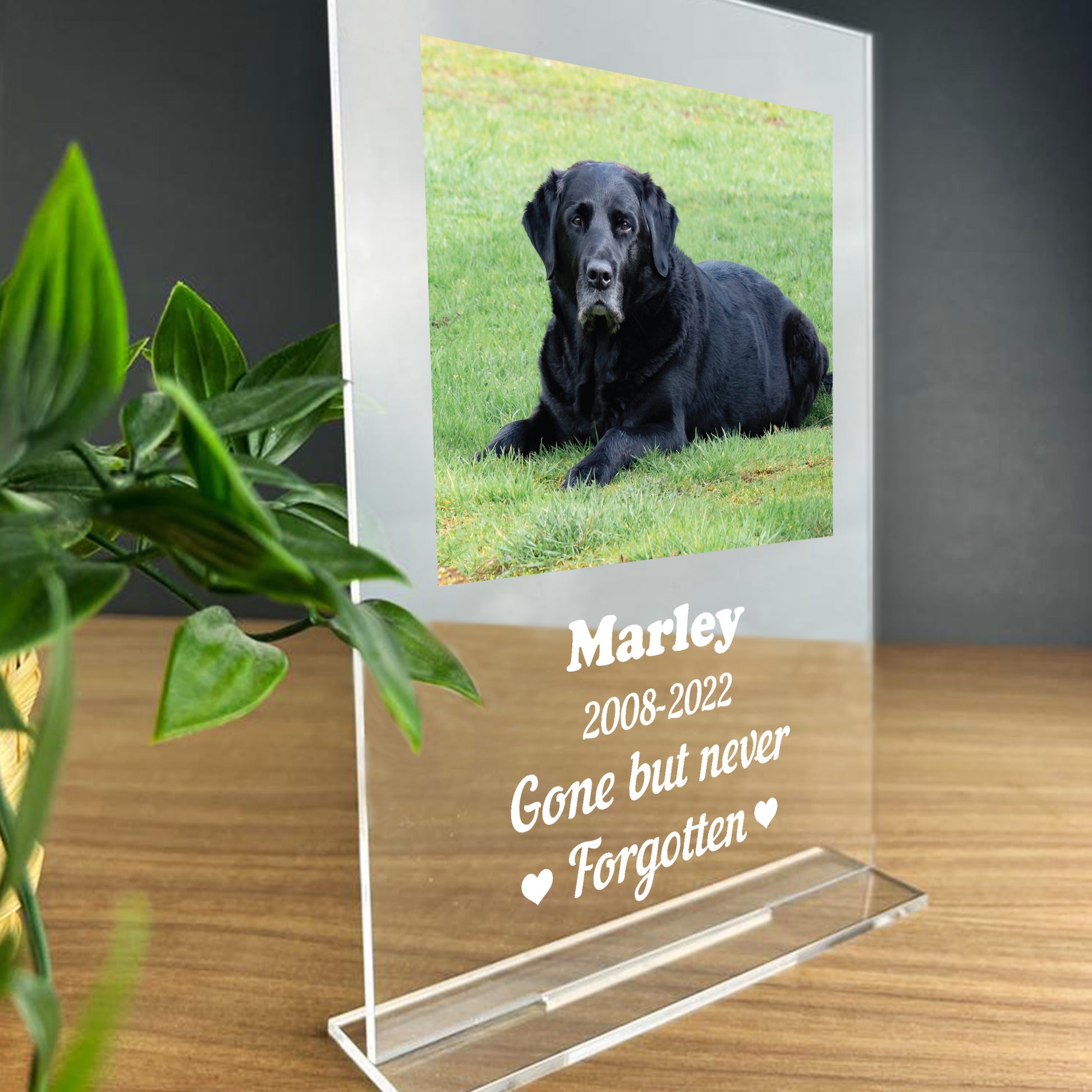 A Beautifully Printed A5 Personalised Clear Acrylic standing plaque with a photo / dog name / date of your choice. A beautiful way to remember a lost pet (Cat or Dog) and personalise it with the photo of your choice. A perfect sentimental gift to treasure in your home for years to come! This gorgeous plaque makes an amazing gift but is also a great gift anytime of the year. Supplied with a stand, a beautiful keepsake that will be treasured for years to come.