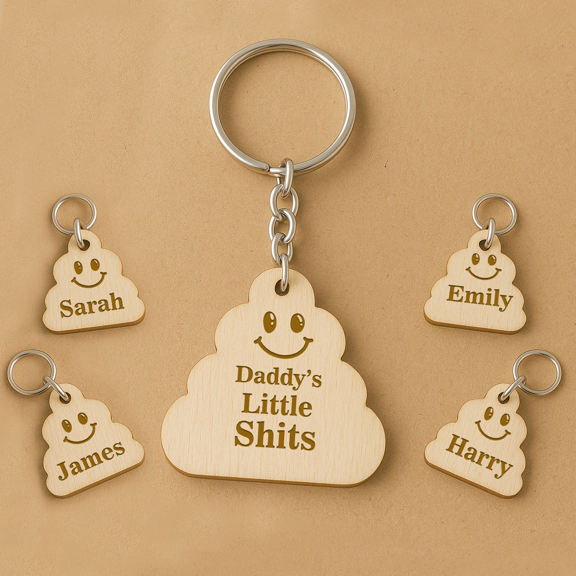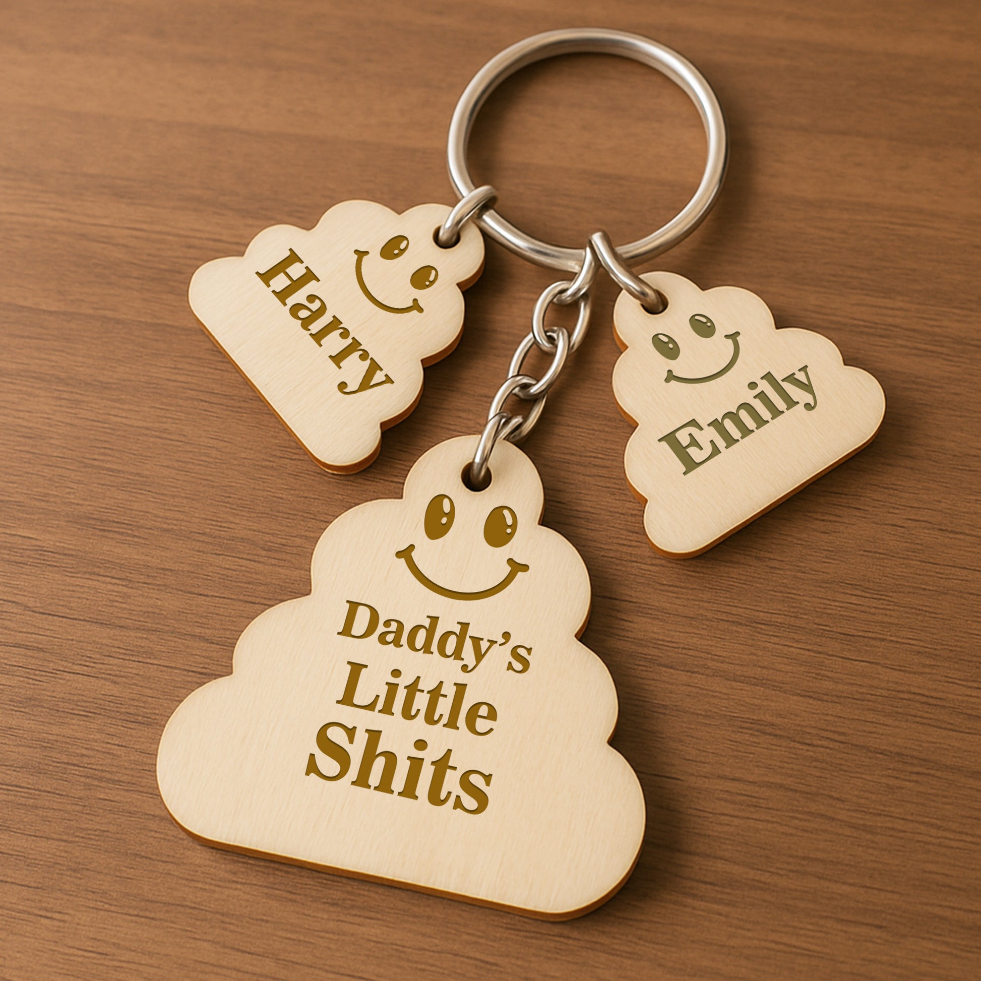 Each keyring features a larger central charm (5x5cm) and a selection of smaller charms (3x3cm), all cut in a playful shape and 3mm thick. The smaller charms are individually engraved with the children's names of your choice, adding a meaningful, personal touch.