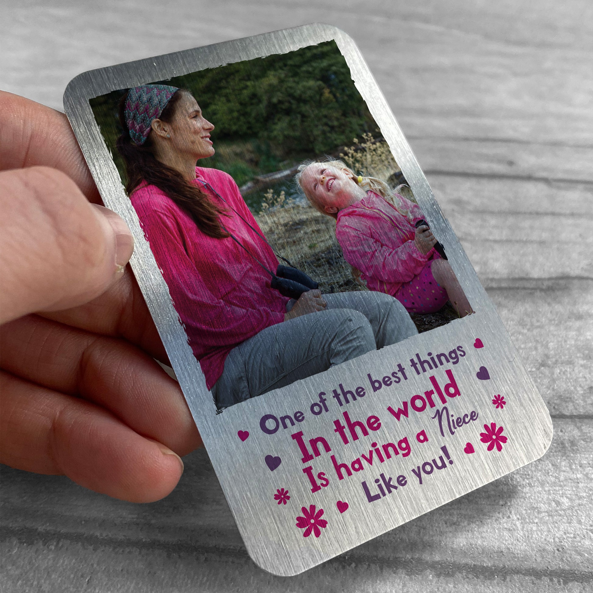 A beautifully printed metal wallet card with a personalised touch! A lovely keepsake and a quality alternative to just have a photo in your wallet! The keepsake gift to say let your Niece know just how much you love her! The perfect Birthday gift and is a gorgeous, quality keepsake that will last for many years! Express your love through a beautiful keepsake today!