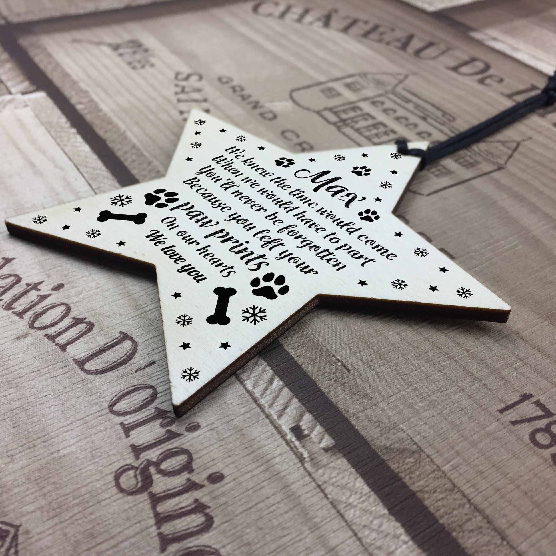 The hand crafted real wood star measures 10cm, is gift packaged and includes a variety of waxed cotton cord to hang. We've made these for replacing traditional greetings cards, placing in hampers or on the next of a bottle, or to even hang on a Christmas Tree. There are so many uses, you are sure to not be dissapointed. We have thousands of exclusive designs, with original verses, that touch the heart.