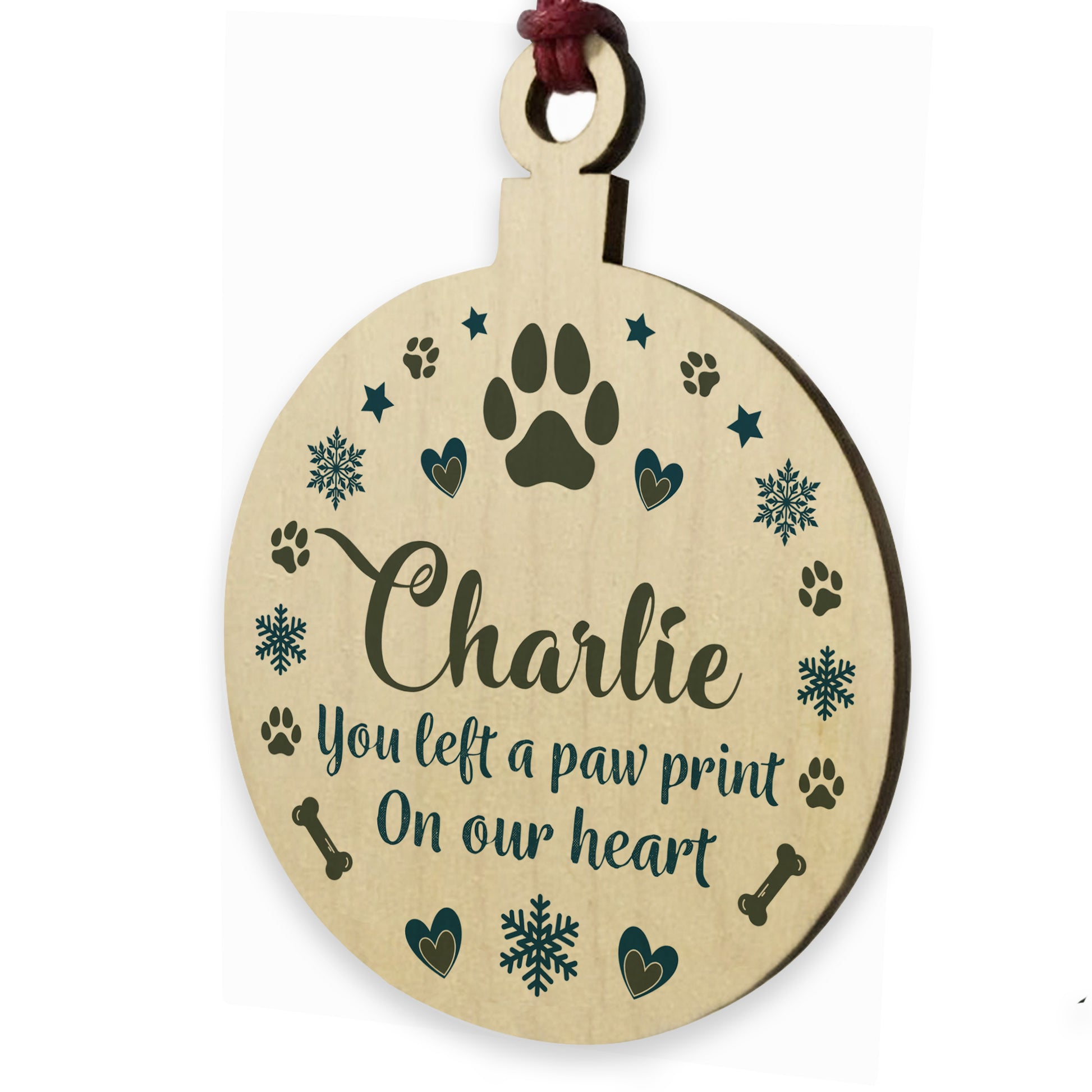 The bauble is made from real wood, and the design is permanently printed into the wood. The wooden bauble is supplied with waxed cotton rope in both black and red colours to allow easy hanging and looks great in any room of the house.