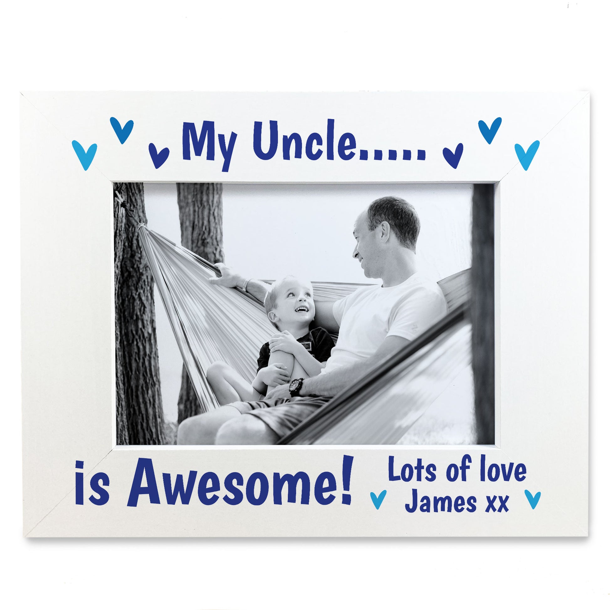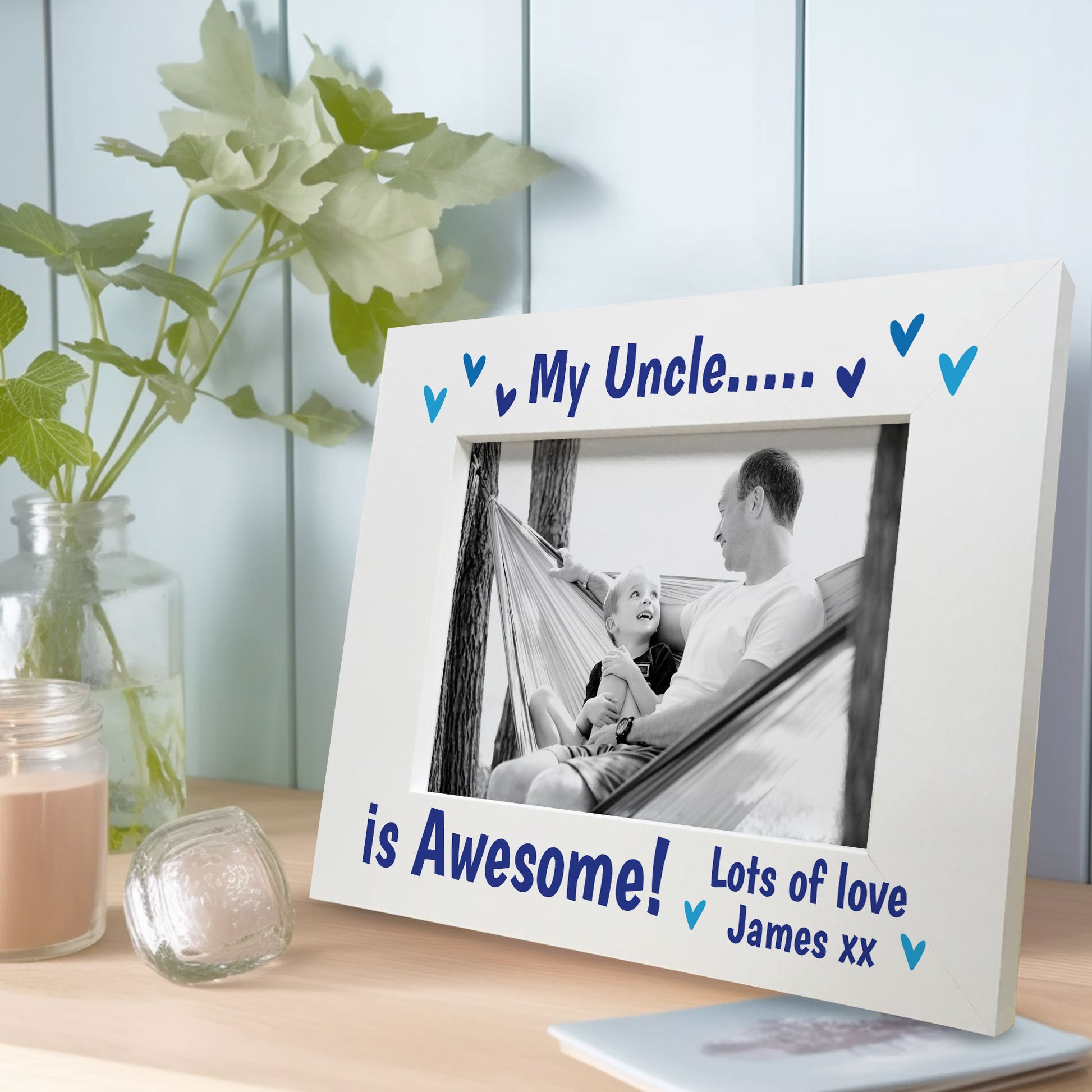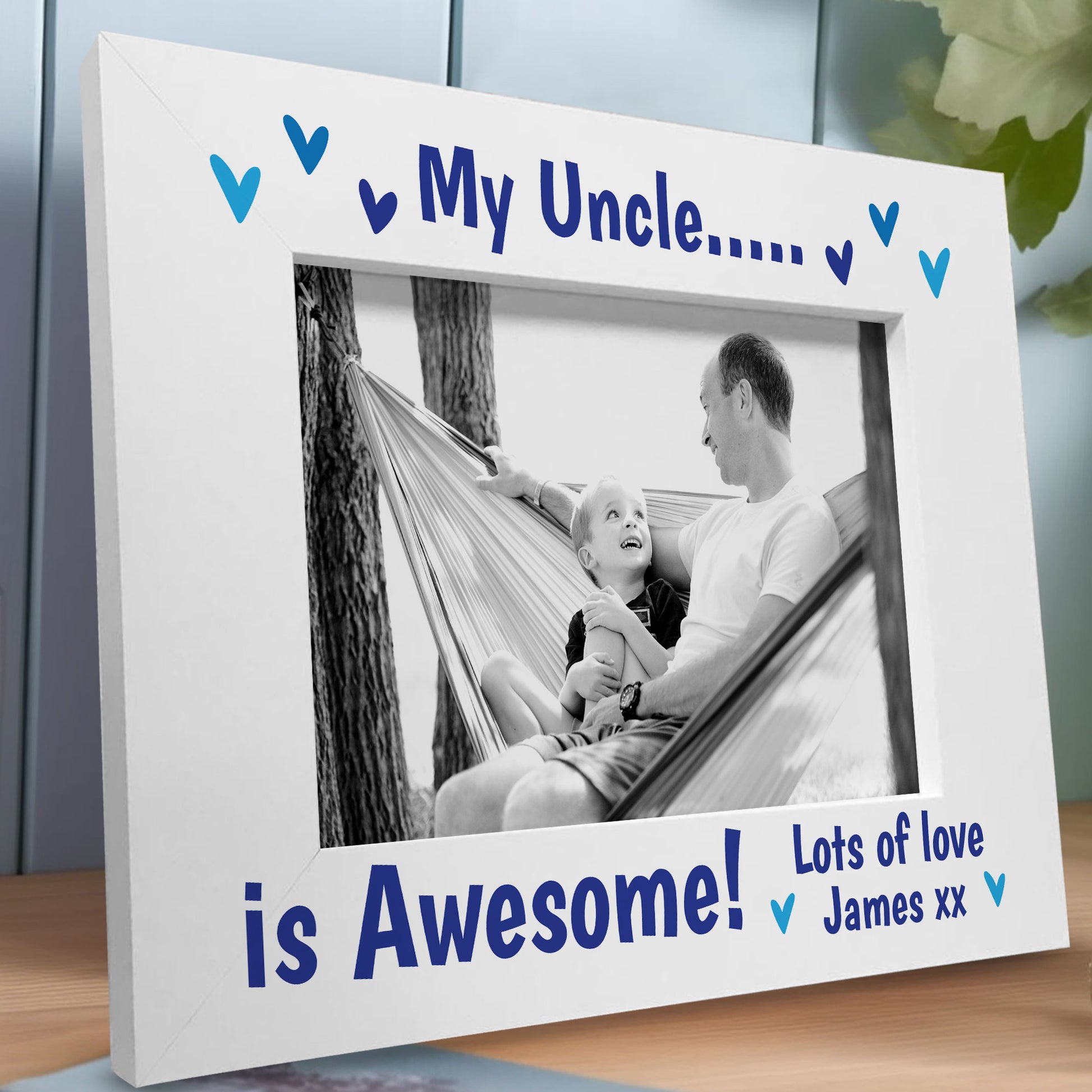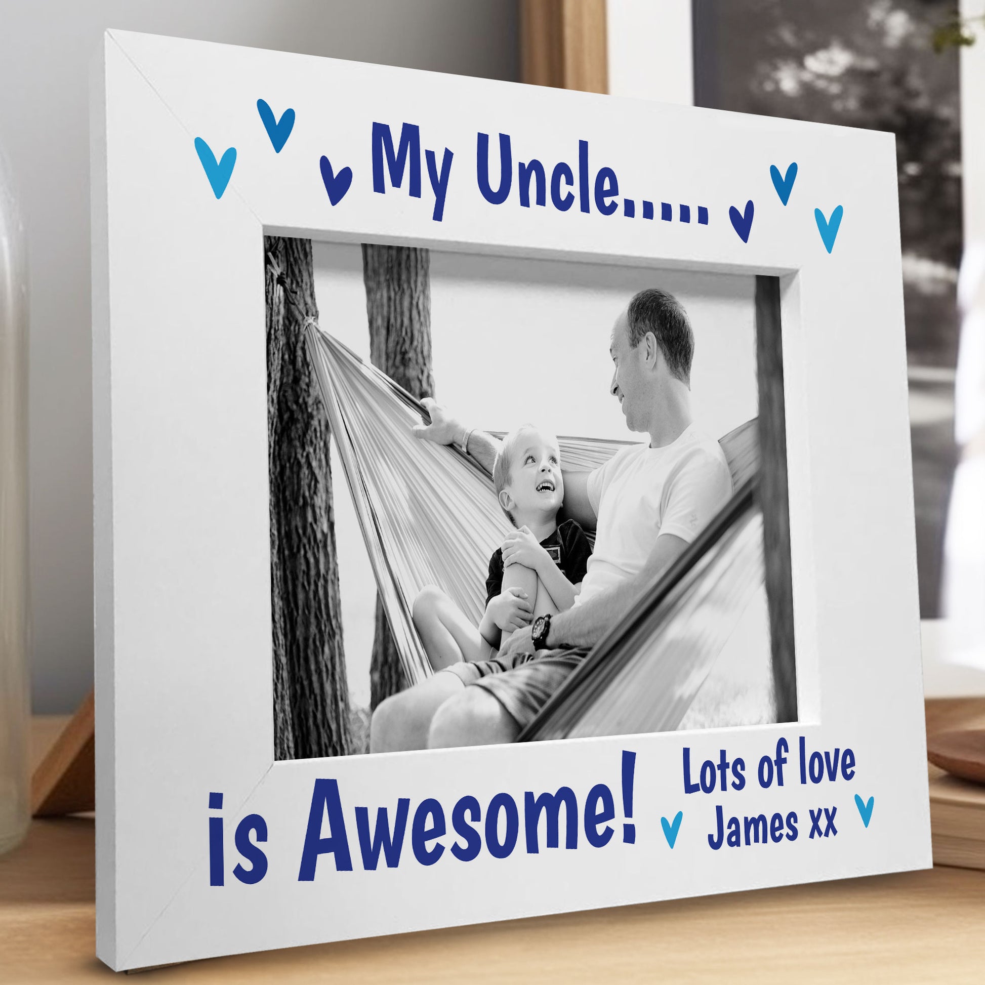 With its sturdy construction and elegant design, this white wooden frame is built to last and will withstand the test of time. It's a wonderful way to remind your Uncle every day how much you love him with this sat on the side for him to look at.