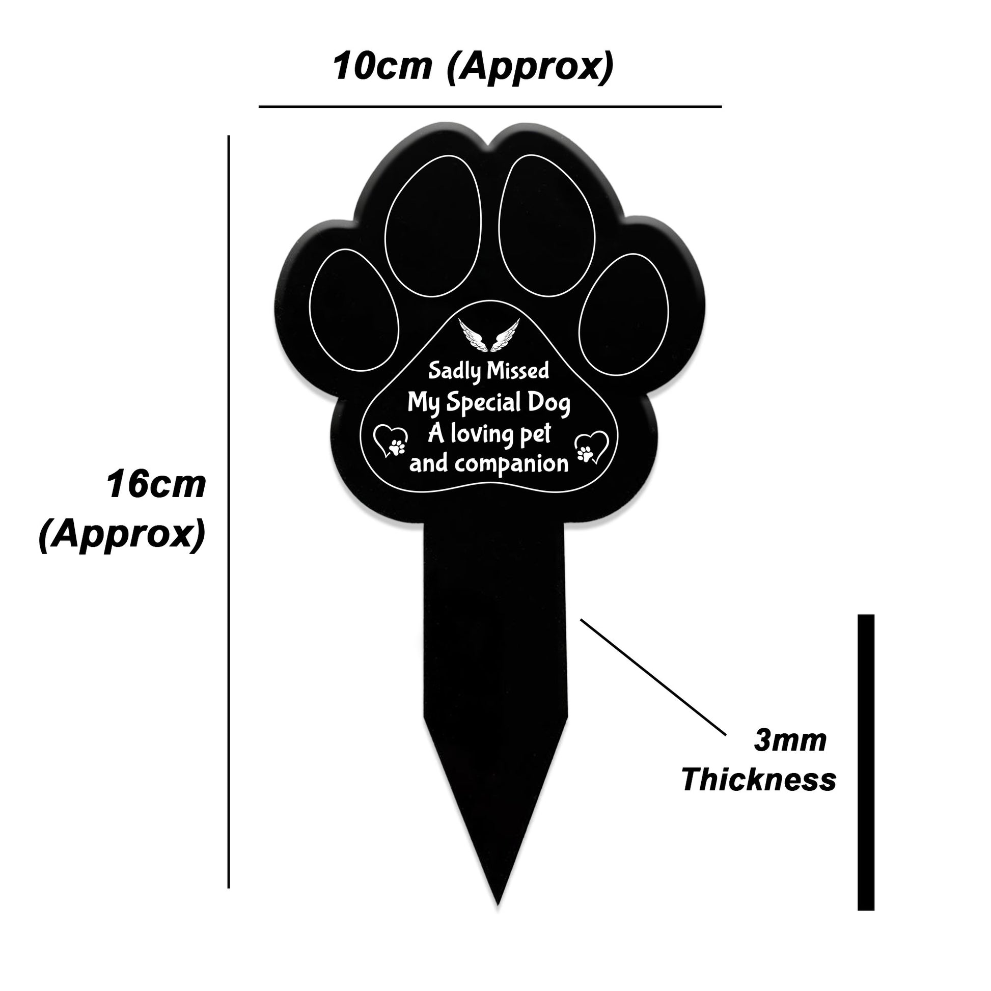 Honour your beloved furry friend with our beautifully crafted (16x10cm approx) Personalised Dog Memorial Paw Print Stake. Made from 3mm Black Acrylic making it a durable plaque that can be put in the garden / pet burial or graveside memorial. This touching tribute features your dogs name and years, it can also be customised with 4 photos, creating a heartfelt reminder of the joy they brought to your life. A beautiful sentimental pet loss gift that will be treasured for years to come.
