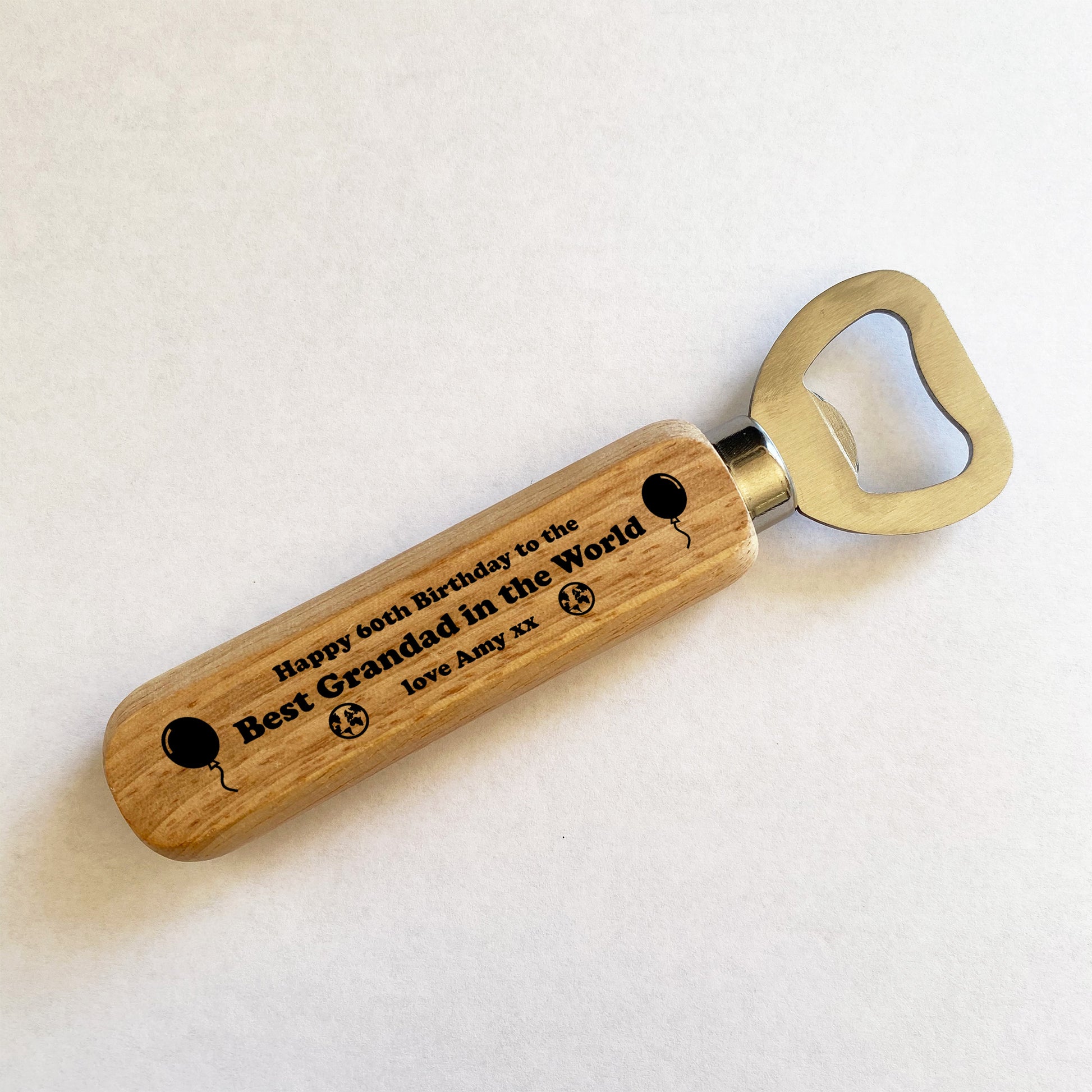 The bottle opener is made from high quality metal and wood, and the design is permanently printed into the wood on the handle and will last for many years.