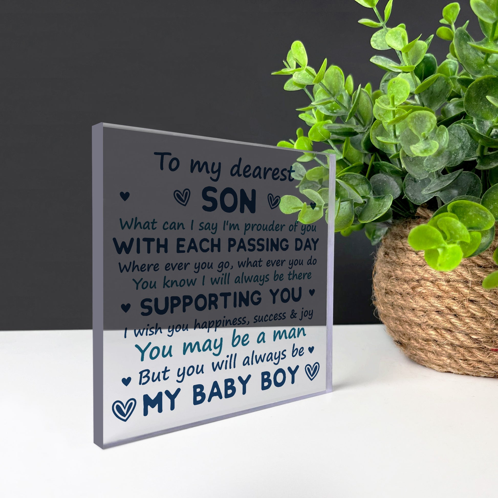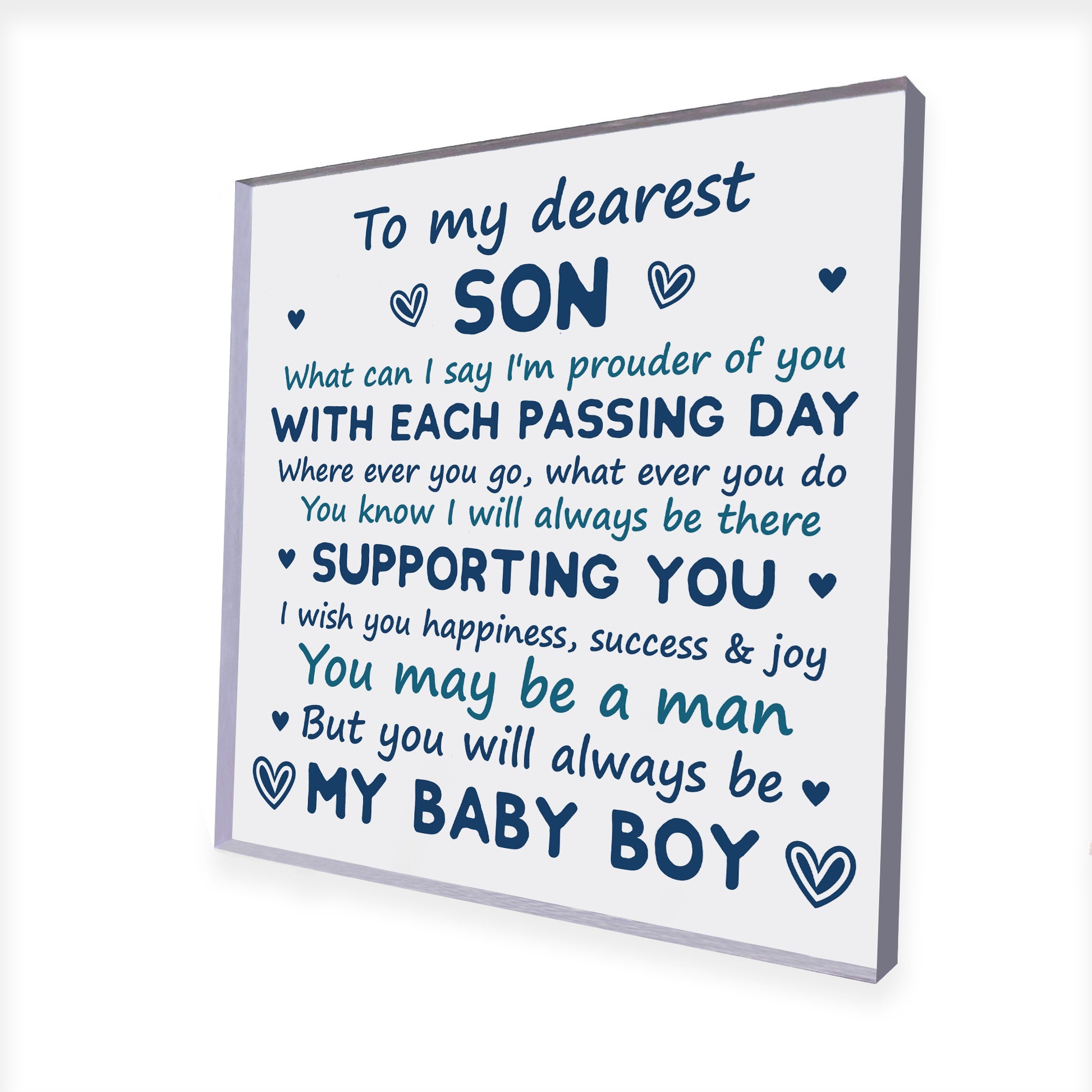 This beautiful keepsake acrylic plaque will be cherished by your Son! Each one is made with love by the dedicated