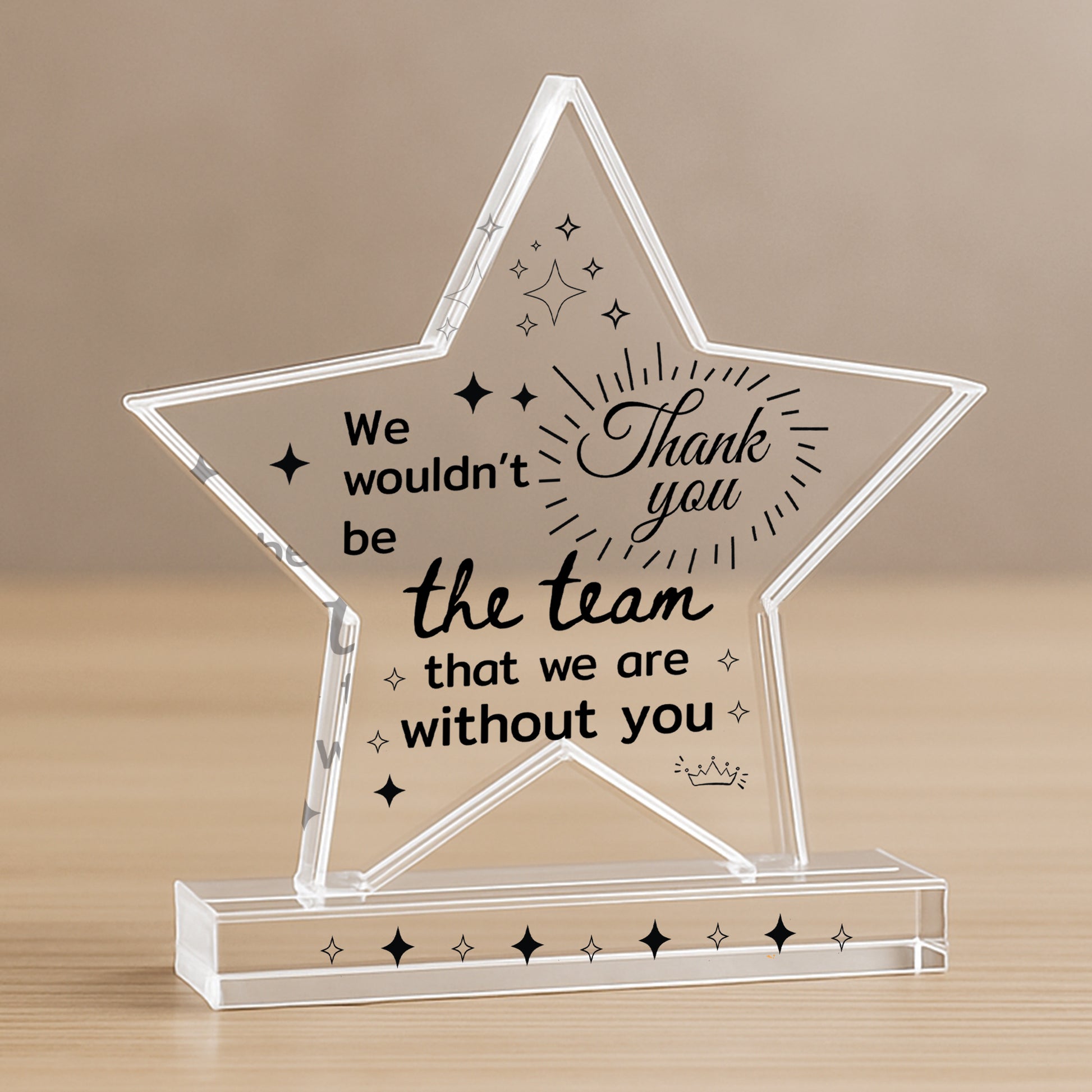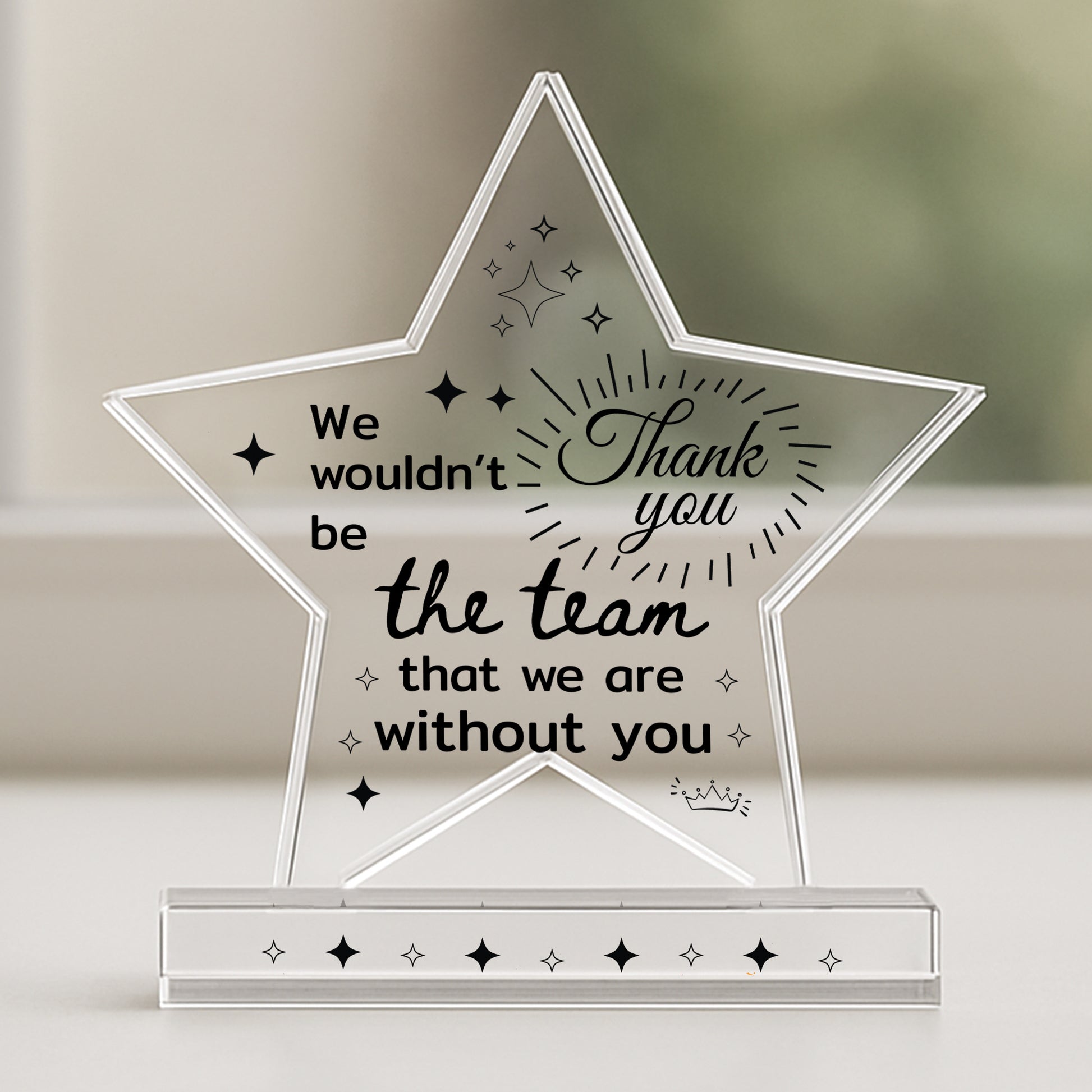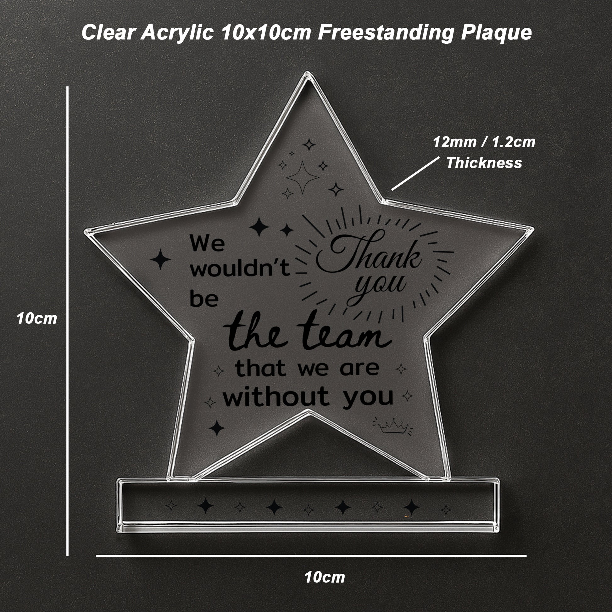 Celebrate someone special with this elegant freestanding acrylic star plaque, a heartfelt way to say thank you and recognise the joy, support and accomplishments they've brought to your life. Expertly crafted from premium, crystal-clear acrylic, this 10cm by 10cm plaque stands proudly on its own thanks to a solid rectangular base, making it a charming addition to any home or office space.