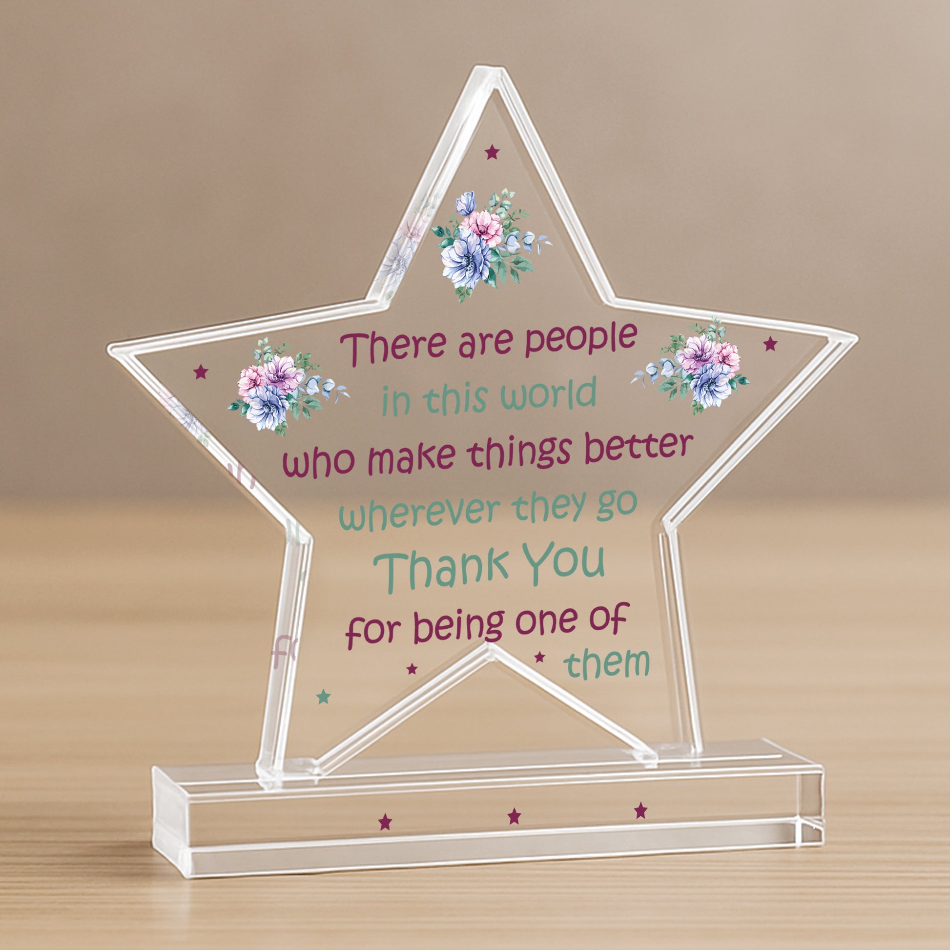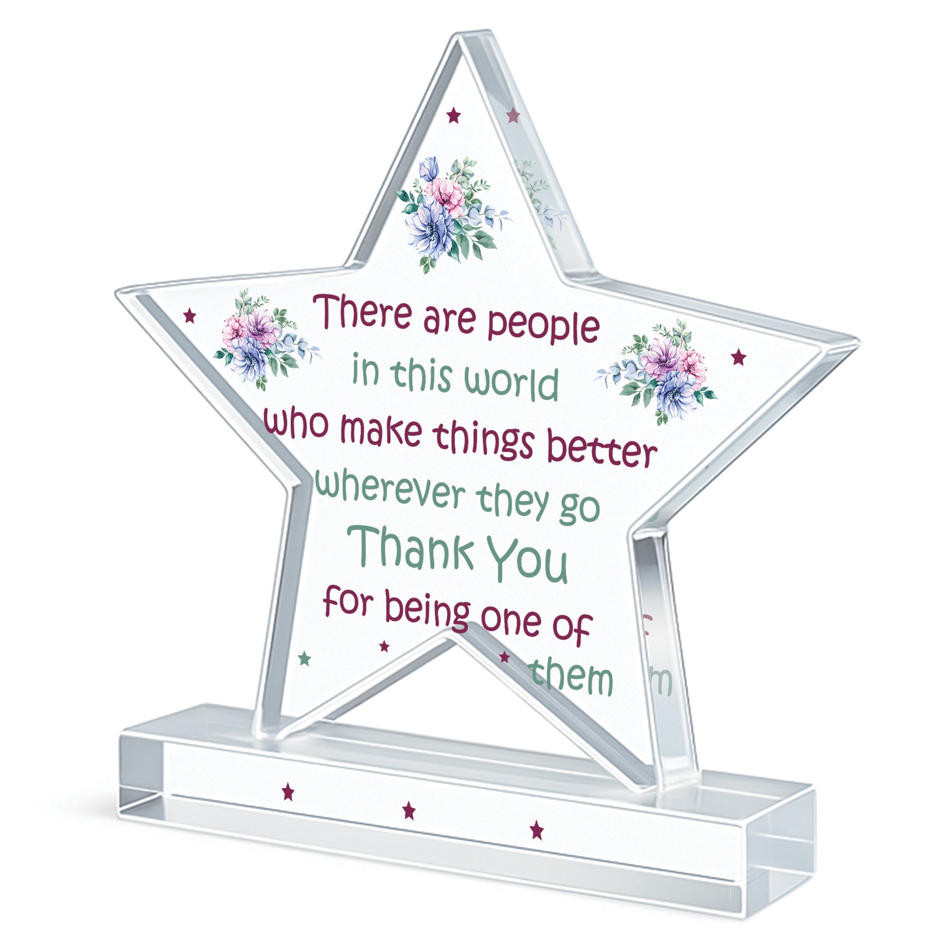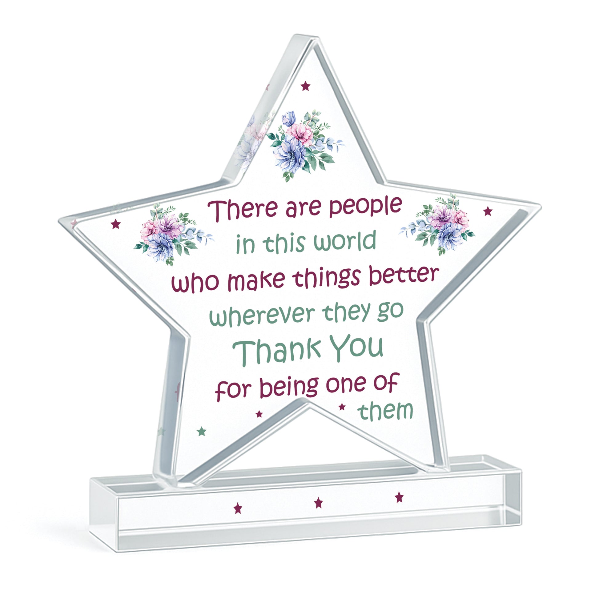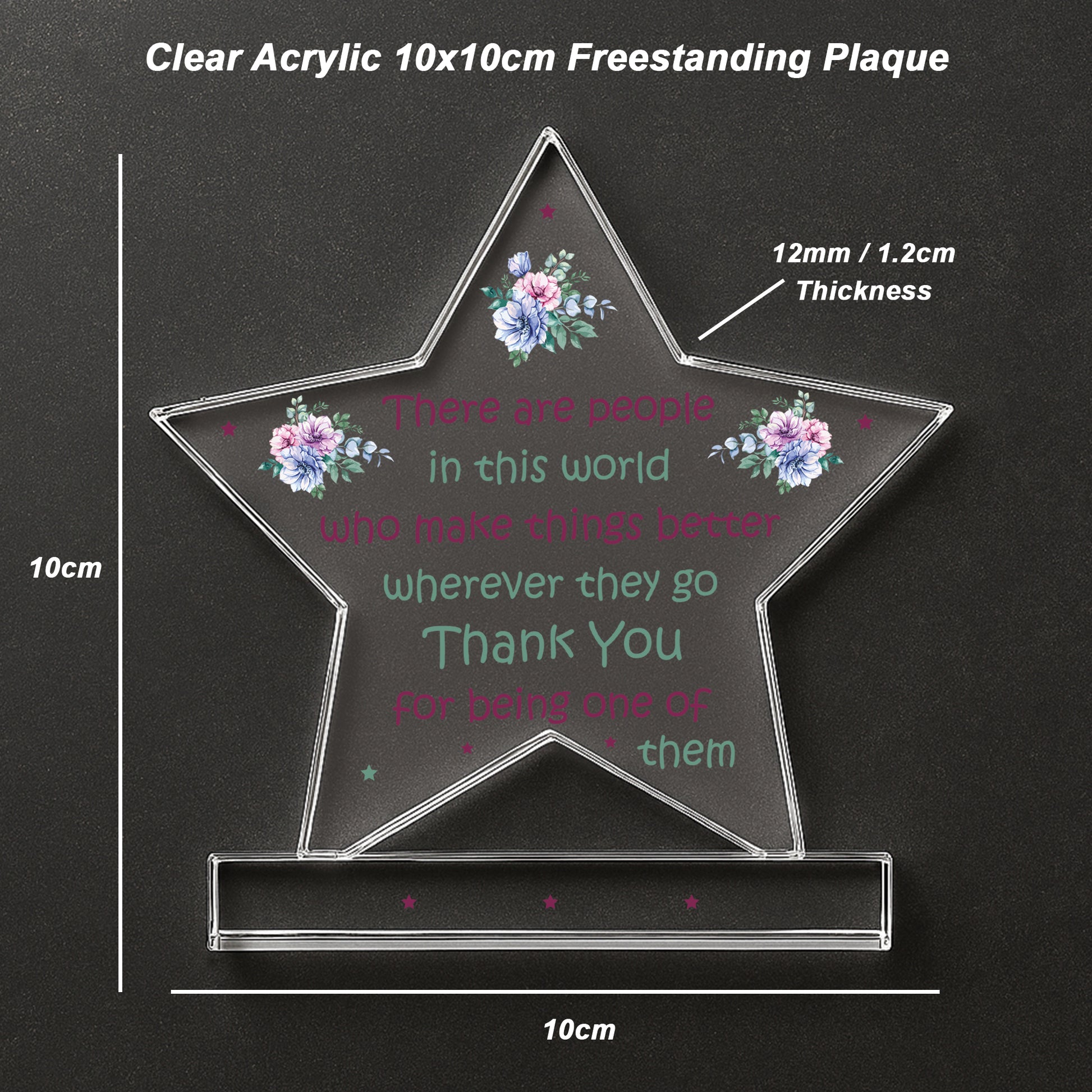 Celebrate someone special with this elegant freestanding acrylic star plaque, a heartfelt way to say thank you and recognise the joy, support and accomplishments they've brought to your life. Expertly crafted from premium, crystal-clear acrylic, this 10cm by 10cm plaque stands proudly on its own thanks to a solid rectangular base, making it a charming addition to any home or office space.