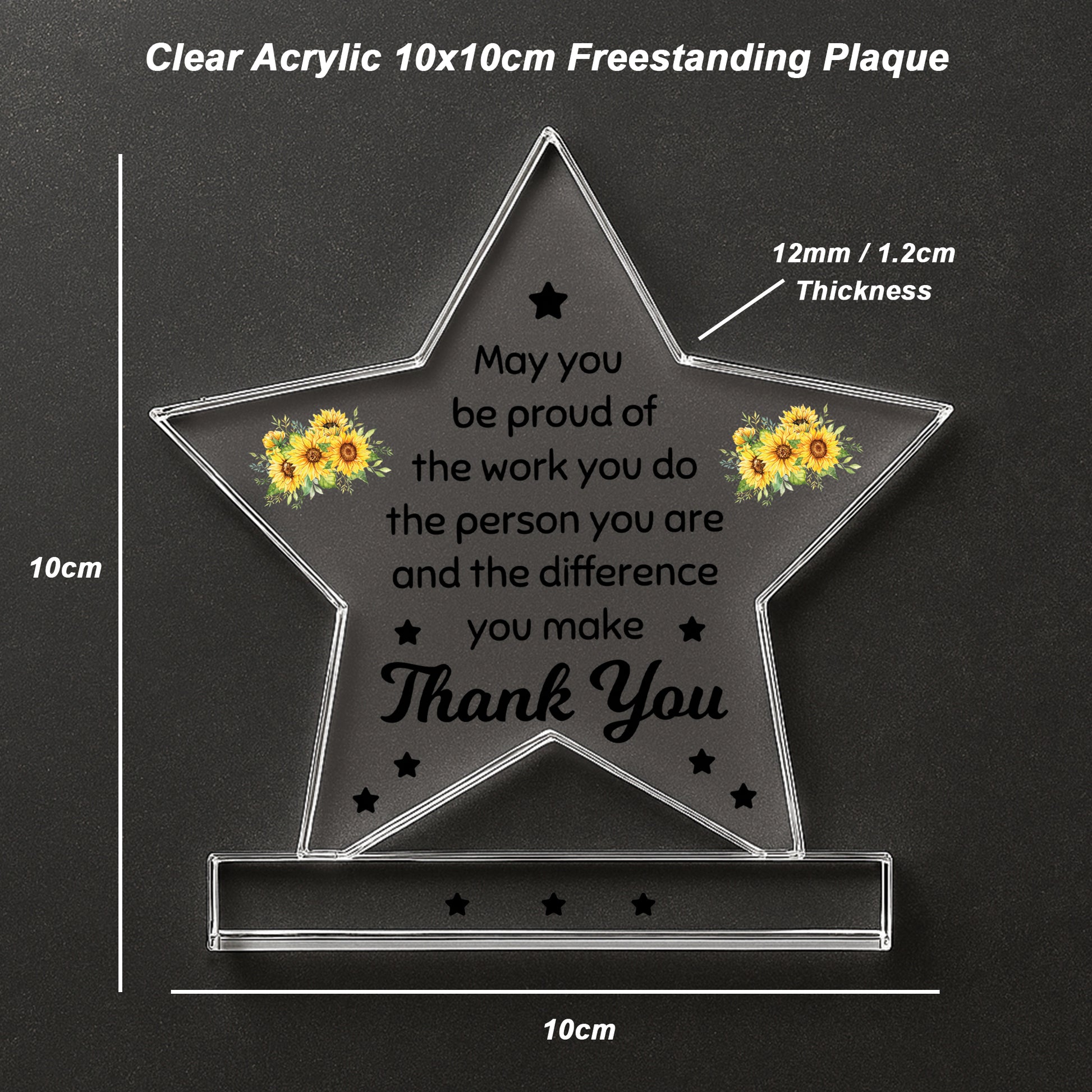 Celebrate someone special with this elegant freestanding acrylic star plaque, a heartfelt way to say thank you and recognise the joy, support and accomplishments they've brought to your life. Expertly crafted from premium, crystal-clear acrylic, this 10cm by 10cm plaque stands proudly on its own thanks to a solid rectangular base, making it a charming addition to any home or office space.