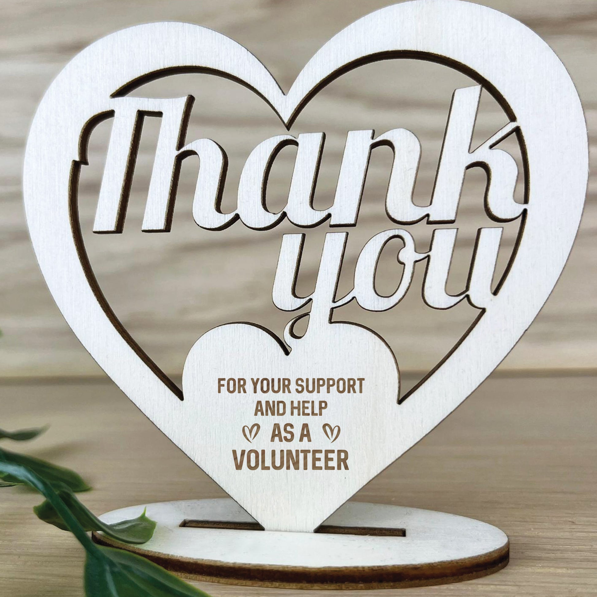 A gorgeous wooden heart standing plaque engraved with a beautiful thank