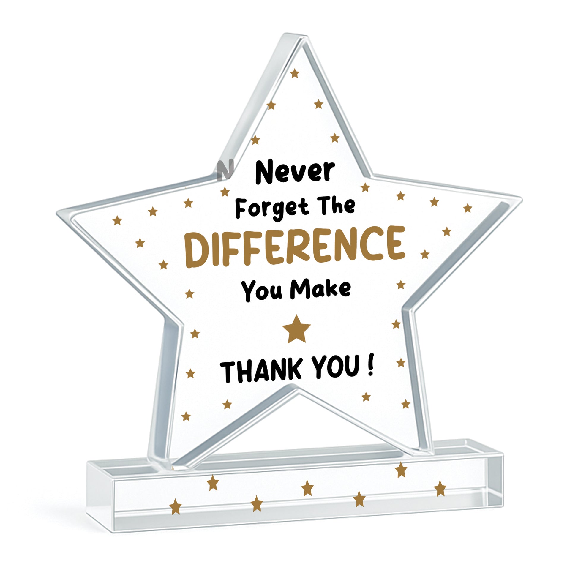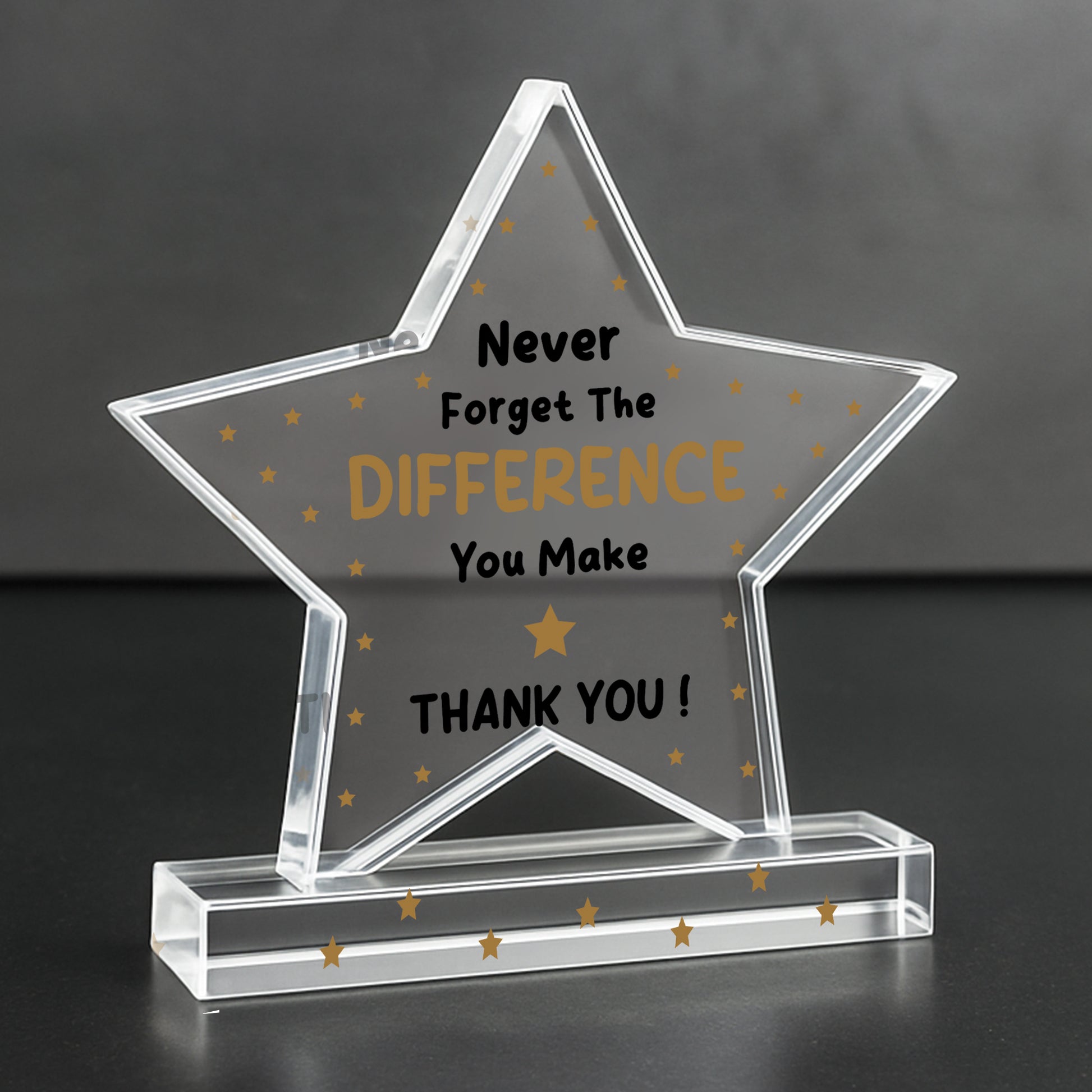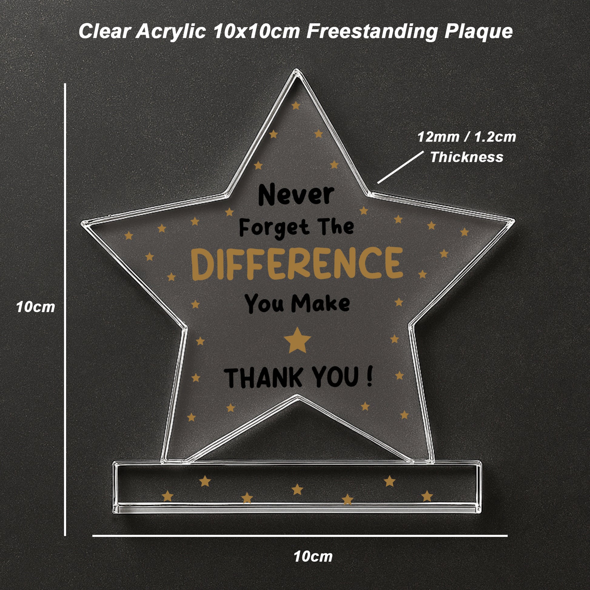 Celebrate someone special with this elegant freestanding acrylic star plaque, a heartfelt way to say thank you and recognise the joy, support and accomplishments they've brought to your life. Expertly crafted from premium, crystal-clear acrylic, this 10cm by 10cm plaque stands proudly on its own thanks to a solid rectangular base, making it a charming addition to any home or office space.