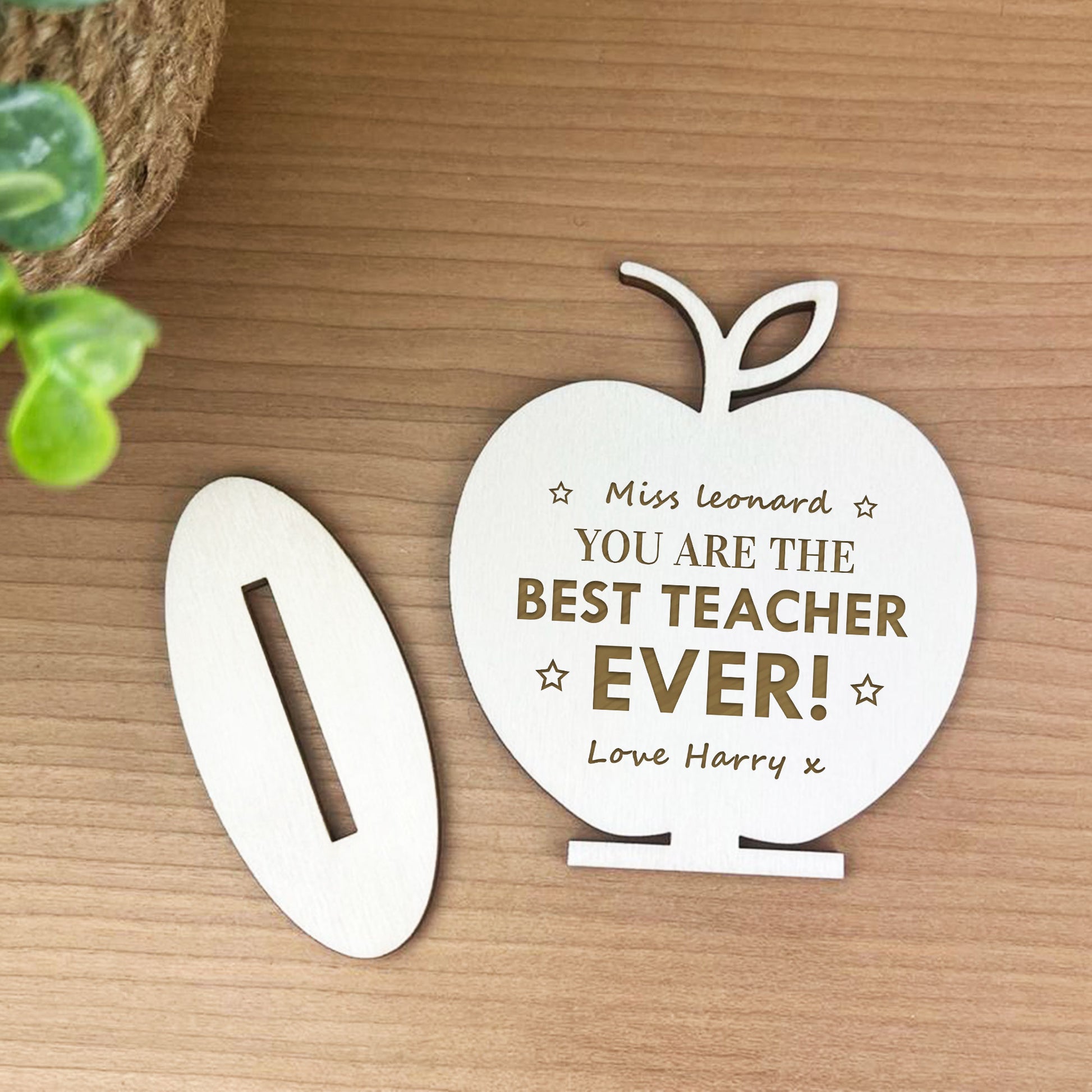 A gorgeous personalised wooden apple standing plaque engraved with a