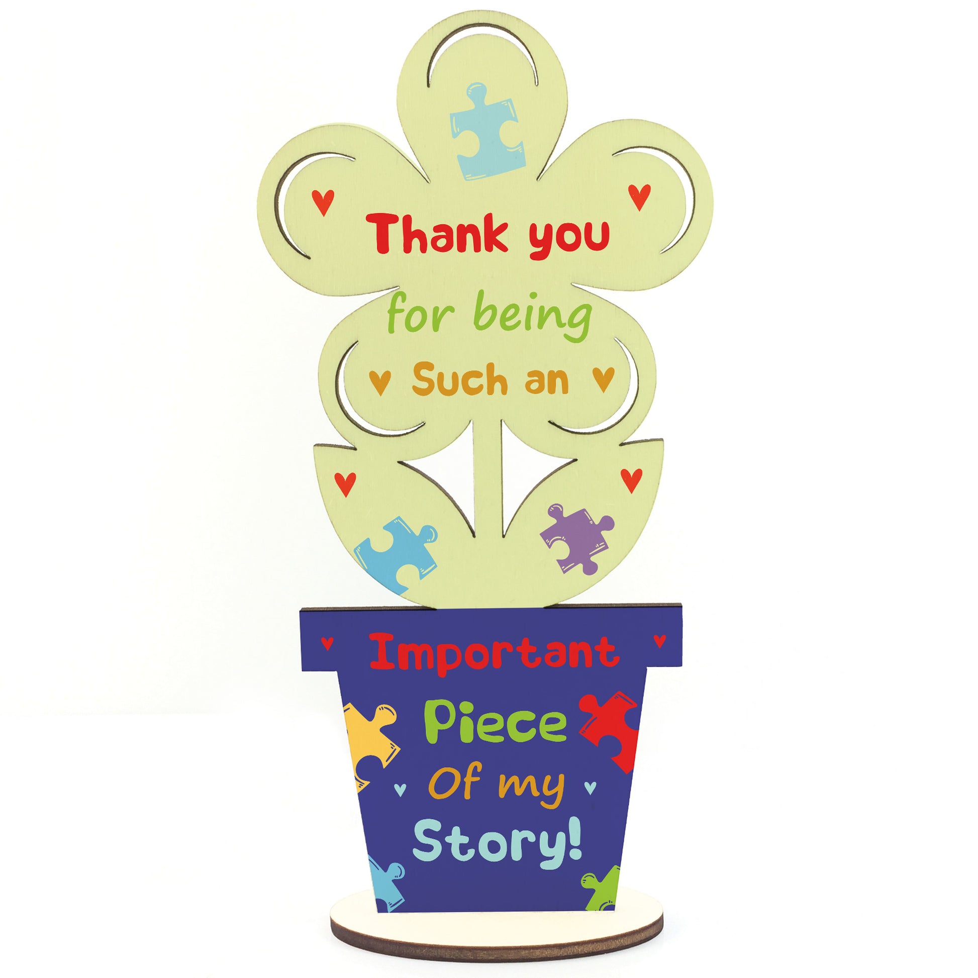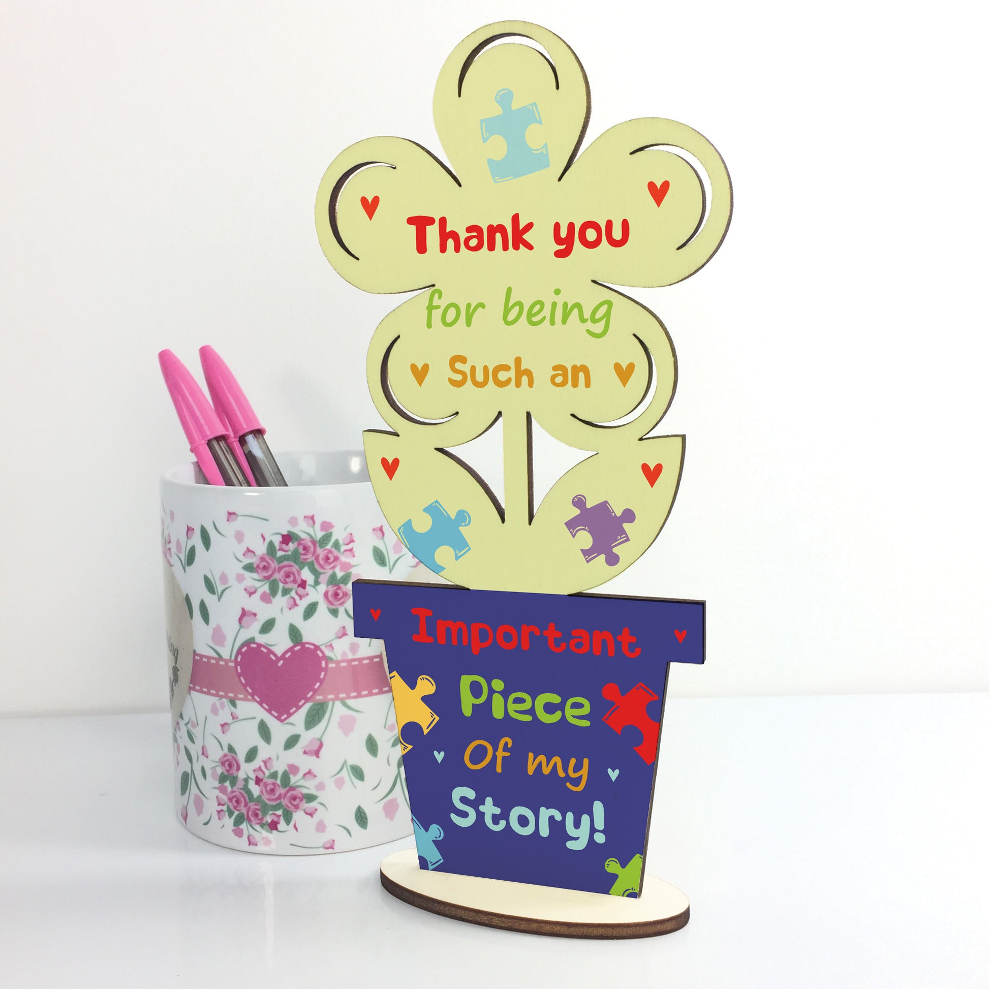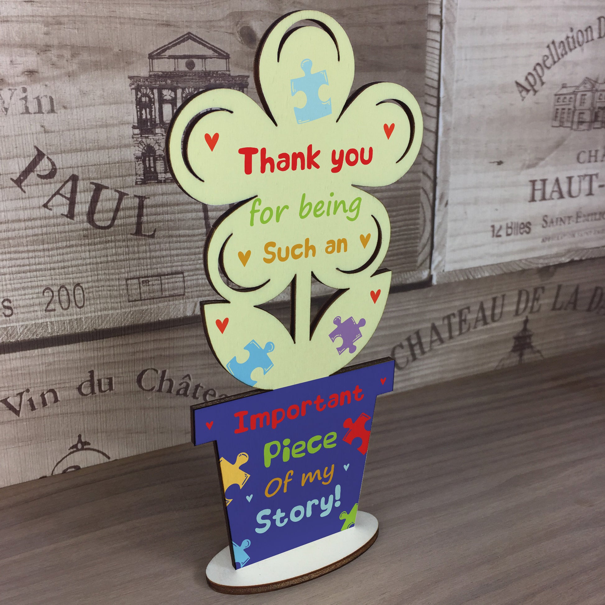 A beautiful wooden freestanding flower printed with a heartfelt thank