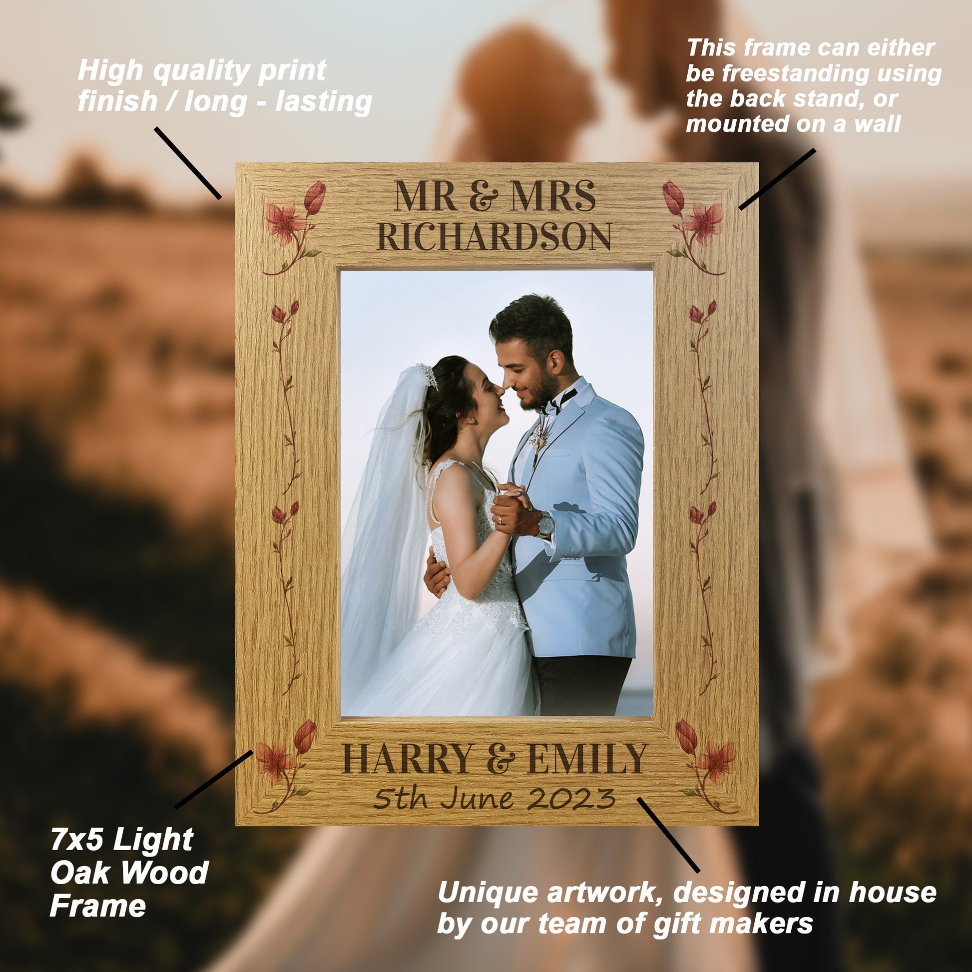 Celebrate the special day with a beautifully crafted Personalised Wedding Gift Set, a perfect keepsake for the newlyweds. This elegant set includes a 7x5 wooden oak frame, ideal for displaying a cherished wedding photo, and a personalised wooden hanging heart, customised with the couple's surname, names, and wedding date.